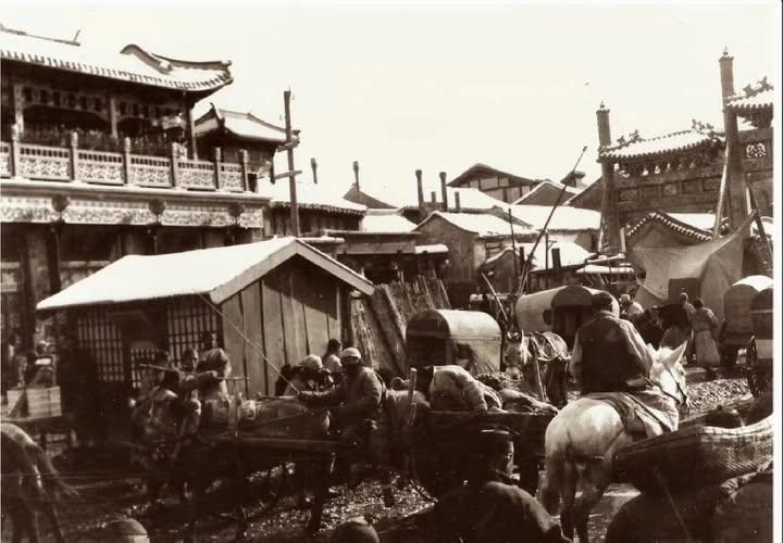 这张照片定格了清末雨后的城市街头,精美的中式建筑与牌坊雕梁画栋,尽显传统工艺的精湛;街上马车、行人穿梭往来,却被泥泞的路面困住 —— 行人深一脚浅一脚,车马在泥地里艰难挪动,与建筑的精致形成鲜明反差。 清末北京城多数街道为土路,遇风扬尘、遇雨积水,阻碍交通与生活。嘉庆年间《燕京杂记》记载“天晴时则沙深埋足,尘细扑面;阴雨则污泥满道,臭气蒸天”,可见当时道路环境之差。