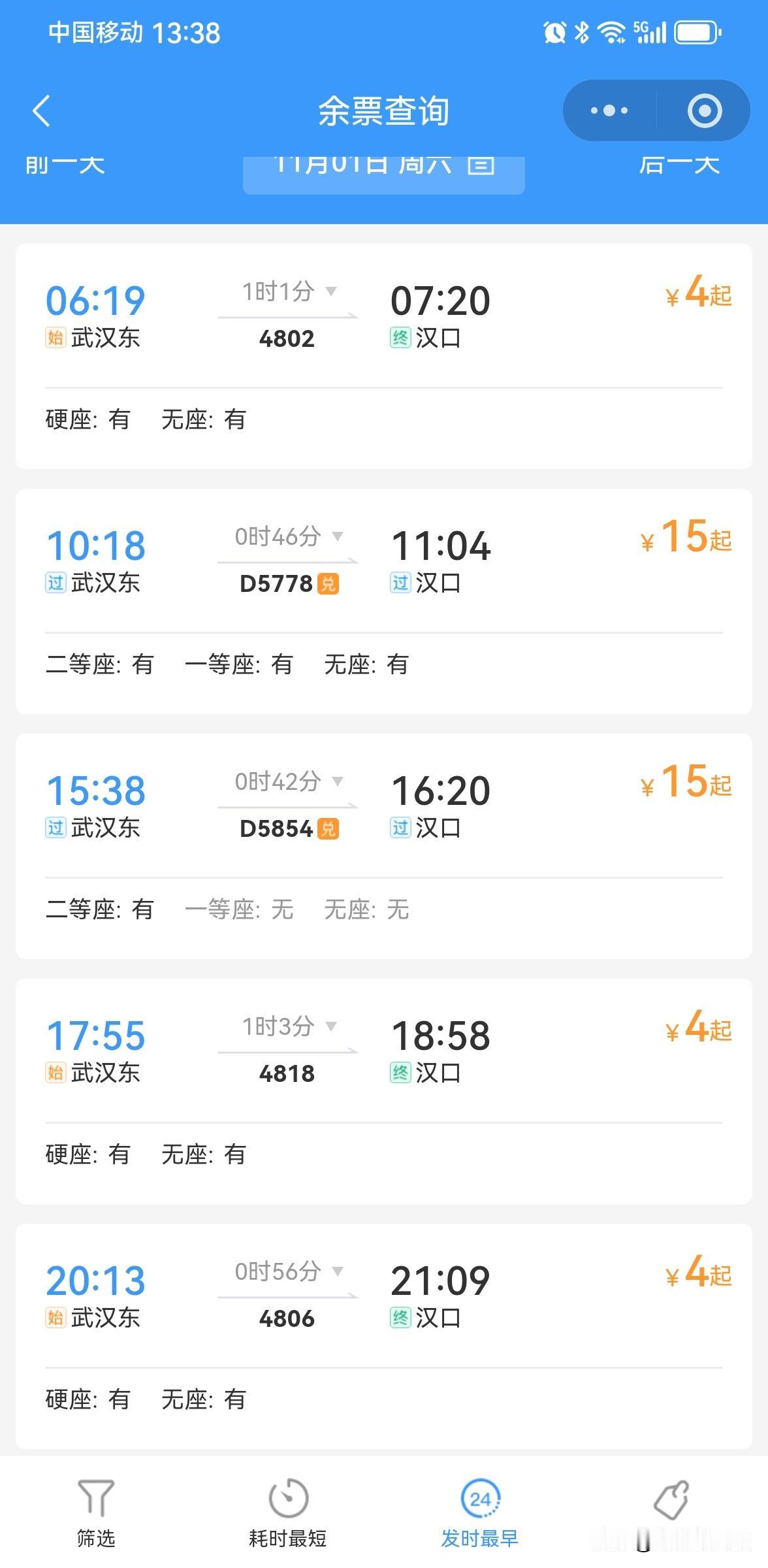 住汉口站,武昌站附近在光谷打工的🐮🐴有福了,4块钱比地铁都便宜很多啊!虽说时间有点久!但是和地铁也差不多!停靠了武昌火车站,时间点都很好。下了车🐮🐴也还有足够的时间去转乘地铁2号线和11号线到光谷东以及金融港等地! 哎呀妈呀,不得不说,这简直就是为打工的🐮🐴专门定制的列车!那么会有很多人乘坐吗?希望能在乘车手续方面简化一下,能够非常方便的话,我想还是有人坐的,毕竟早高峰的2号线不是能让你坐着!让我们拭目以待!武汉 汉口火车站