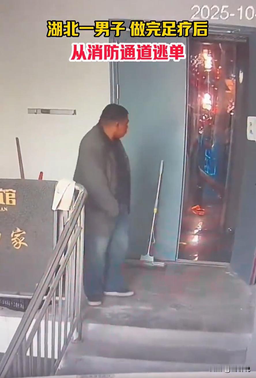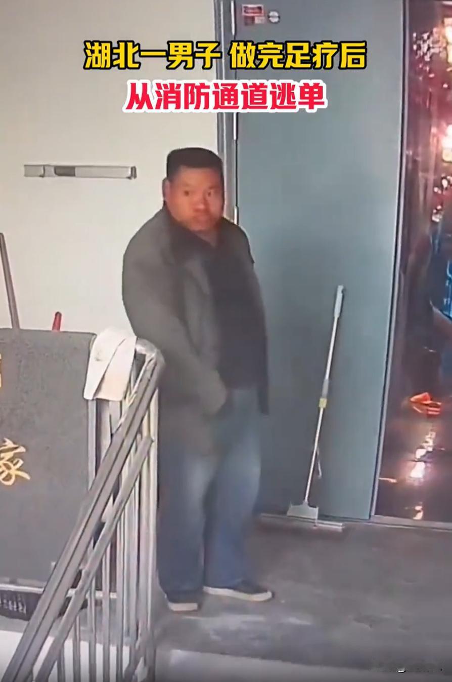 湖北,一男子去足疗店做按摩,进店后就直奔二楼包间,没成想,按摩结束后,竟然趁别人不注意,通过消防通道从后门逃走了,不过整个过程却被监控拍下来,还被老板发到了网上,让他火了一把 监控中,男子的行为看上去有些喜感,先是从后门探出头,看看周围有没有人,发现前后左右都没有人,这才小心翼翼的走出来,而在下楼梯时,也是一步一回头,时刻不忘用睿智的眼神盯着后面有没有人追上来,可他不知道的是,这一切都是在掩耳盗铃,因为头顶就是监控 事后,老板表示,男子当天一共消费了200块,想想最后也就算了,没有选择报警 不过虽然没有追究他的法律责任,却把整个过程发到了网上,这下全国网友都认识他了,也不知道回到家,亲戚邻居看到这一幕他会不会后悔当时的所作所为 对此,有网友用当下最流行的网络热梗进行调侃: 走前门:从从容容,游刃有余!走后门:匆匆忙忙,连滚带爬! 确实如此,现在的监控哪儿没有?连便利店都能清楚看到你打哈欠的表情。想靠一点小手段“省钱”,结果丢的往往更大 有时候,做人最大的聪明,就是不耍小聪明。真要说“智商在线”,那就用点心思在好好生活上,毕竟,走前门的那种从容,才是真正的体面