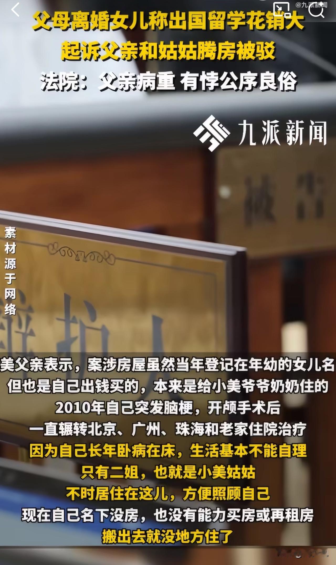 留学生起诉病重父亲腾房!房子是父亲所买,法院判决引热议! 珠海一留学生小美,为凑留学和深造费用,将病重父亲及姑姑告上法庭,要求腾退登记在自己名下的房子。 原来,这套房是2008年小美父母所买,2010年登记在6岁的她名下。2013年父母离婚后,小美随母亲生活,与父亲日渐疏远。父亲2010年突发脑梗,开颅手术后生活无法自理,全靠姑姑照料,二人一直住这套房,父亲名下无其他房产,也无能力另行租房。小美多次协商腾房无果后起诉,称房子登记在自己名下,应归自己支配。 针对此情况,法院审理后驳回诉求,认为小美幼时获赠房屋基于亲子关系,如今仅以产权登记要求病重父亲腾房,既不符合权利义务对等原则,也违背赡养父亲的法定义务和公序良俗。 此判罚曝光后,网友看法不一。有网友说,“父亲买的房登记给她,自己病重却被赶,这女儿太凉薄了。” 也有指责道,“赡养老人是义务,不能只想着自己的利益,法院判得对!” 还有网友表示,“就算有经济压力,也该想别的办法,起诉病重父亲实在说不过去。” 这事看下来,周少觉得房子虽登记在小美名下,但本质是父母的关爱馈赠。父亲病重无依无靠,作为女儿不仅不赡养,反而索要住房,既违背法律义务,也伤了亲情。 法院的判决守住了公序良俗的底线,也提醒所有人:亲情不是利益交换,赡养父母是刻在骨子里的责任,不能被功利心冲淡。 对于这样的事情,大家怎么看呢?#寻美三湘# #长沙新朋友#