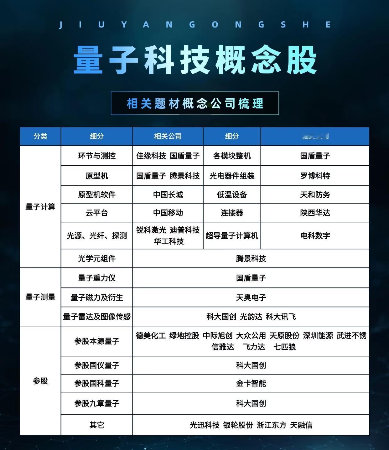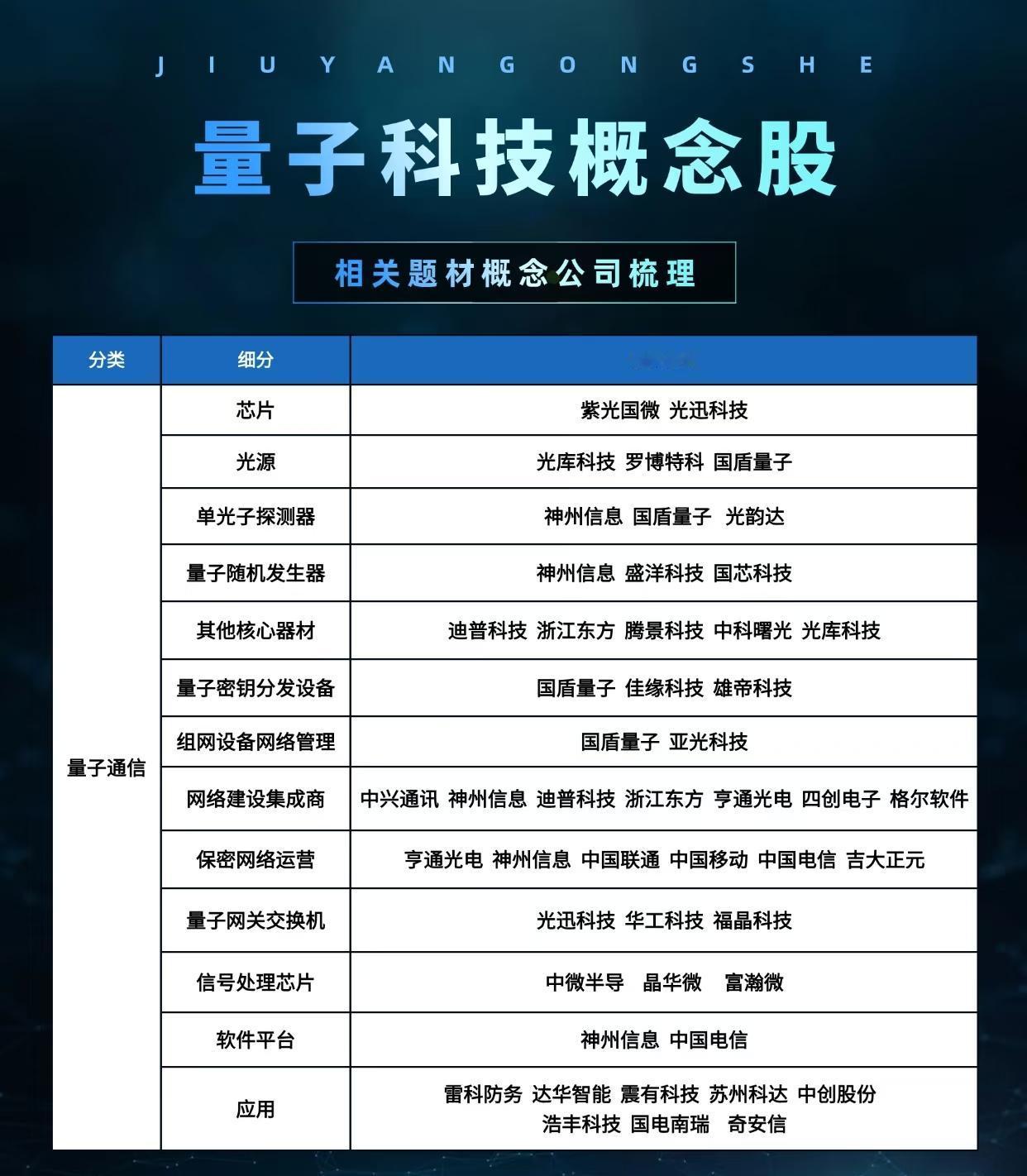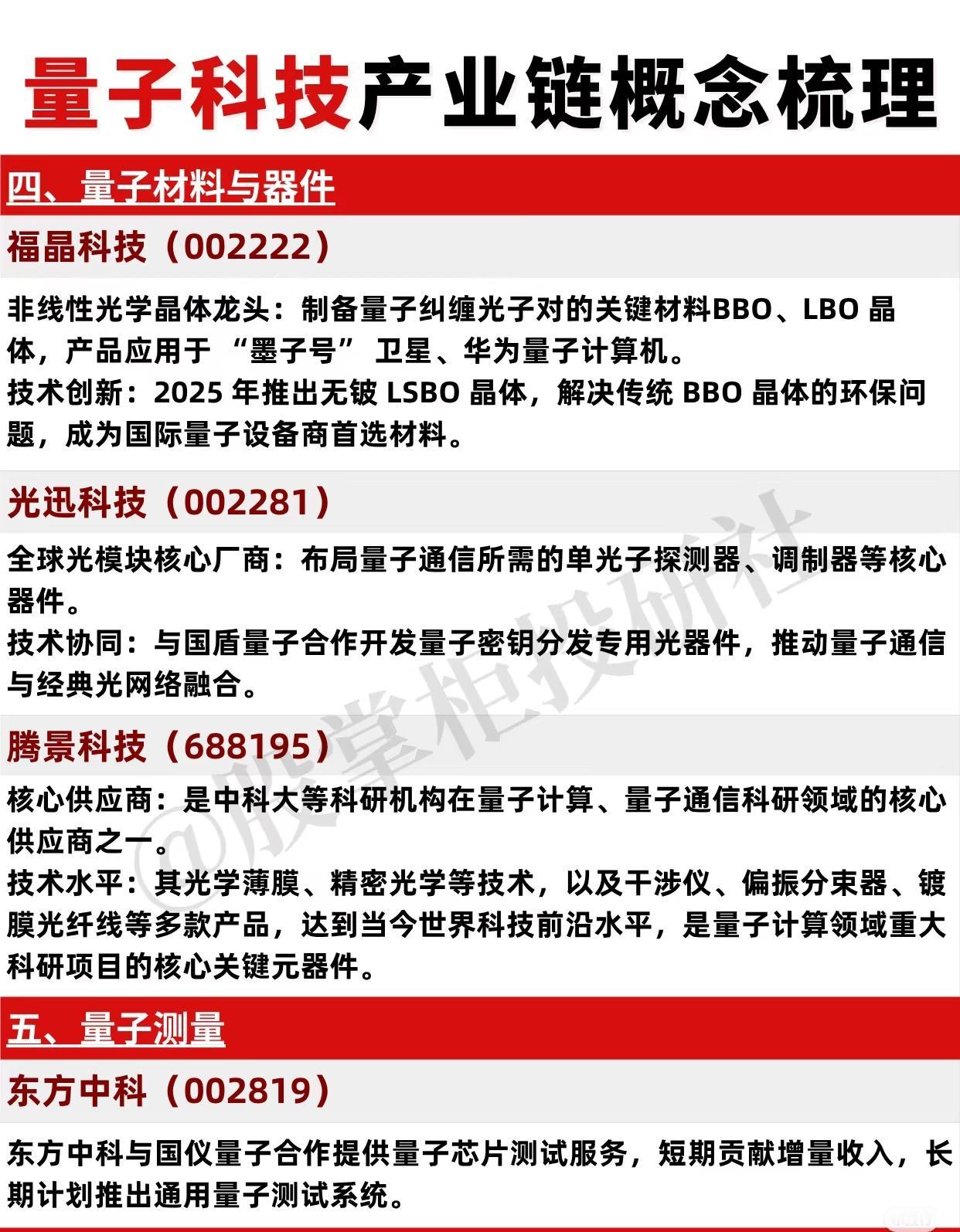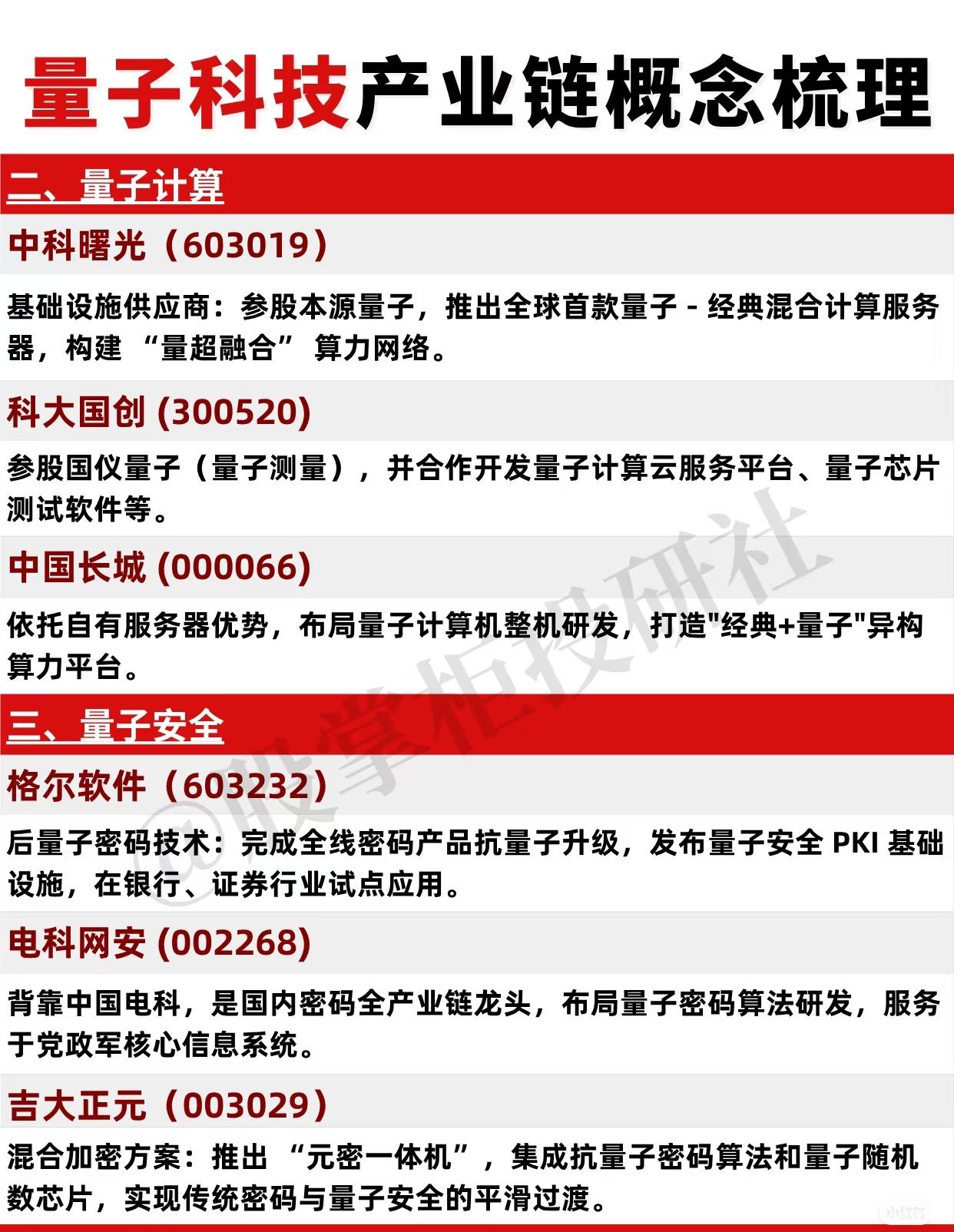“量子科技产业链”的全面梳理: 一、量子通信(已商用化程度最高,产业化领先) 1. 国盾量子(688027) - 技术地位:全球量子通信设备龙头,主导了“京沪干线”、“墨子号”卫星等国家级项目,量子密钥分发(QKD)设备全球出货量第一。 - 战略升级:由中国电信控股后,加速推进“央企+科研院所”合作模式,2025年订单同比大增74.54%,机构预测全年有望扭亏为盈。 2. 神州信息(000555) - 金融应用标杆:参与人民银行“星地一体”量子通信项目,为跨境人民币收付系统提供加密传输,将跨境交易时效从3天缩短至90秒。 - 行业标准制定:中国唯一同时参与CIPS与SWIFT标准制定的企业,主导开发的ISO 20022报文转换引擎,已助力1667家CIPS参与机构实现与SWIFT MX格式的实时互译。 3. 亨通光电(600487) - 量子光缆龙头:参与“京沪干线”、“京雄量子干线”建设,量子光缆市场占有率超40%。 - 技术突破:成功开发1Tbps速率太赫兹通信光纤(适配6G),并为上海量子科学中心供应量子低温电缆。 4. 浙江东方(600120) - 区域量子网络建设:通过子公司神州量子参与“沪杭干线”建设,覆盖浙江省内35%的城市区域,中标长三角量子通信骨干网升级项目,金额达4.2亿元。 二、量子计算(处于研发与产业化初期,潜力巨大) 1. 中科曙光(603019) - 基础设施供应商:参股本源量子,推出全球首款量子-经典混合计算服务器,构建“量超融合”算力网络。 2. 科大国创(300520) - 合作与平台开发:参股国仪量子,合作开发量子计算云服务平台、量子芯片测试软件等。 3. 中国长城(000066) - 整机研发:依托自身服务器技术积累,布局量子计算机整机研发,致力于打造“经典+量子”异构算力平台。 三、量子安全(面向未来密码体系,保障信息安全) 1. 格尔软件(603232) - 后量子密码技术:已完成全部密码产品的抗量子升级,发布量子安全PKI基础设施,并在银行、证券行业进行试点应用。 2. 电科网安(002268) - 全产业链密码龙头:背靠中国电科,是国内密码产业全链条的龙头企业,积极布局量子密码算法研发,服务党政军核心信息系统。 3. 吉大正元(003029) - 混合加密方案:推出“元密一体机”,集成抗量子密码算法与量子随机数芯片,实现传统密码向量子安全平滑过渡。 四、量子材料与器件(产业链上游核心元器件) 1. 福晶科技(002222) - 非线性光学晶体龙头:生产制备量子纠缠光子对的关键材料如BBO、LBO晶体,产品应用于“墨子号”卫星及华为量子计算机。 - 技术创新:2025年推出无铍LSBO晶体,解决了传统BBO晶体的环保问题,已成为国际量子设备商的首选材料。 2. 光迅科技(002281) - 全球光模块核心厂商:布局量子通信所需的核心器件,如单光子探测器、调制器等。 - 技术协同:与国盾量子合作开发量子密钥分发专用光器件,推动量子通信与经典光网络的融合。 3. 腾景科技(688195) - 核心供应商:为中科大等科研机构在量子计算与通信领域的重要供应商。 - 技术水平:其光学薄膜、精密光学、干涉仪、偏振分束器、镀膜光纤线等产品技术处于世界前沿,是量子计算重大科研项目的关键元器件。 五、量子测量(前沿探测与测试,支撑科研与产业落地) 1. 东方中科(002819) - 量子芯片测试服务:与国仪量子合作,为量子芯片提供测试服务,短期内带来增量收入,长期计划推出通用量子测试系统,助力量子计算产业化进程。 总结: 当前量子科技产业链主要涵盖 量子通信(商业化领先)、量子计算(研发与算力平台构建)、量子安全(密码体系升级)、量子材料与器件(上游核心元器件)、量子测量(科研与测试支撑) 五大环节,每个环节都有代表性企业布局,从底层材料、核心器件到上层应用与安全保障,逐步形成完整的国产化量子科技产业生态。