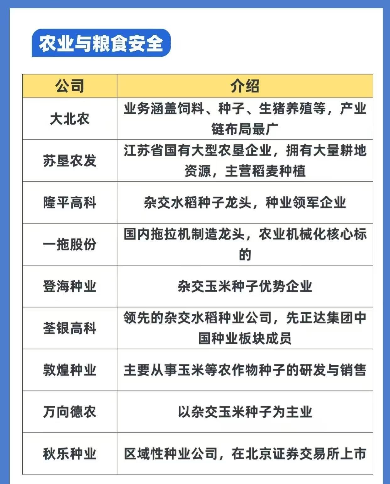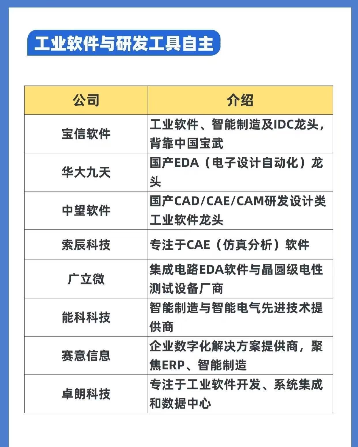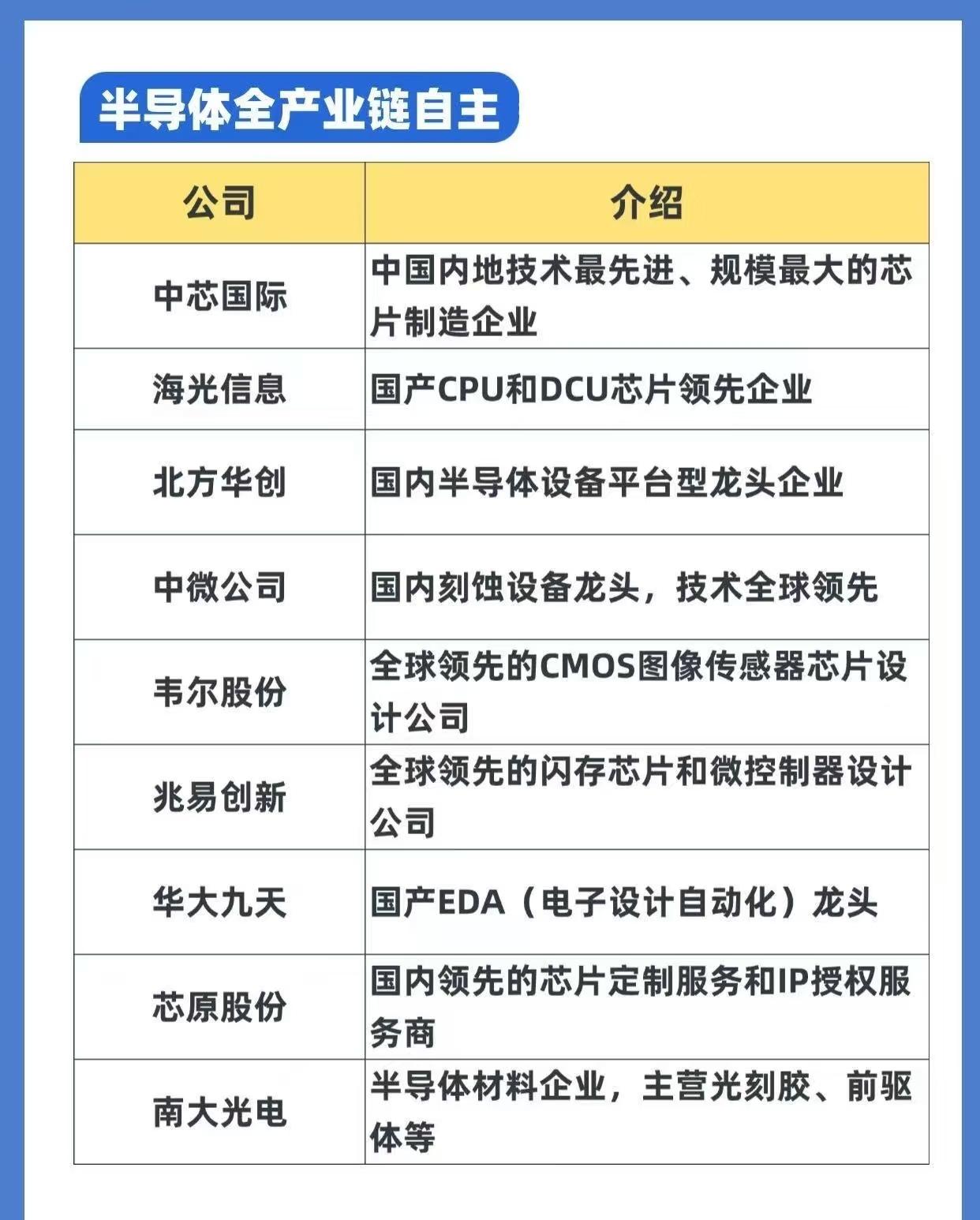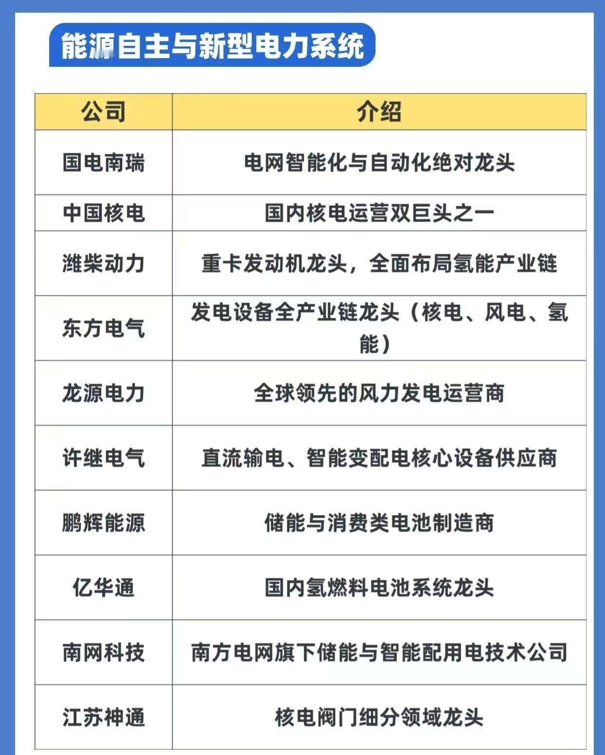 中国应对国际竞争、推进科技与产业自立自强过程中,发挥重要作用的代表性企业及其核心业务。内容涵盖十大战略板块,具体如下: 1. 信创与基础软硬件国产化:聚焦信息技术应用创新与基础软硬件的国产替代,涉及服务器(如浪潮信息、中科曙光)、企业软件(如用友网络)、办公软件(如金山办公)、网络安全(如中国长城)、操作系统(如中国软件)、中间件(如东方通)、数据库(如海量数据)以及智慧城市与物联网(如城迈科技)等关键环节的龙头或重要企业。 2. 工业软件与研发工具自主:关注支撑工业研发与制造的核心软件工具,包括工业软件与智能制造(如宝信软件)、EDA(电子设计自动化,如华大九天)、CAD/CAE/CAM设计软件(如中望软件)、CAE仿真(如索辰科技)、集成电路EDA与测试(如广立微)、智能制造与电气技术(如能科科技)、企业数字化(如赛意信息)和工业软件系统集成(如卓朗科技)等领域的代表企业。 3. 半导体全产业链自主:覆盖芯片制造(如中芯国际)、CPU/GPU等核心芯片(如海光信息)、半导体设备(如北方华创、中微公司)、芯片设计(如韦尔股份、兆易创新)、EDA工具(如华大九天)、芯片定制与IP服务(如芯原股份)、半导体材料(如南大光电、南大光电主营光刻胶等)等半导体产业链各关键环节的领先企业。 4. 稀土与战略资源管控:围绕稀土等战略性矿产资源,包括全球最大稀土矿独家开采企业(如包钢股份)、轻稀土龙头(如北方稀土)、中重稀土分离平台(如中国稀土)、高性能稀土永磁材料(如金力永磁)、全球资源布局企业(如盛和资源)、国内早期钕铁硼企业(如中科三环)、中重稀土企业(如广晟有色)、稀土永磁制造商(如宁波韵升)以及锗产业链龙头(如云南锗业)等掌握关键资源的企业。 5. 军工与高端装备:聚焦国防军工及高端制造装备,包括航空发动机(如航发动力)、战斗机主机厂(如中航沈飞)、军用连接器(如中航光电)、卫星研制(如中国卫星)、碳纤维材料(如光威复材)、航空新材料(如中航高科)、红外探测器(如高德红外)、雷达与智能网联(如雷科防务)等军工及高端技术领域的核心企业(注:东旭光电被标注为非军工核心概念股)。 6. 光端材料与中间品自主:关注半导体及高端制造所需的关键材料与中间品,包括碳纤维(如光威复材)、高端钛合金与超导材料(如西部超导)、半导体溅射靶材(如江丰电子)、CMP抛光液(如安集科技)、半导体前驱体与电子特气(如雅克科技、南大光电)、显示与新材料(如凯盛科技)、稀有金属(如东方钽业)等领域的材料龙头企业。 7. 农业与粮食安全:围绕保障国家粮食安全与农业产业链,包括综合性农业企业(如苏垦农发、主营稻麦种植)、种业龙头(如隆平高科、杂交水稻种子领先;登海种业、杂交玉米优势企业;荃银高科、先正达成员;敦煌种业、玉米种子研发;万向德农、玉米种子主业;秋乐种业、区域性种业企业)、饲料与养殖(如大北农,产业链覆盖广)、农业机械(如一拖股份,拖拉机制造龙头)等农业关键环节的重点企业。 8. 能源自主与新型电力系统:聚焦国家能源安全与新能源发展,包括电网智能化(如国电南瑞)、核电运营(如中国核电)、氢能布局(如潍柴动力)、发电设备(如东方电气)、风电运营(如龙源电力)、直流输电(如许继电气)、储能电池(如鹏辉能源)、氢燃料电池(如亿华通)以及储能与智能配电(如南网科技)等能源产业链上的核心企业(注:江苏神通虽未在提问中汇总,但在原图中为核电阀门细分龙头)。 9. 非美市场替代:强调在全球供应链重构背景下,中国企业通过技术、品牌与产能出海,实现对非美市场的替代与布局,包括全球动力电池龙头(如宁德时代,海外建厂)、新能源汽车销量领先企业(如比亚迪,品牌与产能双出海)、白色家电巨头(如美的集团,深度全球化)、光伏龙头(如隆基绿能,全球新能源替代核心)、全球化家电企业(如海尔智家,通过并购实现本土化)、智能显示双轮驱动企业(如TCL科技)、工程机械出口企业(如三一重工、徐工机械,与卡特彼勒等竞争,深耕“一带一路”)等具备全球竞争力的代表企业。 10. 内需消费与必选韧性:关注国内消费市场的基本盘与韧性,包括白色家电与智能家居龙头(如美的集团,业务多元)、全球大家电品牌(如海尔智家,智慧家庭布局)、乳制品龙头(如伊利股份)、调味品霸主(如海天味业)、定制家居龙头(如欧派家居)、连锁商超转型企业(如永辉超市)、腌菜行业龙头(如涪陵榨菜)、生活用纸头部企业(如中顺洁柔)等覆盖民生刚需与消费升级的关键企业。