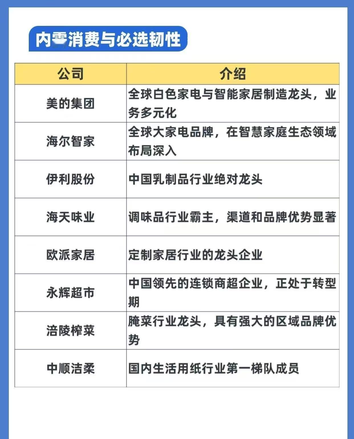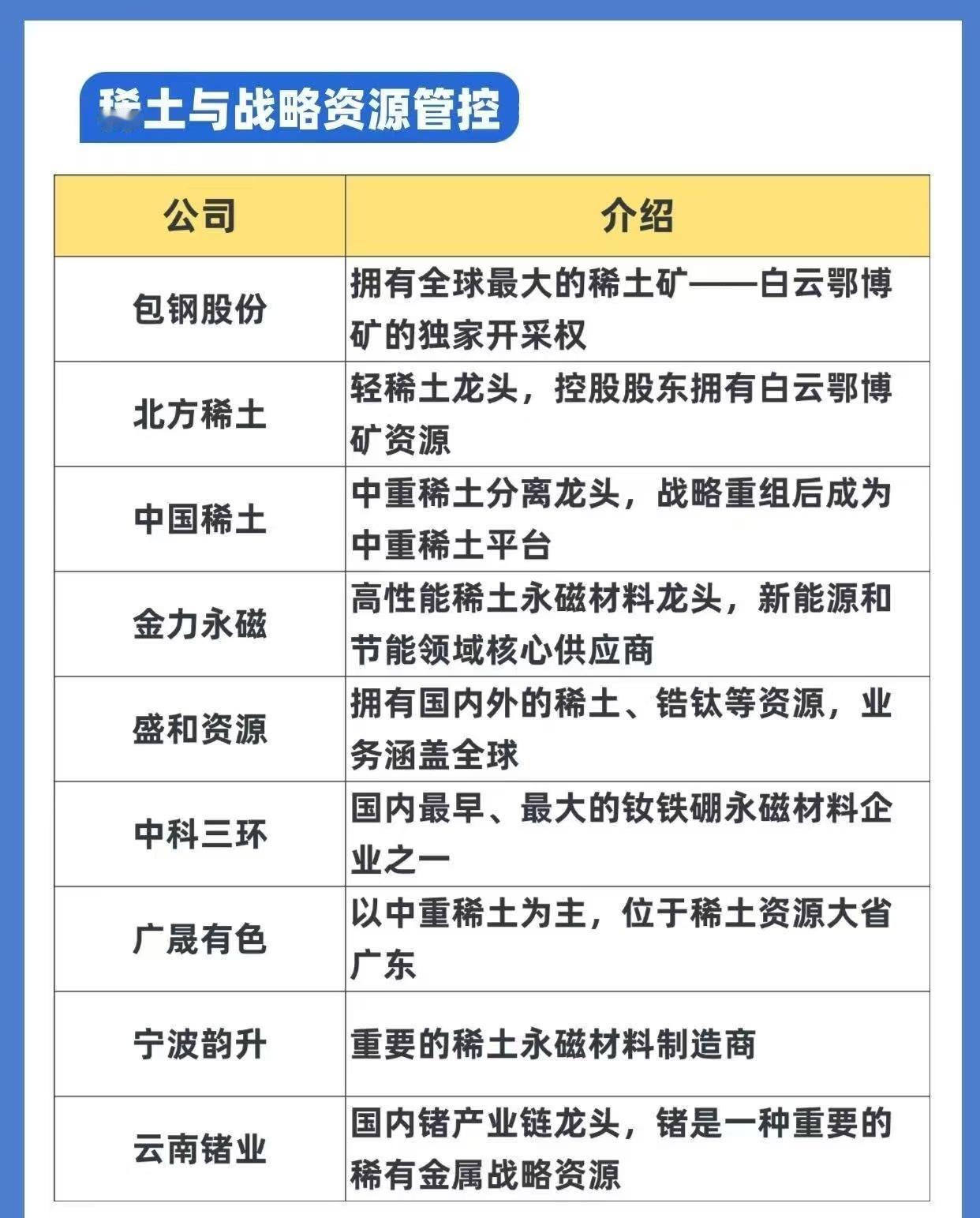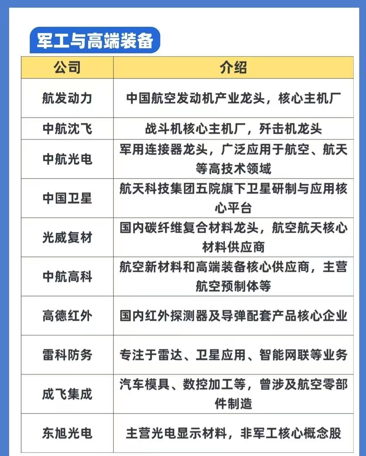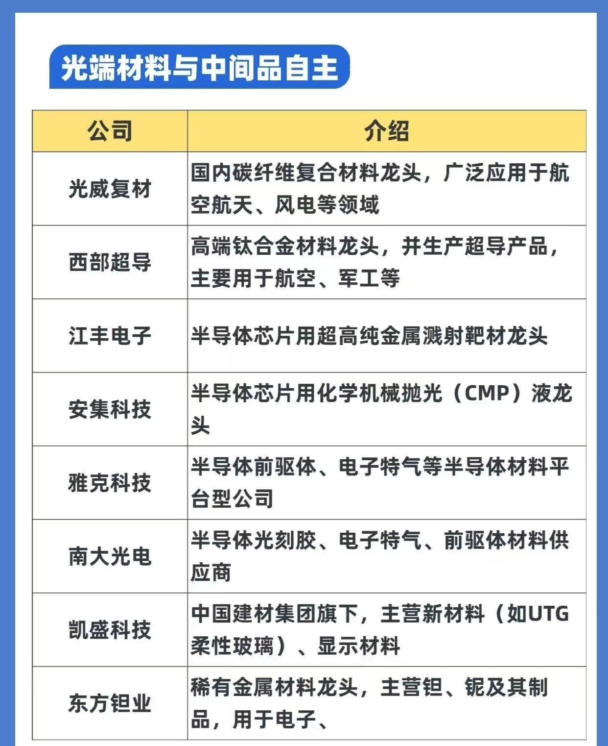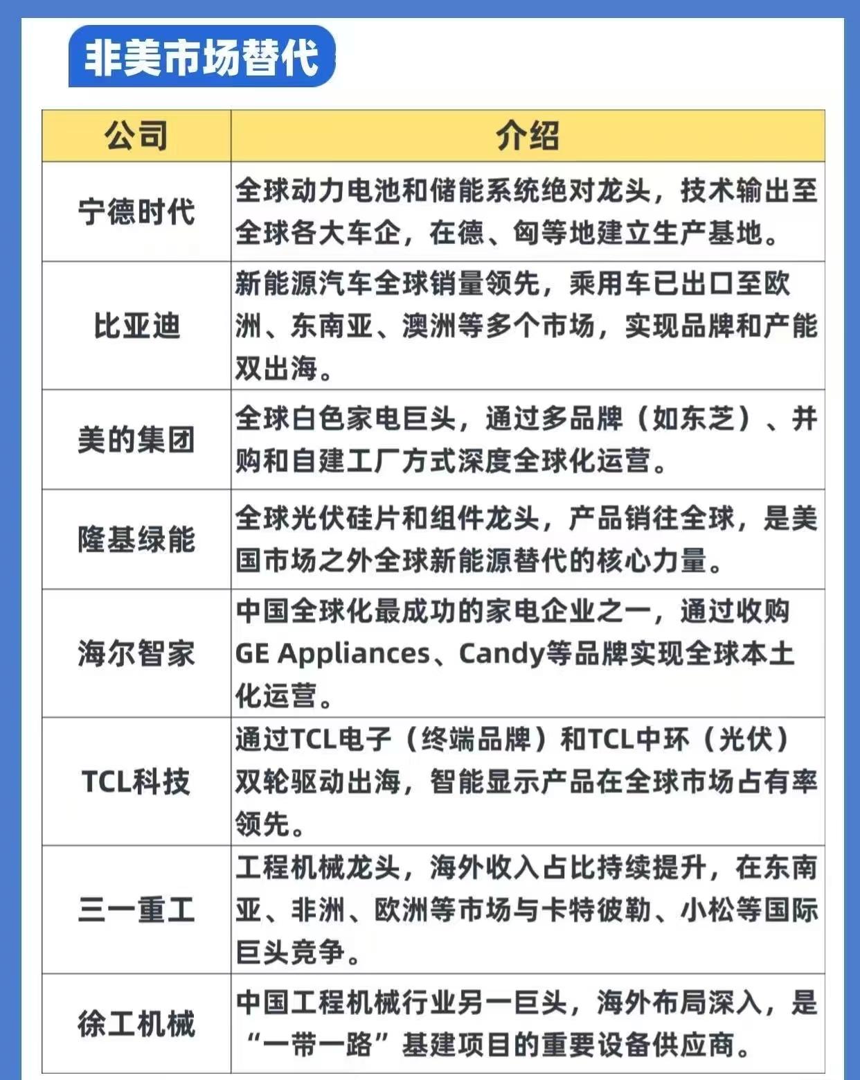 中国应对国际竞争、推进科技与产业自立自强过程中,发挥重要作用的代表性企业及其核心业务。内容涵盖十大战略板块,具体如下: 1. 信创与基础软硬件国产化:聚焦信息技术应用创新与基础软硬件的国产替代,涉及服务器(如浪潮信息、中科曙光)、企业软件(如用友网络)、办公软件(如金山办公)、网络安全(如中国长城)、操作系统(如中国软件)、中间件(如东方通)、数据库(如海量数据)以及智慧城市与物联网(如城迈科技)等关键环节的龙头或重要企业。 2. 工业软件与研发工具自主:关注支撑工业研发与制造的核心软件工具,包括工业软件与智能制造(如宝信软件)、EDA(电子设计自动化,如华大九天)、CAD/CAE/CAM设计软件(如中望软件)、CAE仿真(如索辰科技)、集成电路EDA与测试(如广立微)、智能制造与电气技术(如能科科技)、企业数字化(如赛意信息)和工业软件系统集成(如卓朗科技)等领域的代表企业。 3. 半导体全产业链自主:覆盖芯片制造(如中芯国际)、CPU/GPU等核心芯片(如海光信息)、半导体设备(如北方华创、中微公司)、芯片设计(如韦尔股份、兆易创新)、EDA工具(如华大九天)、芯片定制与IP服务(如芯原股份)、半导体材料(如南大光电、南大光电主营光刻胶等)等半导体产业链各关键环节的领先企业。 4. 稀土与战略资源管控:围绕稀土等战略性矿产资源,包括全球最大稀土矿独家开采企业(如包钢股份)、轻稀土龙头(如北方稀土)、中重稀土分离平台(如中国稀土)、高性能稀土永磁材料(如金力永磁)、全球资源布局企业(如盛和资源)、国内早期钕铁硼企业(如中科三环)、中重稀土企业(如广晟有色)、稀土永磁制造商(如宁波韵升)以及锗产业链龙头(如云南锗业)等掌握关键资源的企业。 5. 军工与高端装备:聚焦国防军工及高端制造装备,包括航空发动机(如航发动力)、战斗机主机厂(如中航沈飞)、军用连接器(如中航光电)、卫星研制(如中国卫星)、碳纤维材料(如光威复材)、航空新材料(如中航高科)、红外探测器(如高德红外)、雷达与智能网联(如雷科防务)等军工及高端技术领域的核心企业(注:东旭光电被标注为非军工核心概念股)。 6. 光端材料与中间品自主:关注半导体及高端制造所需的关键材料与中间品,包括碳纤维(如光威复材)、高端钛合金与超导材料(如西部超导)、半导体溅射靶材(如江丰电子)、CMP抛光液(如安集科技)、半导体前驱体与电子特气(如雅克科技、南大光电)、显示与新材料(如凯盛科技)、稀有金属(如东方钽业)等领域的材料龙头企业。 7. 农业与粮食安全:围绕保障国家粮食安全与农业产业链,包括综合性农业企业(如苏垦农发、主营稻麦种植)、种业龙头(如隆平高科、杂交水稻种子领先;登海种业、杂交玉米优势企业;荃银高科、先正达成员;敦煌种业、玉米种子研发;万向德农、玉米种子主业;秋乐种业、区域性种业企业)、饲料与养殖(如大北农,产业链覆盖广)、农业机械(如一拖股份,拖拉机制造龙头)等农业关键环节的重点企业。 8. 能源自主与新型电力系统:聚焦国家能源安全与新能源发展,包括电网智能化(如国电南瑞)、核电运营(如中国核电)、氢能布局(如潍柴动力)、发电设备(如东方电气)、风电运营(如龙源电力)、直流输电(如许继电气)、储能电池(如鹏辉能源)、氢燃料电池(如亿华通)以及储能与智能配电(如南网科技)等能源产业链上的核心企业(注:江苏神通虽未在提问中汇总,但在原图中为核电阀门细分龙头)。 9. 非美市场替代:强调在全球供应链重构背景下,中国企业通过技术、品牌与产能出海,实现对非美市场的替代与布局,包括全球动力电池龙头(如宁德时代,海外建厂)、新能源汽车销量领先企业(如比亚迪,品牌与产能双出海)、白色家电巨头(如美的集团,深度全球化)、光伏龙头(如隆基绿能,全球新能源替代核心)、全球化家电企业(如海尔智家,通过并购实现本土化)、智能显示双轮驱动企业(如TCL科技)、工程机械出口企业(如三一重工、徐工机械,与卡特彼勒等竞争,深耕“一带一路”)等具备全球竞争力的代表企业。 10. 内需消费与必选韧性:关注国内消费市场的基本盘与韧性,包括白色家电与智能家居龙头(如美的集团,业务多元)、全球大家电品牌(如海尔智家,智慧家庭布局)、乳制品龙头(如伊利股份)、调味品霸主(如海天味业)、定制家居龙头(如欧派家居)、连锁商超转型企业(如永辉超市)、腌菜行业龙头(如涪陵榨菜)、生活用纸头部企业(如中顺洁柔)等覆盖民生刚需与消费升级的关键企业。