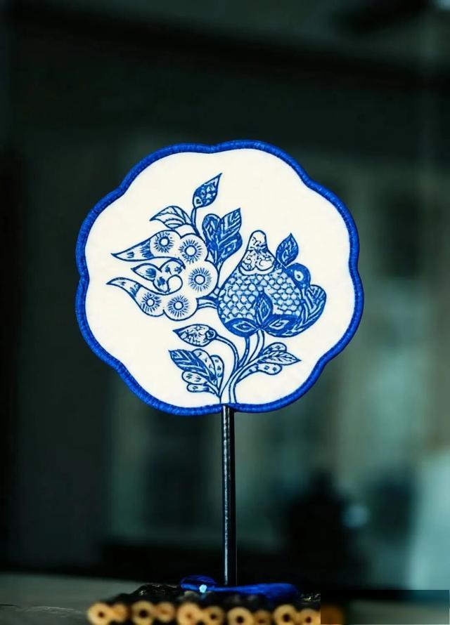 《民族风镂空绣团扇》上绣有石榴图案,承载着彝族人民对美好生活的向往和祝福。石榴果实籽粒繁多,在彝族文化里象征着多子多福,作品上的石榴图案象征着彝族同胞对家族繁荣的期盼。