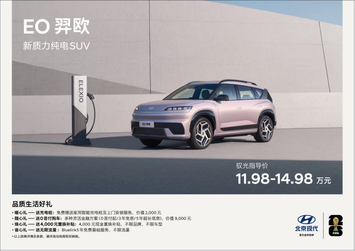 上市同时,北京现代还推出“品质生活好礼”购车政策,包含送充电桩、0首付购车、4000元置换补贴、无限流量等。作为“智启2030计划”首款落地成果,EO羿欧将北京现代燃油时代“品质基因”延伸至新能源领域。未来5年,北京现代计划推出20款新产品,其中13款为新能源车型,以“本土化研发+全球品质”战略推动纯电市场从“堆配置”向“讲品质”回归。