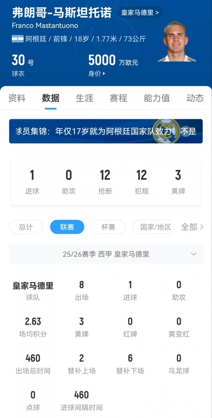 今夏皇马以4500万欧元签下18岁的马斯坦托诺,他至今已经为皇马在联赛出场8次,贡献1个进球,目前的身价为5000万欧元。