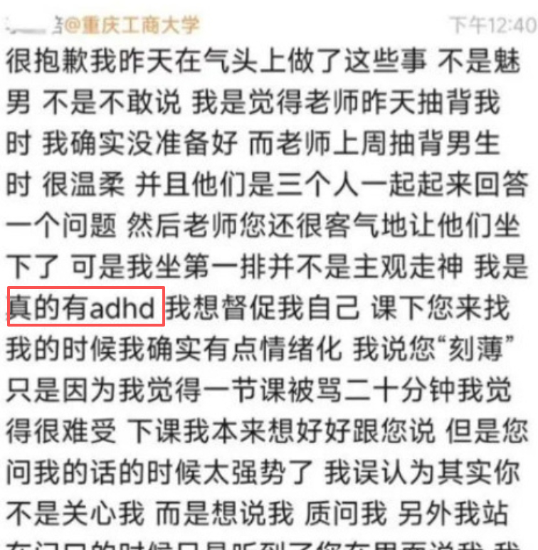 最后被揭露真相被迫道歉时,张口就来“我有adhd”(即注意缺陷多动障碍---一个类似抑郁症的病),同样非常熟练的使用buff叠甲逃避责任。