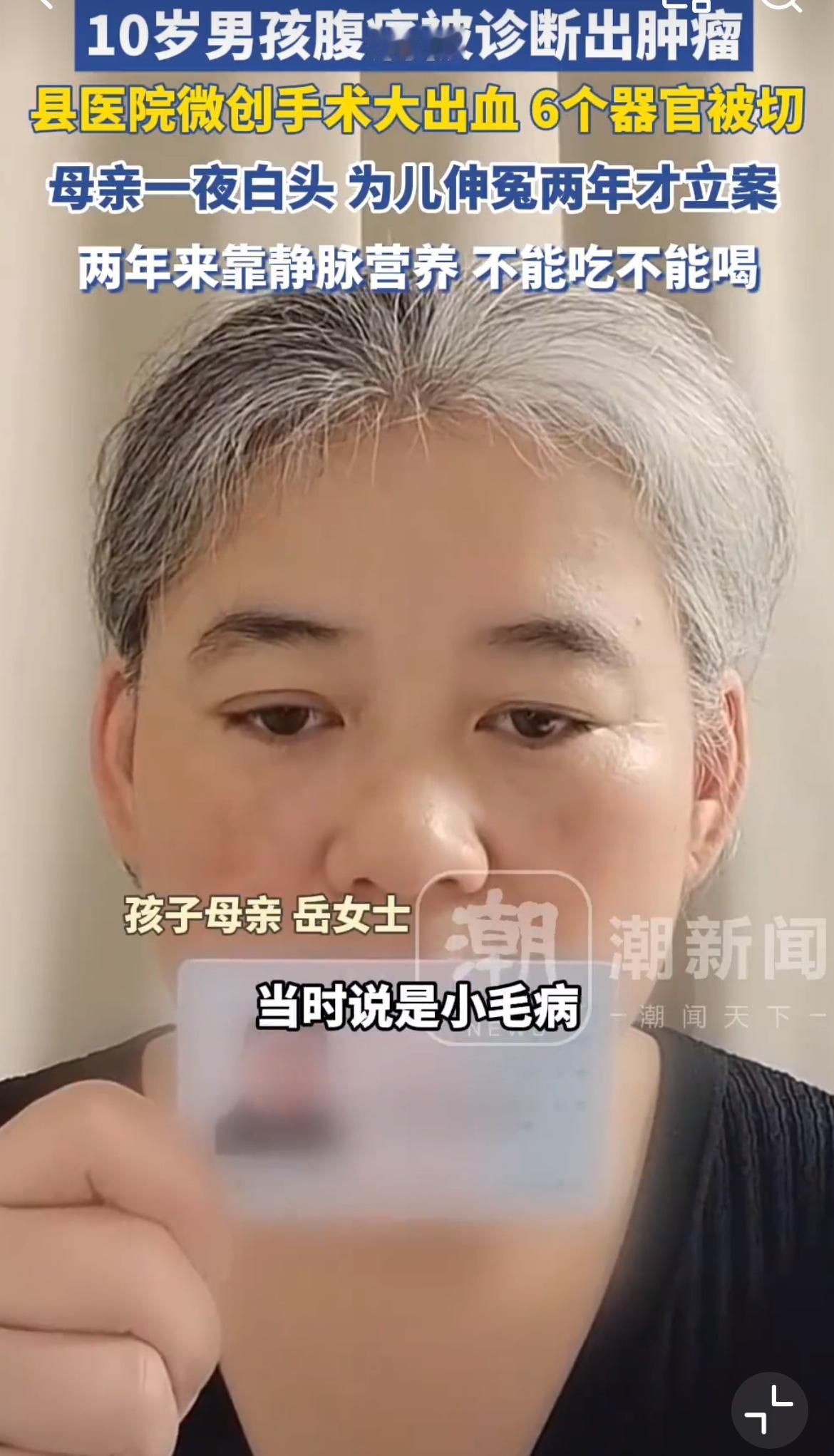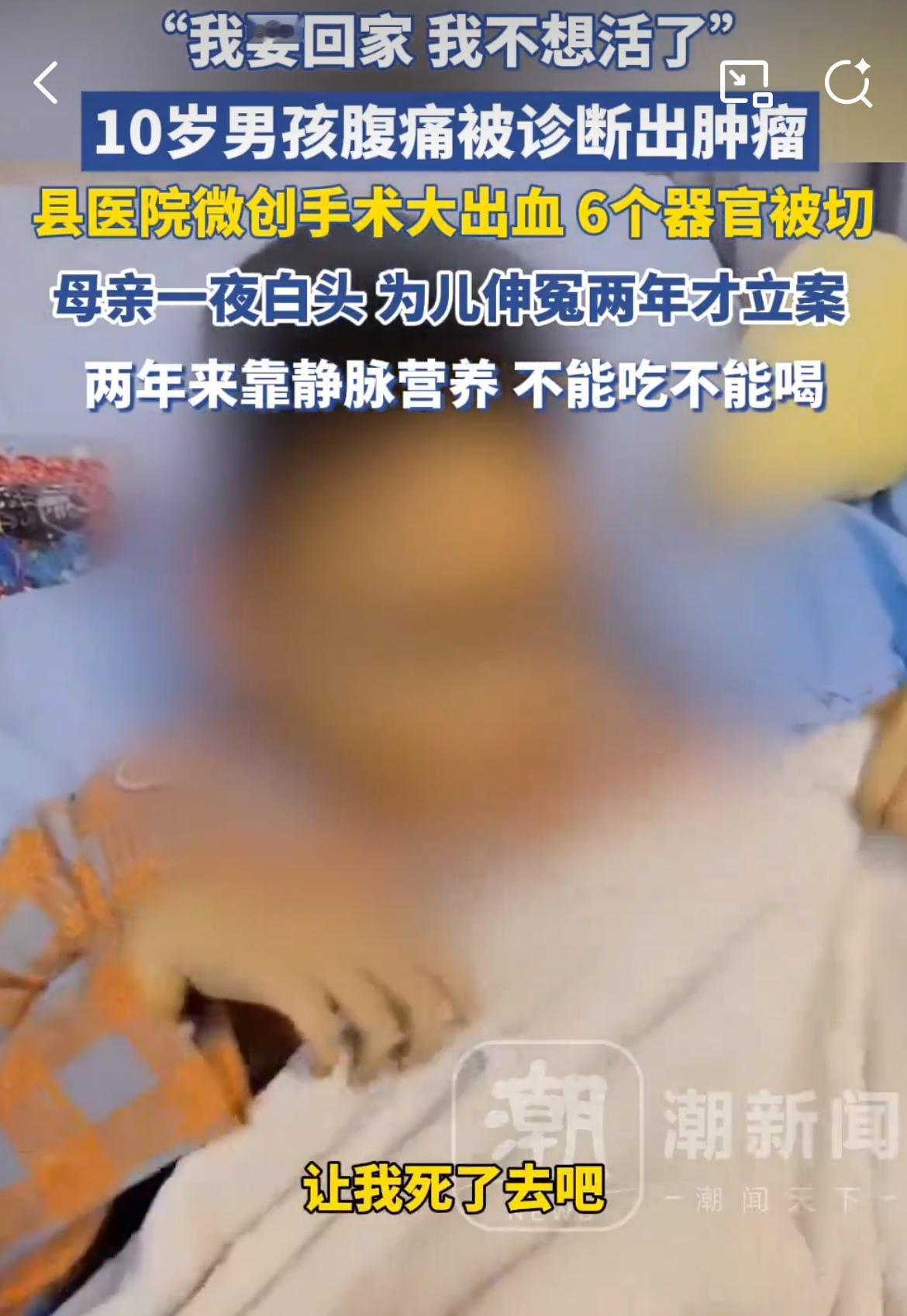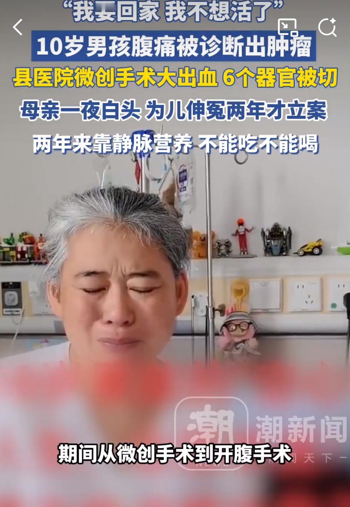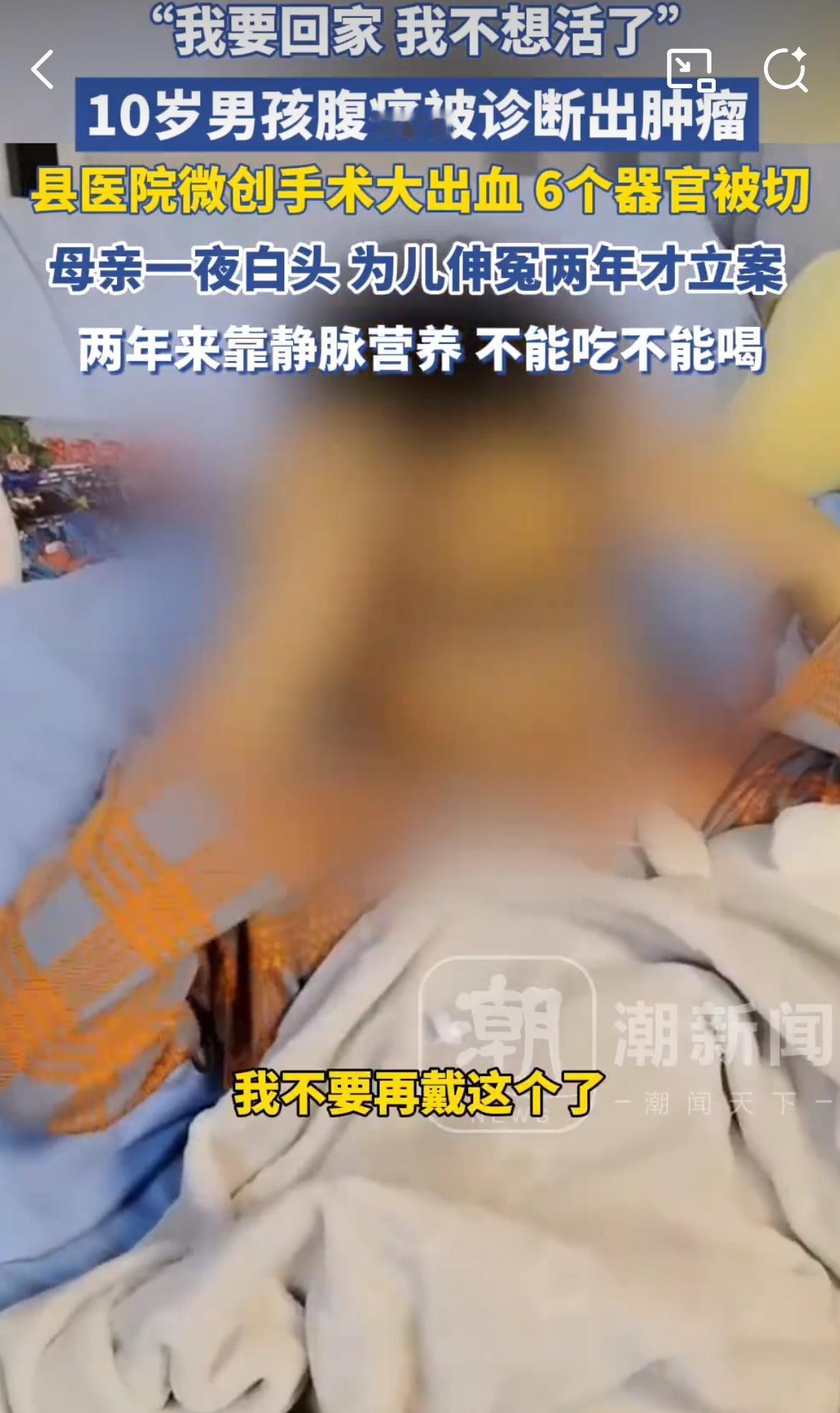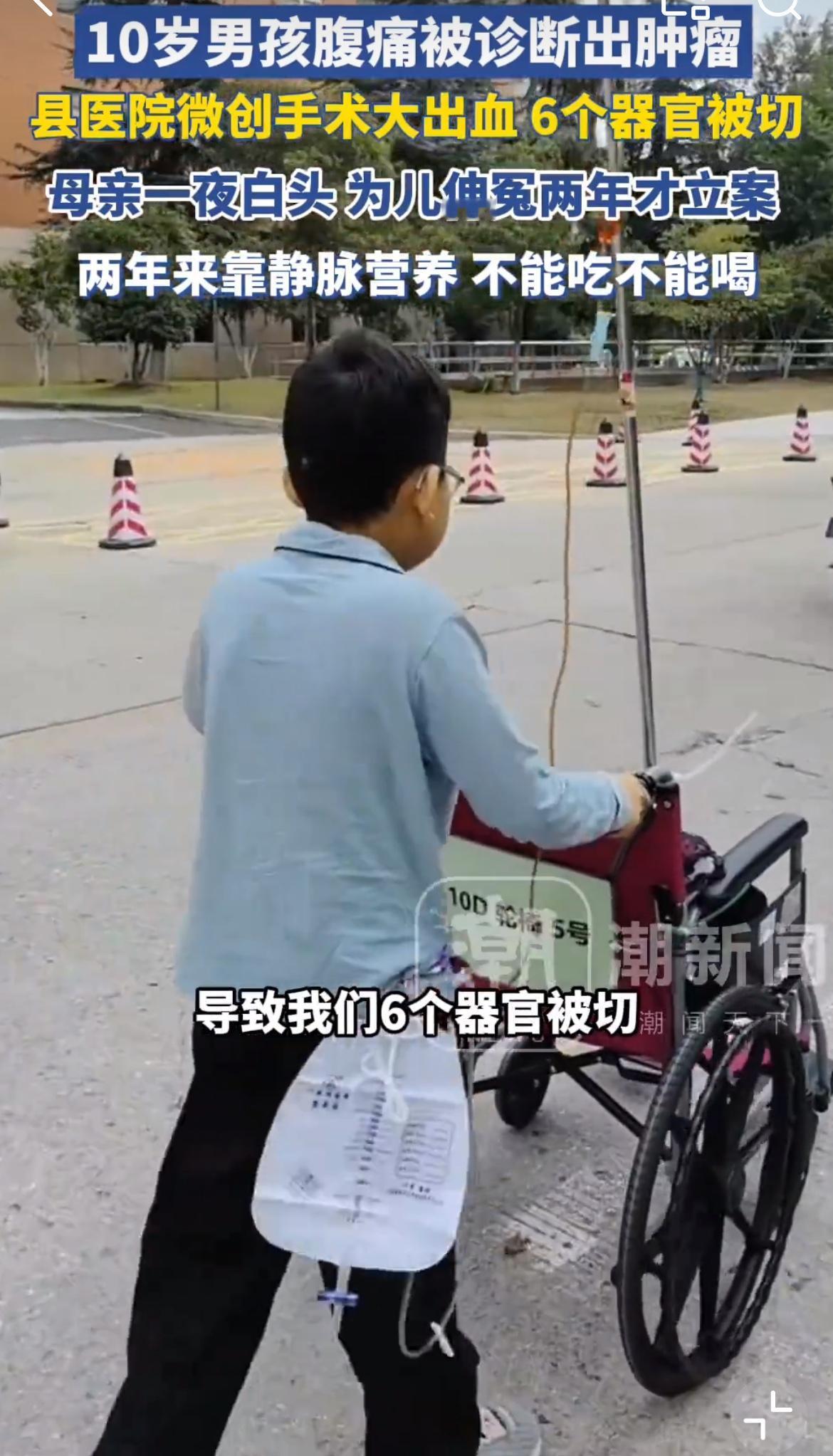 太惨了,山东成武10岁男童手术失败导致消化系统切除,只能依靠打营养液续命,孩子妈妈一夜急白头。孩子因为腹痛被诊断出肿瘤,县医院给他做一个微创手术,手术过程中导致大出血,陆续6个器官被切除。手术持续14个小时,手术从微创变成开腹,十二指肠被切除,结肠切除,家属被迫4次签署手术同意书,消化系统大部分被切除,连胃也被切掉三分之二。手术完成,孩子生不如死,如今2年不能进食,只能靠输营养液为生,随身挂着排泄袋。想想,孩子还没长大,这一生就要被毁了,那个家长能接受这个事实。胃全切手术 小儿腹腔镜手术