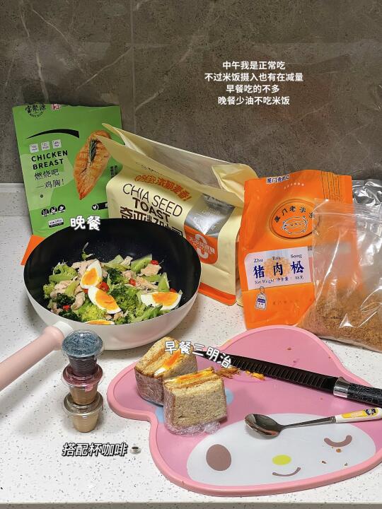 在男朋友一天天的投喂下 我的体重成功突破三位数[黑薯问号R][黑薯问号R] 去年穿着还松垮的裤子[石化R] 今年居然穿不上了… 减肥这事是刻不容缓!!! 于是 天天早上啃玉米红薯 晚上也啃玉米 饿了就喝水,馋了就扇嘴哈哈哈 整的我嘴巴淡出鸟来 抱怨了好几天 男朋友马上给我安排起来 做了个鸡胸肉西兰花🥦,很好吃!!真没想到尹正的焖菜做法平平无奇,味道让人惊喜!!! 京东打字~零食派对~买的这个宝聚源鸡胸肉可是派上大用场了 空口吃用来解馋就很(๑•̀ㅂ•́)و✧了,没想到用来焖菜也阔以!! 我还趁着现在满199➖100入了很多面包牛奶什么的[喝奶茶R] 准备的早餐三明治用到的食材也都是里面囤的 巴比熊奇亚籽面包就比较适合现在不准胡吃海喝的我 再加点黄胜记肉松和鸡蛋就大功告成~ 早上一份三明治再来杯咖啡,减脂人的经典搭配!! 减肥减脂吃这些男朋友做饭的日常今天晚餐长这样减肥食谱打卡美味情报一线玩味潮饮快乐过瘾零食广场尹正焖菜