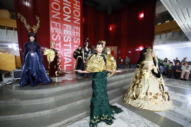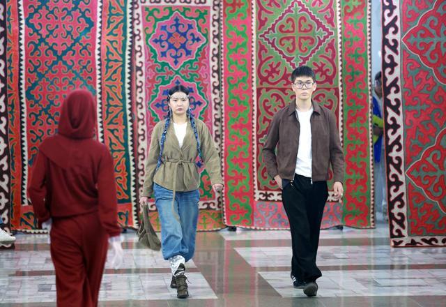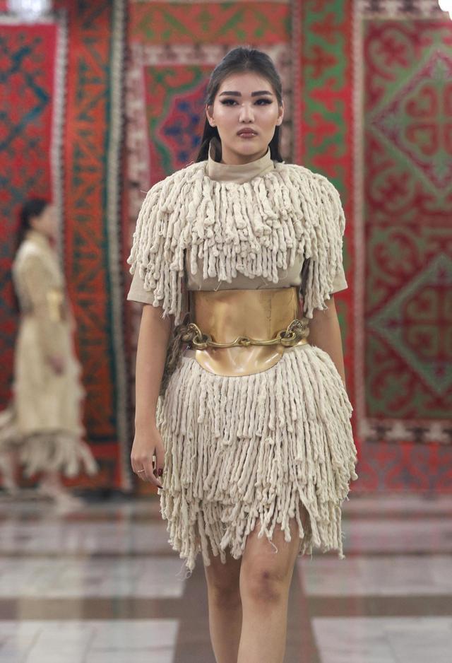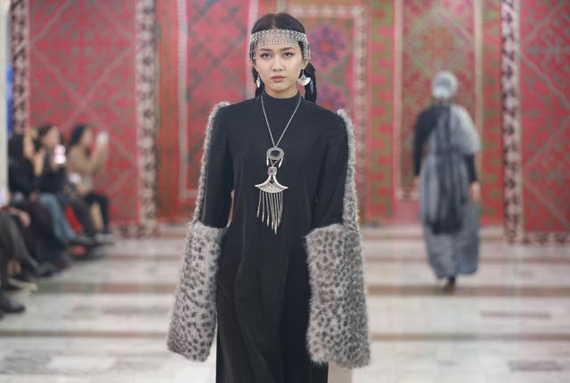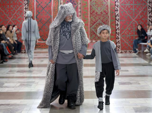 10月30日,在吉尔吉斯斯坦首都比什凯克举行的游牧民族时装艺术节上,模特展示时装作品。