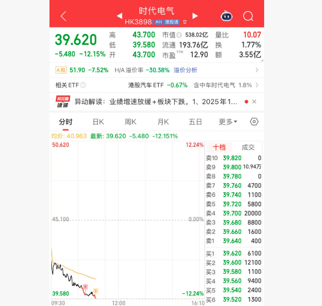 上证报中国证券网讯(记者李五强)10月31日,时代电气H股开盘后一路下跌,截至11:09,时代电气报39.62港元/股,下跌12.15%。时代电气A股也一路下跌,跌幅超过7%。