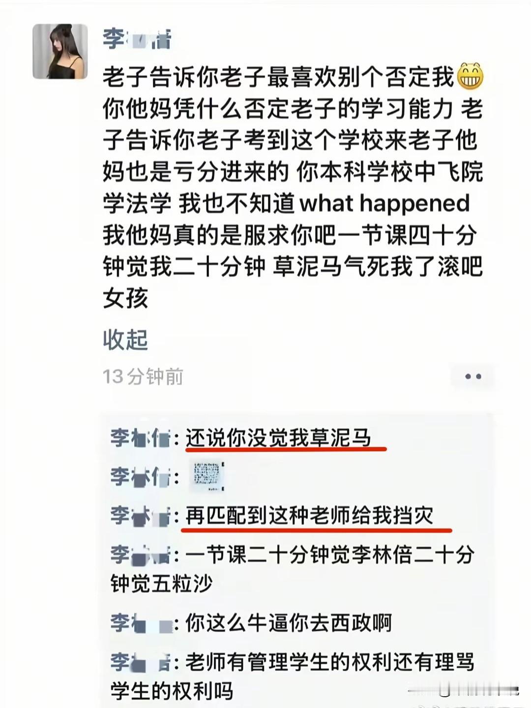重庆工商大学的李某倍,已经被其他同学恨得咬牙切齿了,因为被她造谣的老师说以后不在群里发学习资料,并且解散群聊,这就意味着,这门科想要过关,只能通过期末考试了,没有考勤分、没有平时分加持了,要想过期末考试还是要花好多时间和精力的!真是一人嘴毒害得其他同学跟着遭殃!