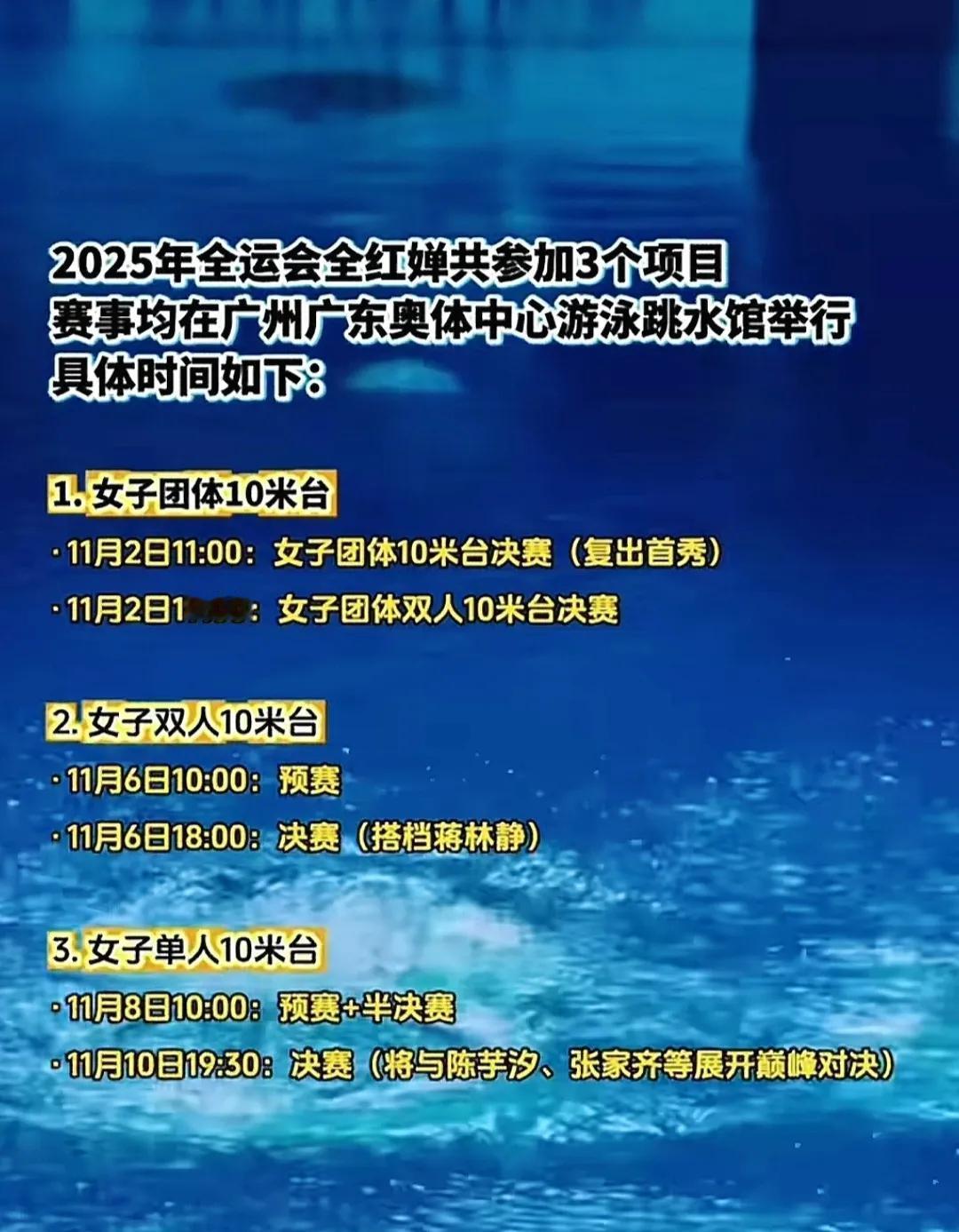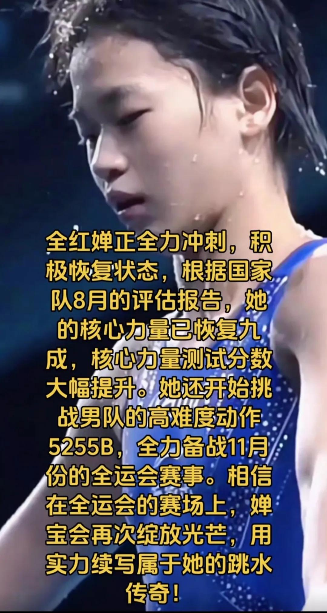 全运会观众最想看的是什么项目?跳水是主要的其中之一,特别是有全红婵参加的比赛。11月2号11点,女子十米台团体决赛,婵宝来了。 相比别的跳水运动员,这里单说全红婵的竞争对手,她们有科学的系统指导训练,有科学的营养师,科学的恢复体能师,科学的这个那个师。全红婵呢?随着年龄层次的快速生长,家族强大偏胖基因,让喜欢她的观众翘首以待,能不能大杀四方?早早的就买了她有关比赛的门票,想一睹她风采,能不能把所有比赛的金牌收入囊中。 全红婵训练是够刻苦的,不声不响的一个人日夜加练,所付出的艰辛一般人做不到,这就是婵宝,来自农村的辛勤小姑娘。 有人说她是天才,其实都是脚踏实地一步一个脚印咬牙练出来的。 好了,大家看看她有关比赛的时间,千万不要错过,为婵宝加油。
