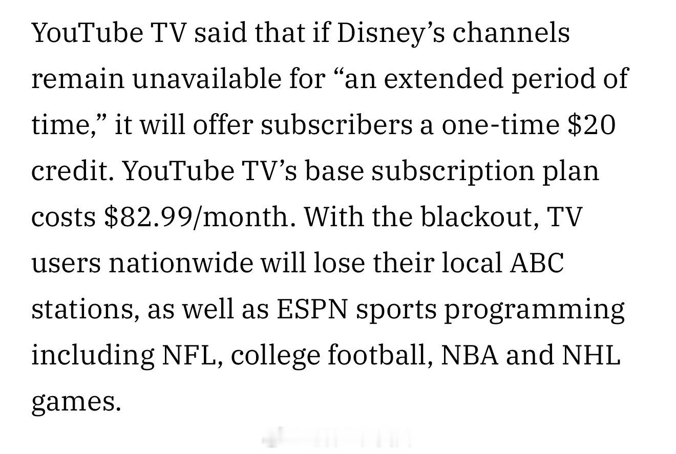 迪士尼坐地起价,谷歌不答应,ABC地方台和ESPN将被YouTube TV下架,订阅用户一次性补偿20刀。[苦涩]
