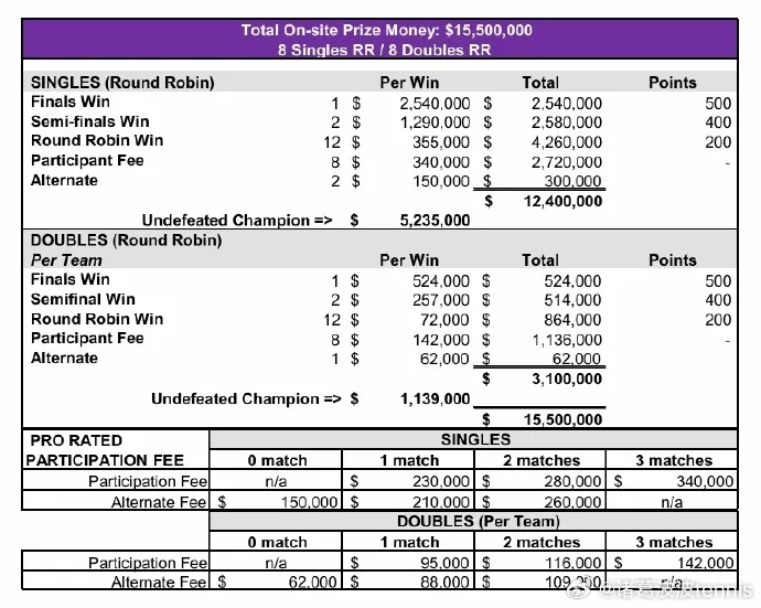 今年总决赛奖金池达到1550万美元,其中单打1240万,双打310万。单打全胜夺冠将拿到523.5万美元,双打全胜夺冠将拿到113.9万美元。