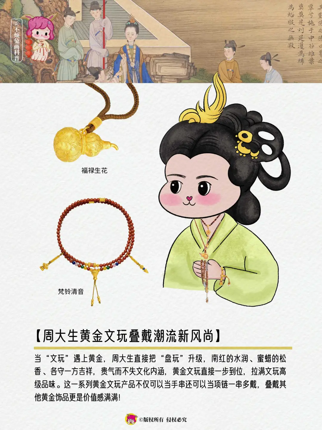 周大生正是从中汲取遥远的灵感,将黄金文玩所蕴含的形制、纹样与神韵,巧妙转化为现代设计的语言,让沉睡的历史在当代首饰的方寸之间,重新绽放出时代的光华。
