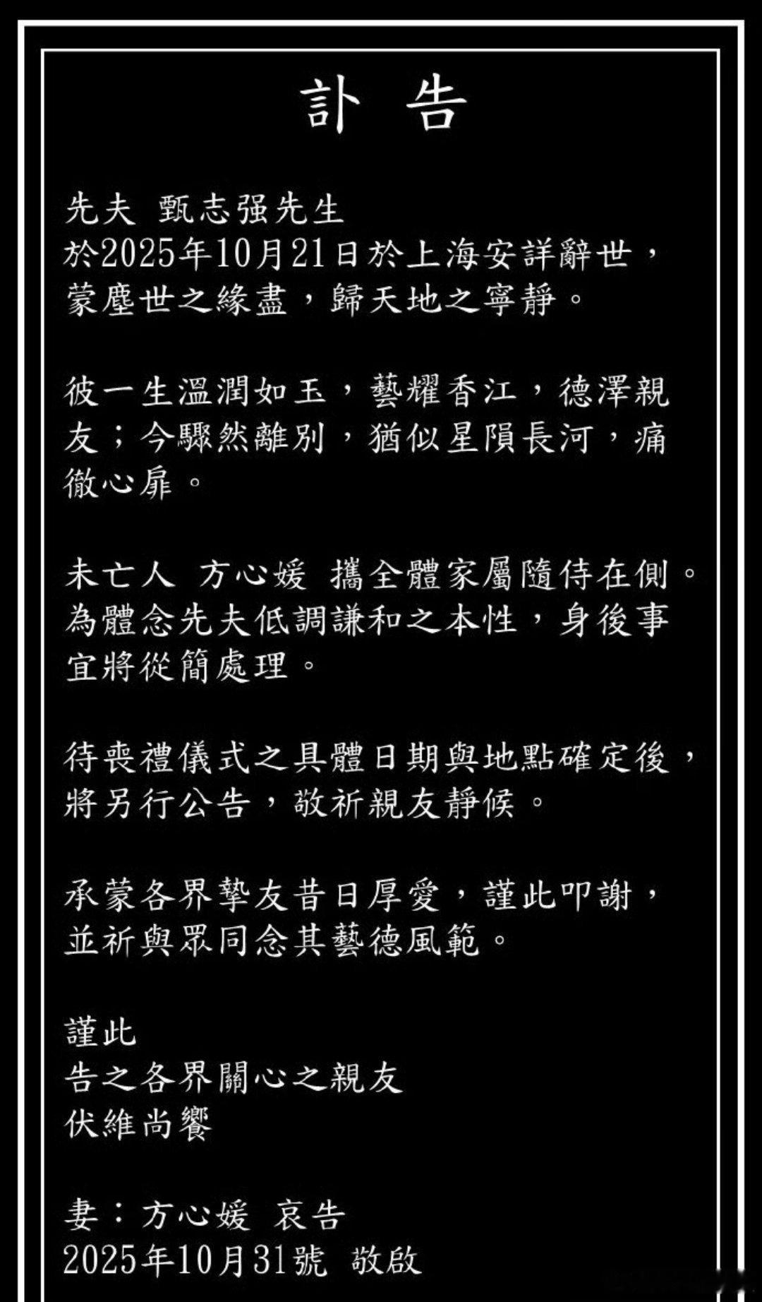 演员甄志强离世甄志强离世10月31日,据港媒报道,前亚视小生甄志强的妻子发布讣告:“先夫甄志强先生于2025年10月21日于上海安详辞世。”丧礼仪式具体日期、地点待确定后将另行告知。