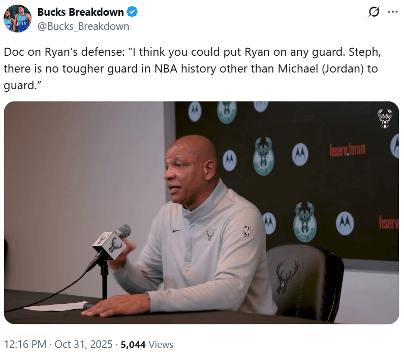 赛后,雄鹿主帅道格-里弗斯接受了记者的采访,当被问及莱恩-罗林斯的防守时,他表示: