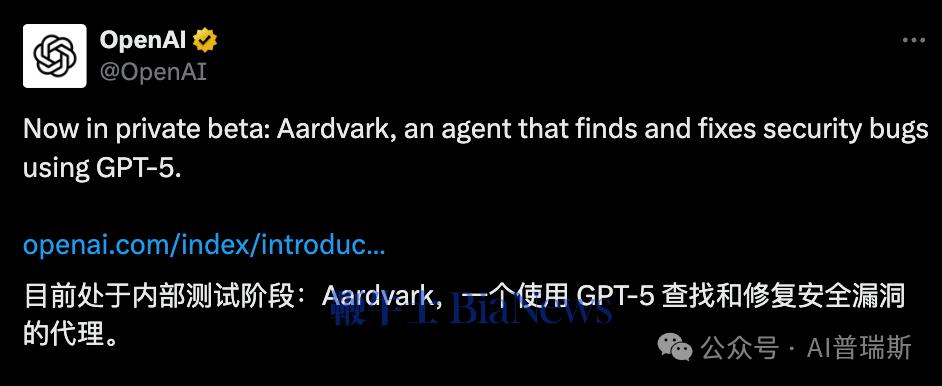 今日,OpenAI宣布推出Aardvark,一款基于GPT‑5的“代理式安全研究员”智能体,目前已开放给部分合作伙伴进入内测。