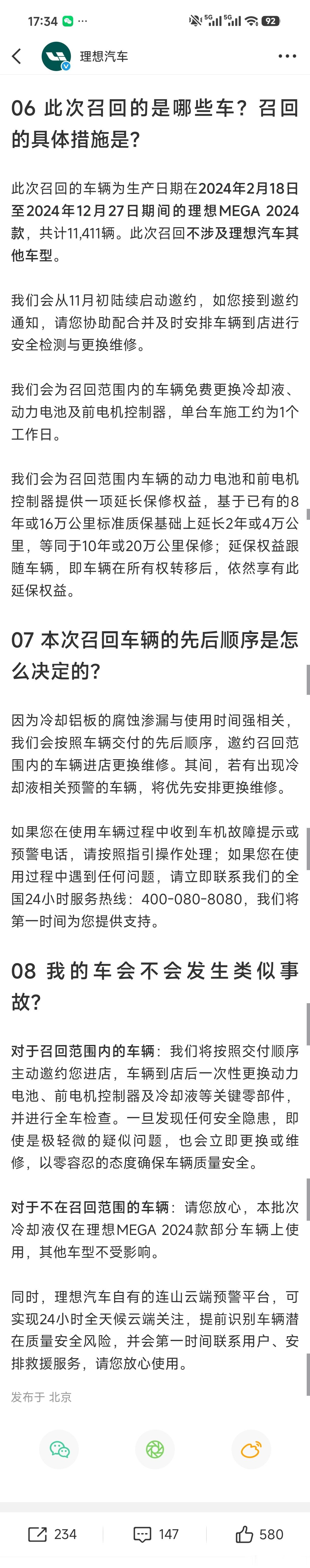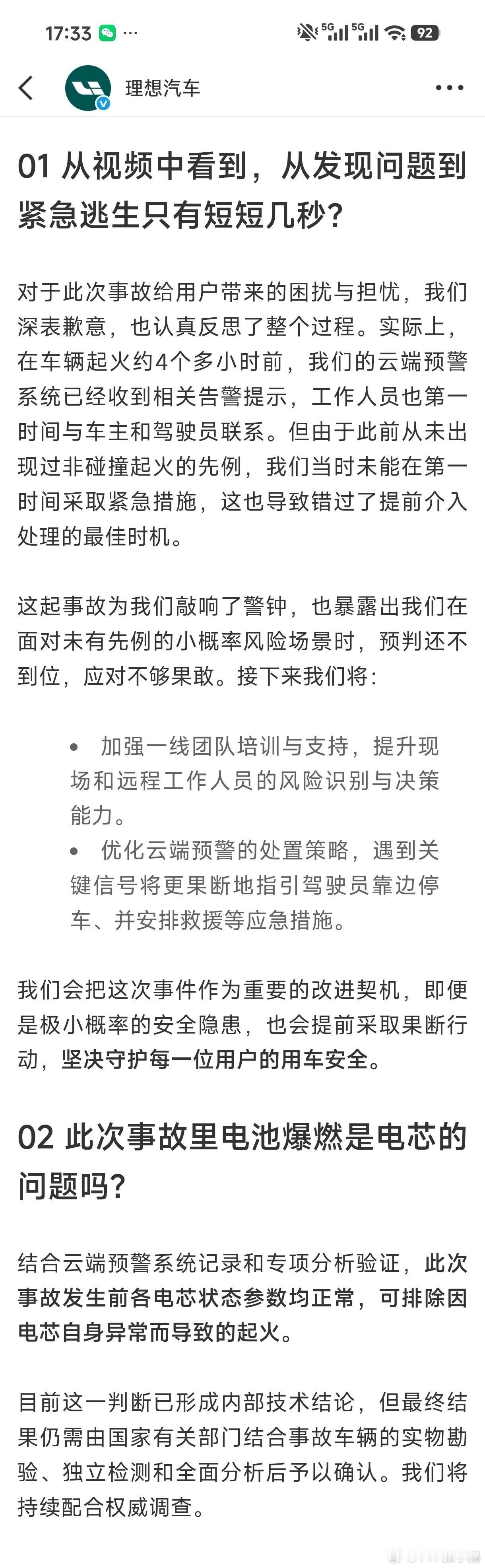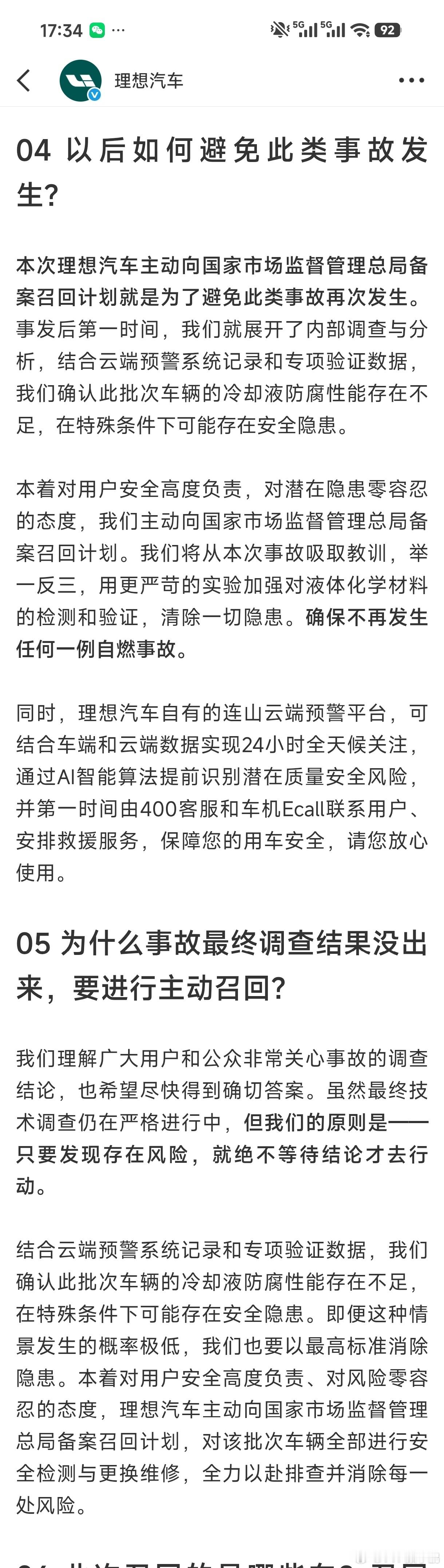 理想官方对于此前MEGA自燃事件的回应。几个关键点:属于此前未有先例的非碰撞起火,承认应对经验不足,今后会强化对液体化学材料的实验检测;该事故调查结果尚未出,但本着安全第一实行主动召回;召回顺序按交付顺序,除召回批次内的其它理想纯电车型不受影响。