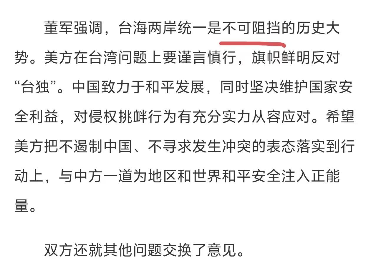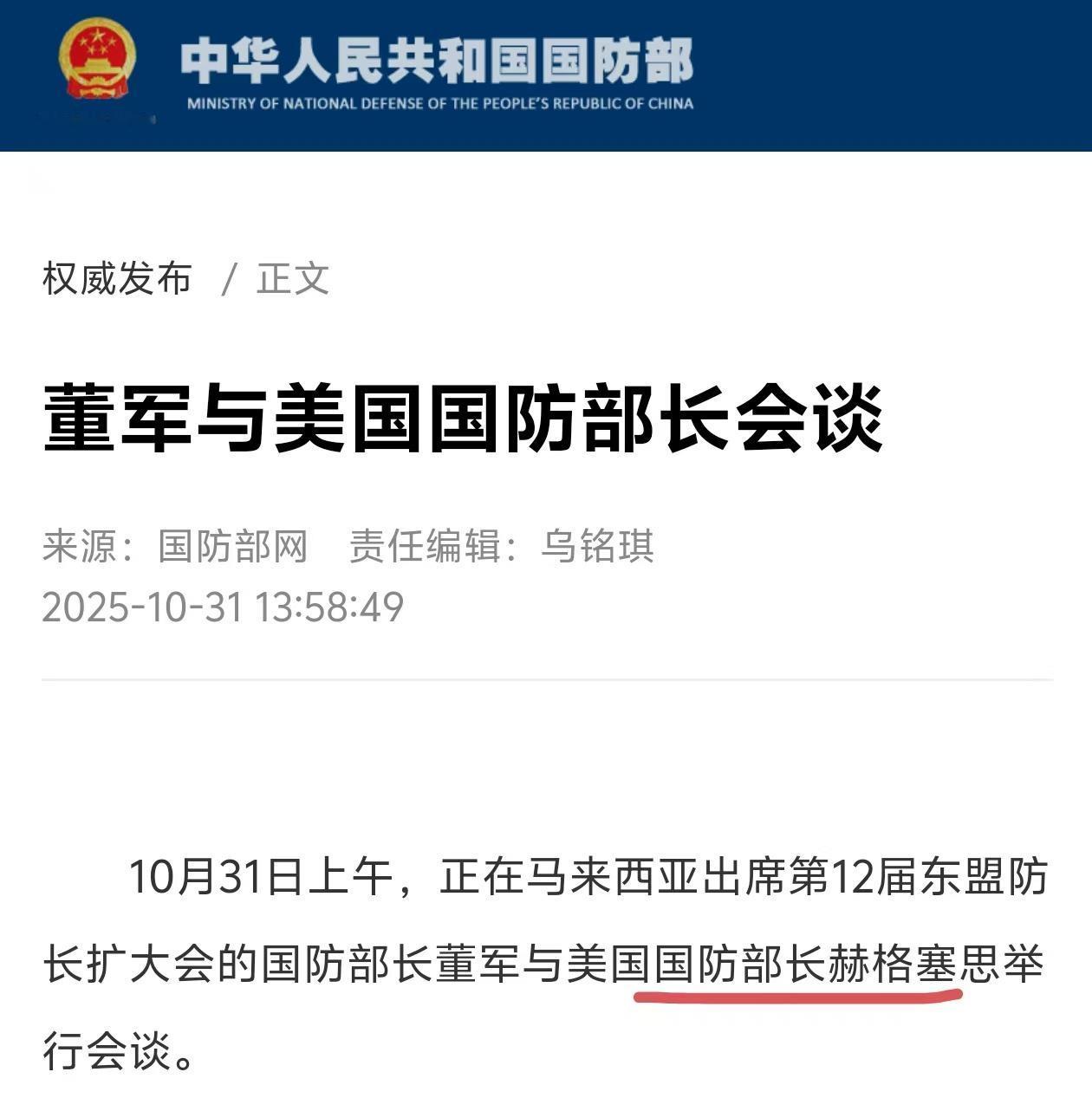 【跟特朗普会晤未提台湾,防长会提台湾,这个有意思】在中美釜山会晤的隔天,马来西亚的东盟防长扩大会,中美国防部长会晤。中方还是称国防部长,不是“战争部长”。 釜山先见,这就有指引了,有了一顶帽子,两军关系发展就脱离不开这个帽子,所谓的引领。 釜山会晤提到,“对话比对抗好”,各渠道各层级应保持沟通,增进了解,对口部门应加强对话交流。这就给包括两国防务部门给出示了范指、引和带动。 上层在对话,中基层搞对抗,这是对共识的背叛和反动。如果出现这种情况,究竟是特朗普在说一套做一套,还是约束不住手下,纵容出现跟共识不同方向的操作和举动? 如果是背着大统领的小动作,那就是做不到令行禁止,令不出白宫。不过,从特朗普内阁围绕他这个核心的态势看,老特个性超级强势,还是相当有权威的。 既然如此,那重点就是把共识落到实处,两军关系也要“平等尊重、和平共处、稳定正向”,不能出现明显破口或背离。 注意到,釜山会晤期间,没有提台湾,但防长会有谈。 董部长强调,“台海两岸统一是不可阻挡的历史大势。美方在台湾问题上要谨言慎行,旗帜鲜明反对台独”。 釜山会不谈台湾,放到防长会层面来谈,有意思的变化。 印象中,以往的会晤或通话,总有台湾问题的表述。 对于釜山会上的这个变化,有不同解读。从中方角度,是不是可以理解为,台湾问题作为第一条红线,美方应该理解到极其重要性和敏感性,应该知所进退。 如果非要触碰红线,搞砸整个大局,这应该不是商人和“交易天才”的首选。 现在听得很多的表述是,“以武谋独,死路一条”,“祖国必然统一,势不可挡”,解放军将以更强大的能力、更可靠的手段,坚决粉碎任何“台独”图谋和外来干涉,捍卫国家主权和领土完整。 统一是必然,不是或然! 既然是必然,意思就是,即便有外来干涉,也属徒劳,改变不了统一的最终结局。那就要提前打招呼,告诉美方是少做徒劳的事,以免干扰双方共同展现大国担当,毕竟,中美还有很多大事、实事、好事要做。 从这个角度再来看釜山会晤,那确实重要,掌舵,把握方向、驾驭大局,老特跟这边有共识了事,赫部长执行就完了。