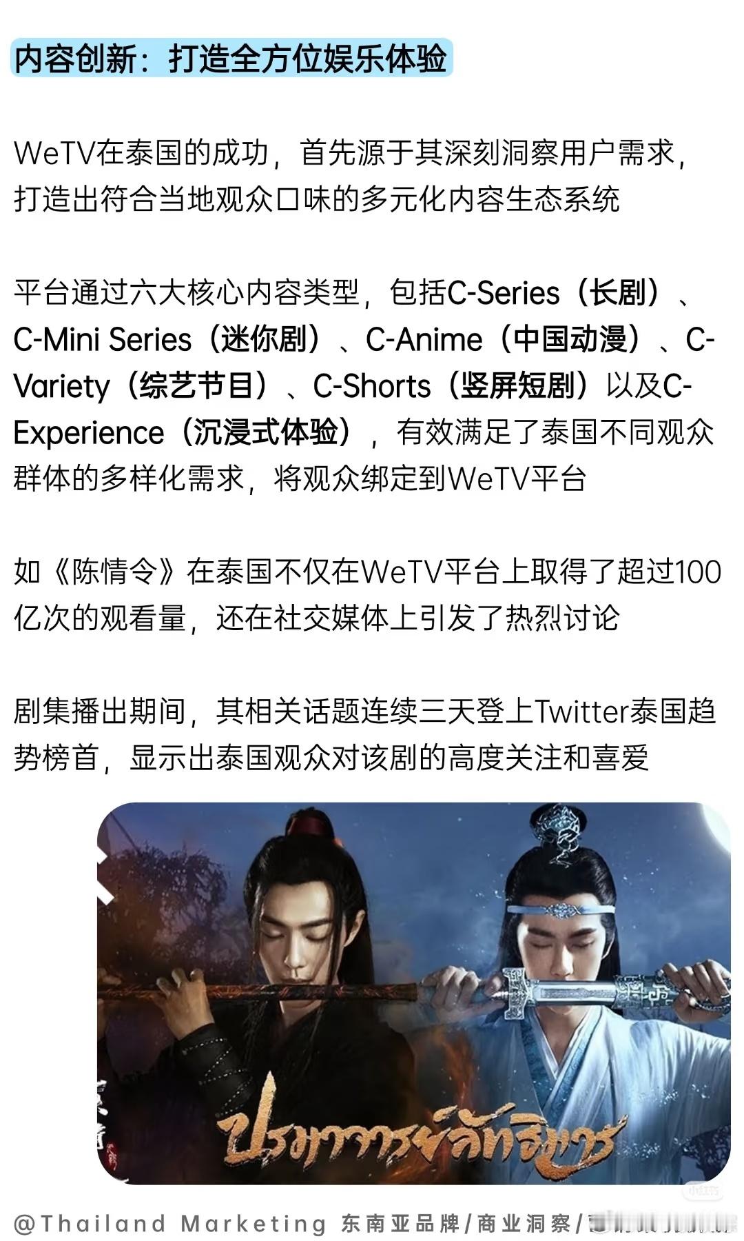 如《陈情令》在泰国不仅在WeTV平台上取得了超过100亿次的观看量,还在社交媒体上引发了热烈讨论