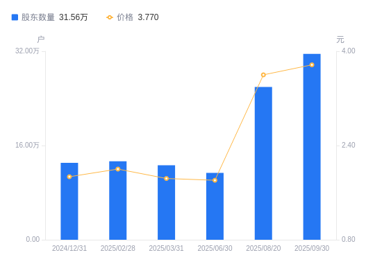 近一年(2024年9月30日至2025年8月20日),吉视传媒A股股东户数从9.27万户,增加至25.95万户,增幅179.83%,区间股价上涨160.87%。