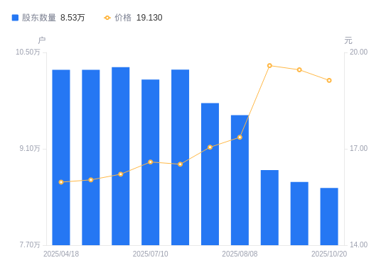 日期A股户数(户)流通A股户均持股数(股)户均持股市值(万元)2025-10-208530223303.2744.582025-09-308618523064.5244.882025-09-198791422610.9144.292025-08-089588320731.6835.992025-07-319764320358.0034.712025-07-2010251519390.4932.032025-07-1010105419670.8332.632025-06-3010286919323.7631.322025-05-3010246819399.3831.102025-04-1810248119396.9230.96