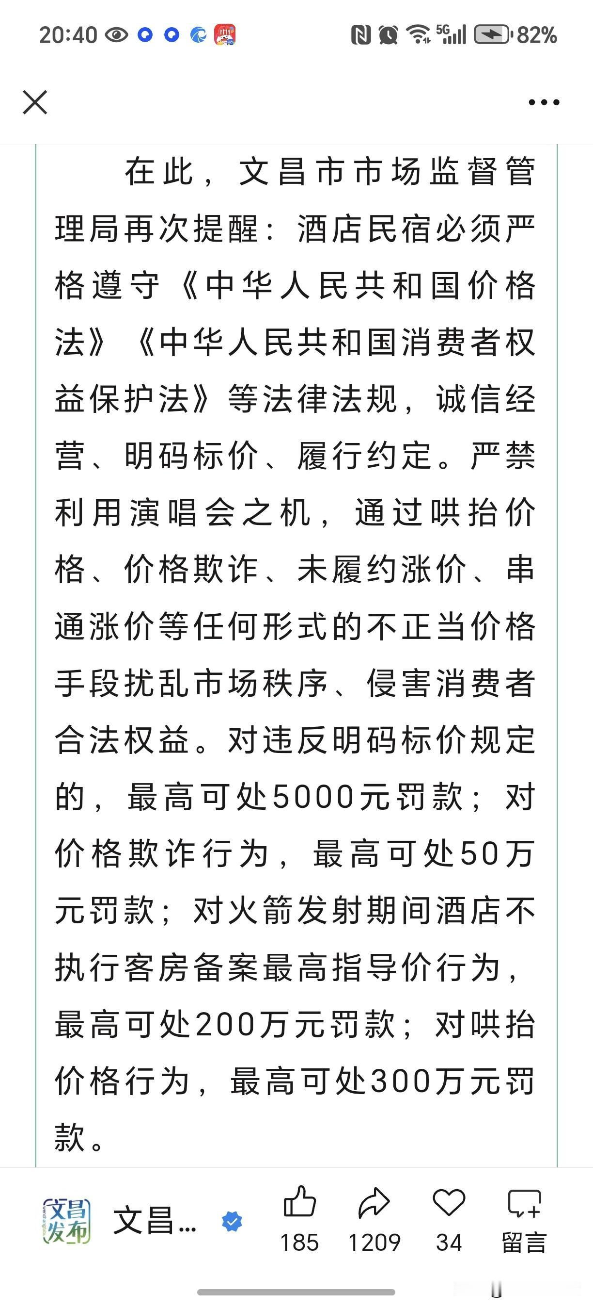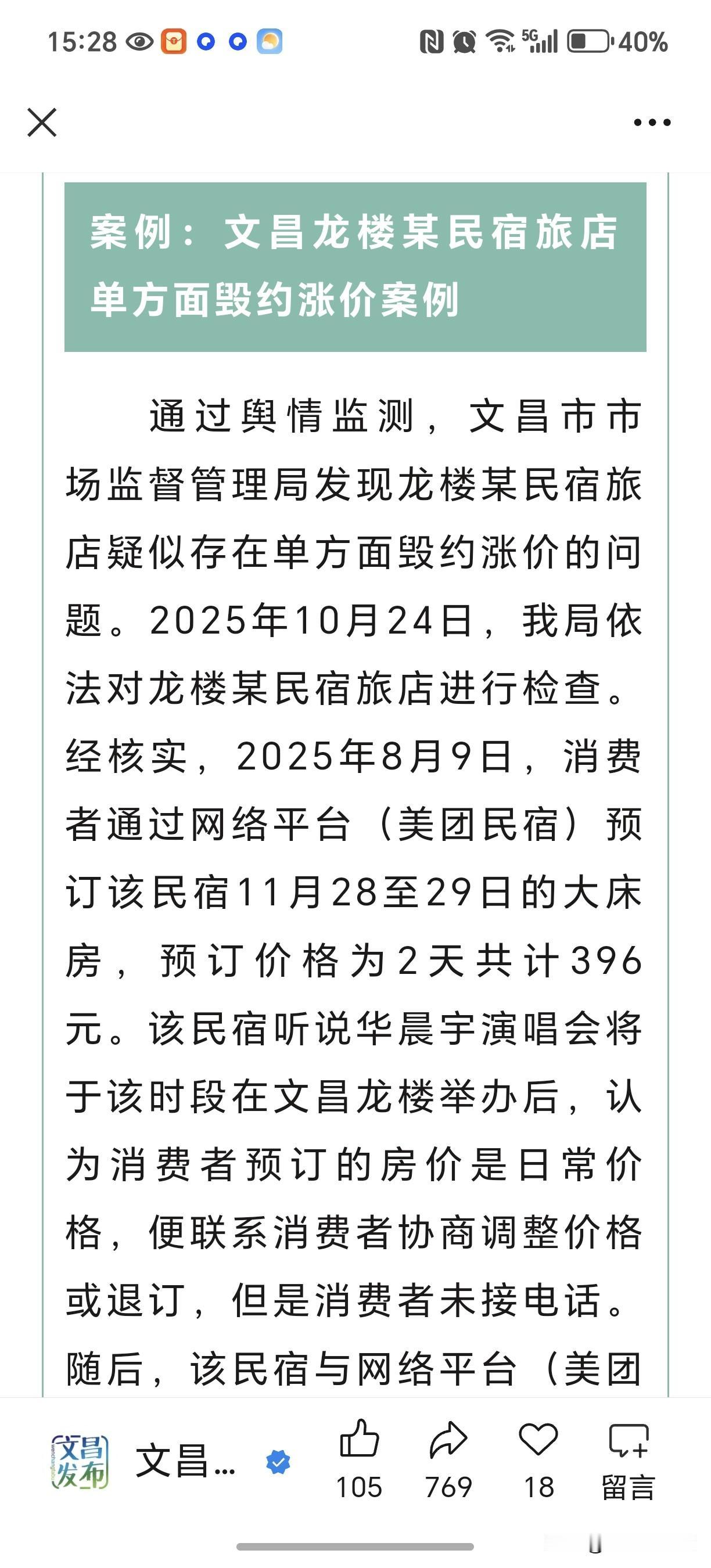 趁华晨宇来海南开演唱会,文昌某民宿吃相太难看,单方面毁约乱涨价被处罚。 该民宿平日不到200元/间的房价,涨至1350元/间。在11月28一29日两天已被网络提前数月预订出去的情形下,该民宿获悉华晨宇在该时段开演唱会,民宿遂生悔意进行毁约,公然违反价格法,构成单方面毁约违法行为,被行政执法部门拟罚3000元。 大快人心之余,感觉还是罚少了,还不够它涨价期间的两三间房价,违法成本太低,难怪如此肆意妄为。 文昌航天城周边的民宿酒店在演唱会时段涨价的绝不只是这一家。涨价可以理解,但要有个度,平时一两百,在那几天敢涨到一两千,十倍几十倍的涨价幅度,漫天的要价,那就搞的有些离谱了,是不? 到海南看华晨宇演唱会的歌迷来自全国各地,来一趟不容易,各位民宿酒店的老板注意下吃相不要难看,大家都懂得做生意不能一次性的,生财有道,细水长流,不要把自己的名声搞臭了,人家下回不来了,那就得不偿失了嘛。