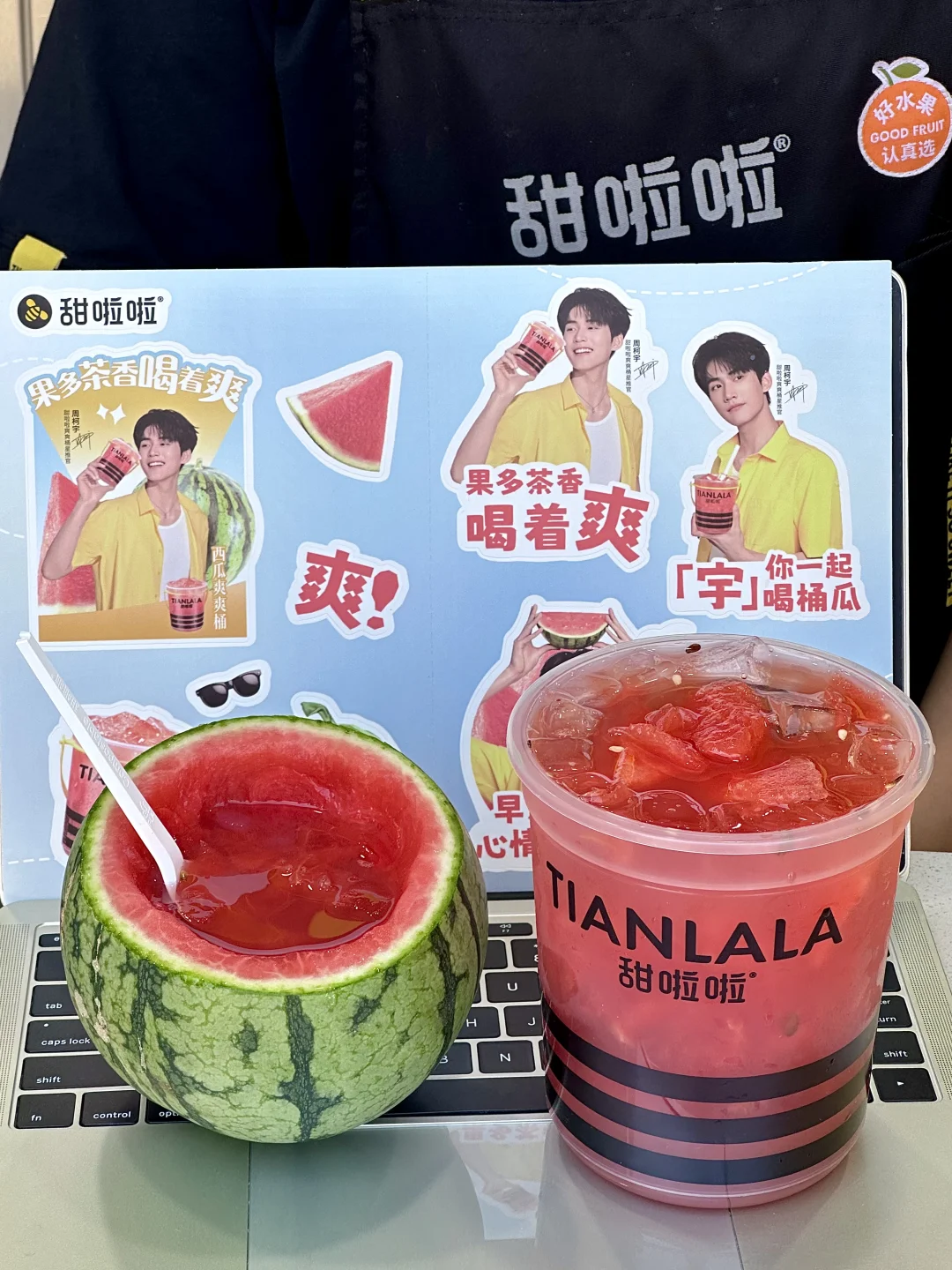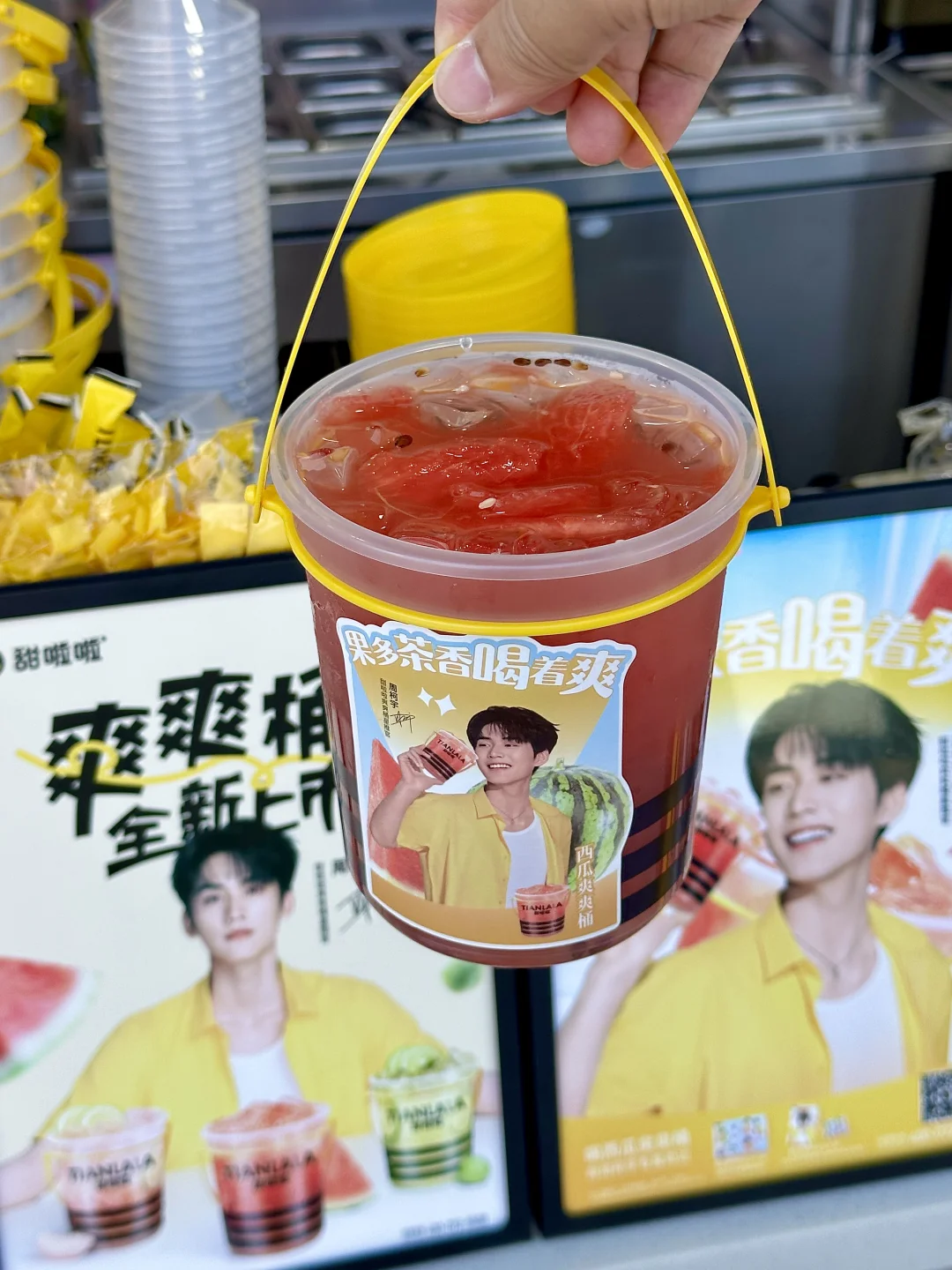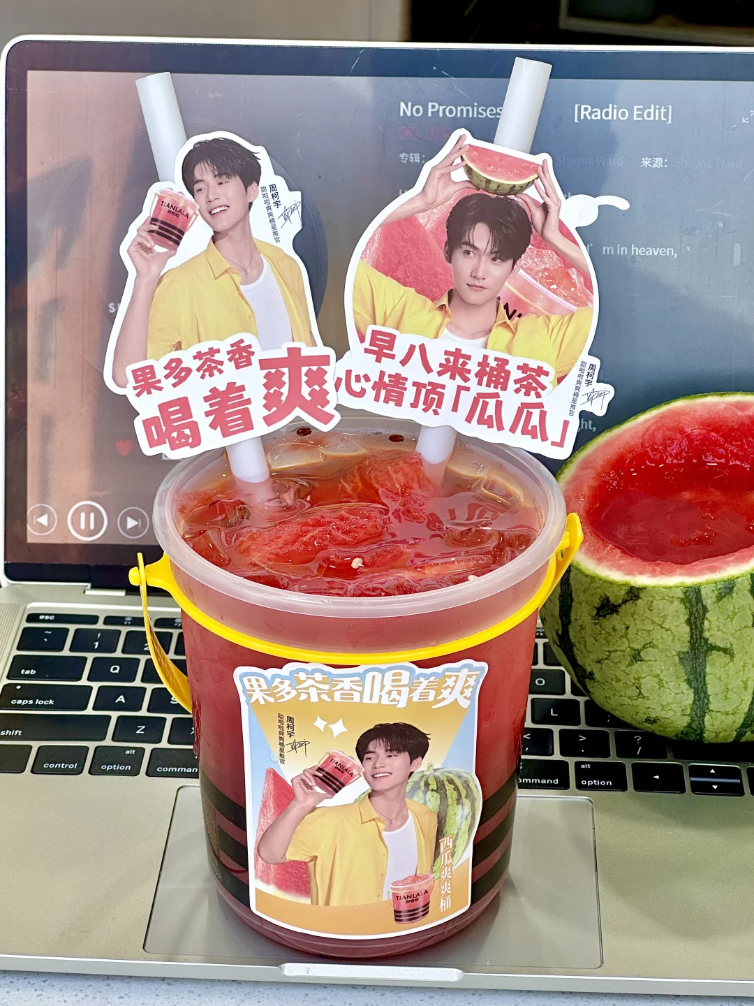甜啦啦真的很懂事,喝到了周柯宇同款! 喝完一整桶心情都好了😂😂hhh! 1L的大桶装西瓜爽爽桶,比我直接啃西瓜还爽!! 小🍊才9.9r!!!这谁能拒绝!! 清甜汁水+脆甜的果肉+茉莉绿茶茶汤+水晶冻 这个夏天抱着这桶喝,清爽解腻,也很适合跟闺蜜一起分享!!!