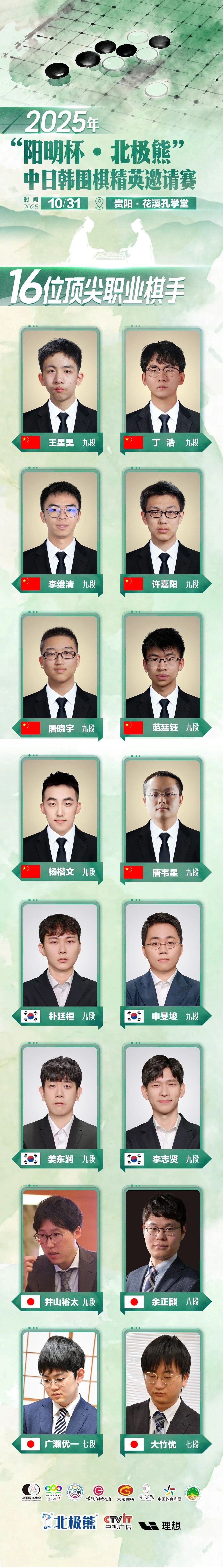 此次比赛汇聚了来自中日韩的16位顶尖职业棋手,中国棋手包括王星昊九段、丁浩九段、唐韦星九段、范廷钰九段、屠晓宇九段、许嘉阳九段、李维清九段和杨楷文九段;韩国队有朴廷桓九段、姜东润九段、申旻埈九段和李志贤九段;日本队则由井山裕太九段、余正麒八段、大竹优七段和广濑优一七段出战。