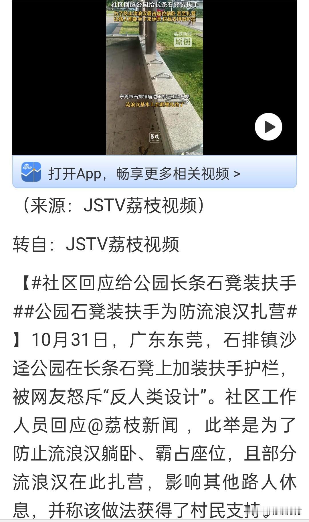 东莞一地给公园长凳加装扶手,有网友认为此举不够人性化,社区回应称装扶手是为了防止流浪汉长期占座,影响其他行人休息,且获得了村民支持。好象都言之成理。[大笑] 那么问题就归结为使用权的问题,流浪汉有没有权利使用长凳?根据社区工作人员的回应推测,应该是有的,只是不应该长期占用,霸座就影响了他人的权利。最近流行一个说法叫“幸福者退让原则”,具体到这件事,就是说来游园的行人相对流浪汉来说生活更富足充裕,长凳对流浪者所起的作用更重要,让他们使用所产生的整体社会功利更大,所以不装扶手才更为合理。 人有旦夕祸福,此事古难全。善待他人,也是善待我们自己。[握手]公园休闲凳 公园长凳