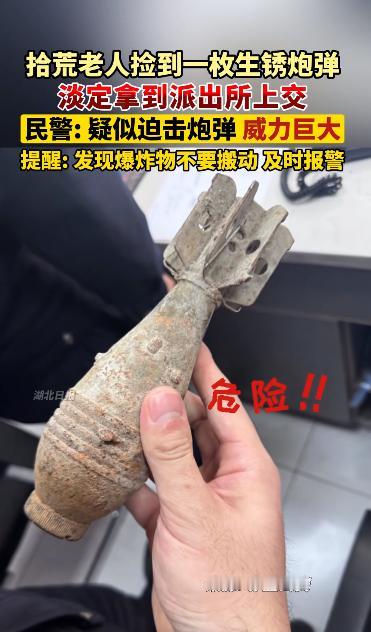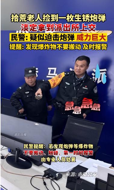 这位大爷的操作着实让人捏了把冷汗!10月27日,湖北赤壁,一大爷在收废品时,意外发现了一枚炮弹,他没有立刻报警,反而是拿着这枚炮弹直接跑到了派出所上交!民警听到大爷的话后吓了一跳,连忙让所有人赶紧撤离。 10月27日那天,湖北赤壁,一位收废品的大爷在砖厂煤灰堆里翻找废品时,突然摸到个沉甸甸的铁家伙,仔细一瞧这玩意儿一头尖一头圆,锈迹斑斑的看着就不像普通废铁。 大爷心里咯噔一下,凭着多年收废品的经验,他判断这很可能是枚炮弹,按理说遇到这种情况正常人的反应应该是赶紧躲远点,然后报警等专业人员来处理,可这位大爷的操作着实让人捏了把冷汗。 他二话不说直接把这枚疑似炮弹的东西抱在怀里,然后淡定地朝派出所走去,一位老人家抱着个可能随时爆炸的炮弹,穿街过巷路过的行人谁也不知道,自己刚刚和死神擦肩而过。 大爷走进派出所大门,对着值班民警说:同志,我来上交个炸弹,话还没说完就将手里的东西塞给了值班民警。 民警定睛一看手里的物件,当即吓出一身冷汗,真的是个炮弹,整个派出所的气氛瞬间凝固了。 民警随后立即组织所有人员撤离到安全区域,并紧急联系排爆专家,整个派出所顿时忙成一团,现场被迅速封锁。 排爆专家赶到后经过专业鉴定,确认这是一枚抗战时期遗留的迫击炮弹,虽然在地下埋了几十年,外壳锈蚀严重,但内部的引信和炸药仍然存在,稍有不慎就可能引发爆炸,专家们小心翼翼地将炮弹转移,最终安全处置。 事后了解到这位大爷当时的想法很简单,这东西留在外面是个隐患,万一被不懂事的孩子捡到玩后果不堪设想,报警的话还得在原地等着,不如自己送过去省事。 这种朴素的想法让人哭笑不得,大爷的出发点是好的,想为社会排除隐患,但这种处理方式实在太危险了。 据公安部门统计,近年来各地发现战争遗留弹药的案例并不少见,2023年江西某村民挖地基时发现手榴弹,山东农民翻地时挖出炮弹,广东工地施工时发现炸弹,这些沉睡在地下的定时炸弹,随时可能因为外力作用而爆炸。 专业排爆人员介绍,这类老旧弹药经过长期埋藏,内部化学成分会发生变化,变得极不稳定,温度变化、震动、摩擦都可能引发爆炸,有些炮弹的引信已经锈蚀,轻微碰撞就可能触发。 这事被传到网上后,网友们对大爷的行为也捏了一把冷汗,有网友调侃道:您大爷还是您大爷,这心理素质没谁了,也有网友评论道:这是抱着移动炸弹在逛街啊,万一路上摔一跤,后果不敢想象。 还有网友调侃:钓鱼佬除了鱼啥都能钓上来,收废品大爷除了废品啥都能收到呢。 玩笑归玩笑这件事给大家上了一堂生动的安全教育课,遇到可疑爆炸物,正确的做法是:不触碰、不移动、立即远离现场、及时拨打110报警,千万不要自作主张去搬运,更不要出于好奇去敲打或拆解。 这位大爷的热心肠值得肯定,但安全意识还需要加强,幸运的是,这次有惊无险,没有造成任何伤害,但我们不能总指望运气好,生命安全容不得半点马虎。 下次再遇到类似情况,记住保护自己和他人的安全永远是第一位的,让专业的人做专业的事,这才是对生命最大的尊重。 麻烦看官老爷们右上角点击一下“关注”,既方便您进行讨论和分享,又能给您带来不一样的参与感,感谢您的支持!