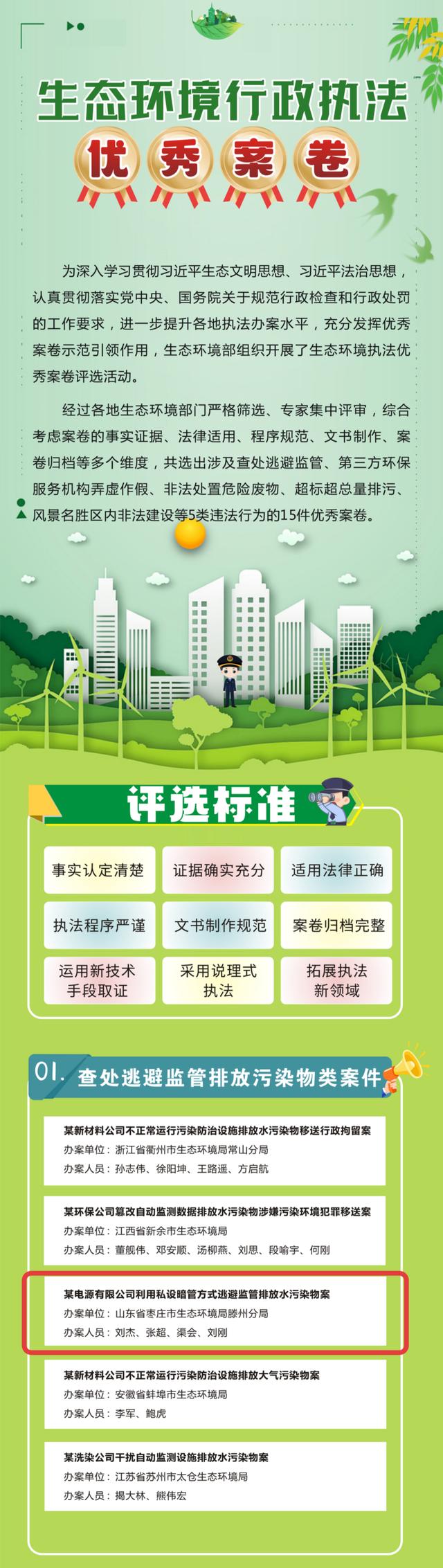 10月30日,枣庄市生态环境执法工作再传捷报!市生态环境局滕州分局主办的“某电源有限公司利用私设暗管方式排放水污染物案”,从全国众多案件中脱颖而出,被生态环境部评为全国生态环境行政执法15件“优秀案卷”之一,为山东省唯一入选案卷。这也是继2022年枣庄市案卷荣获省司法厅“全省十佳行政执法优秀案卷”(第二名)后的又一殊荣,标志着枣庄市生态环境执法水平迈上新台阶!