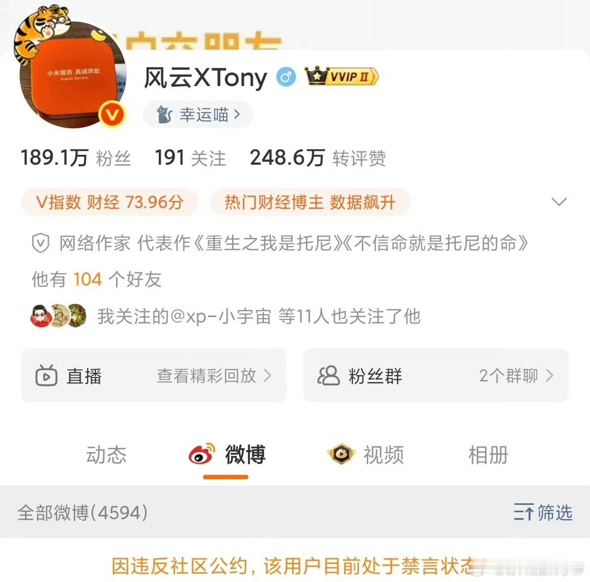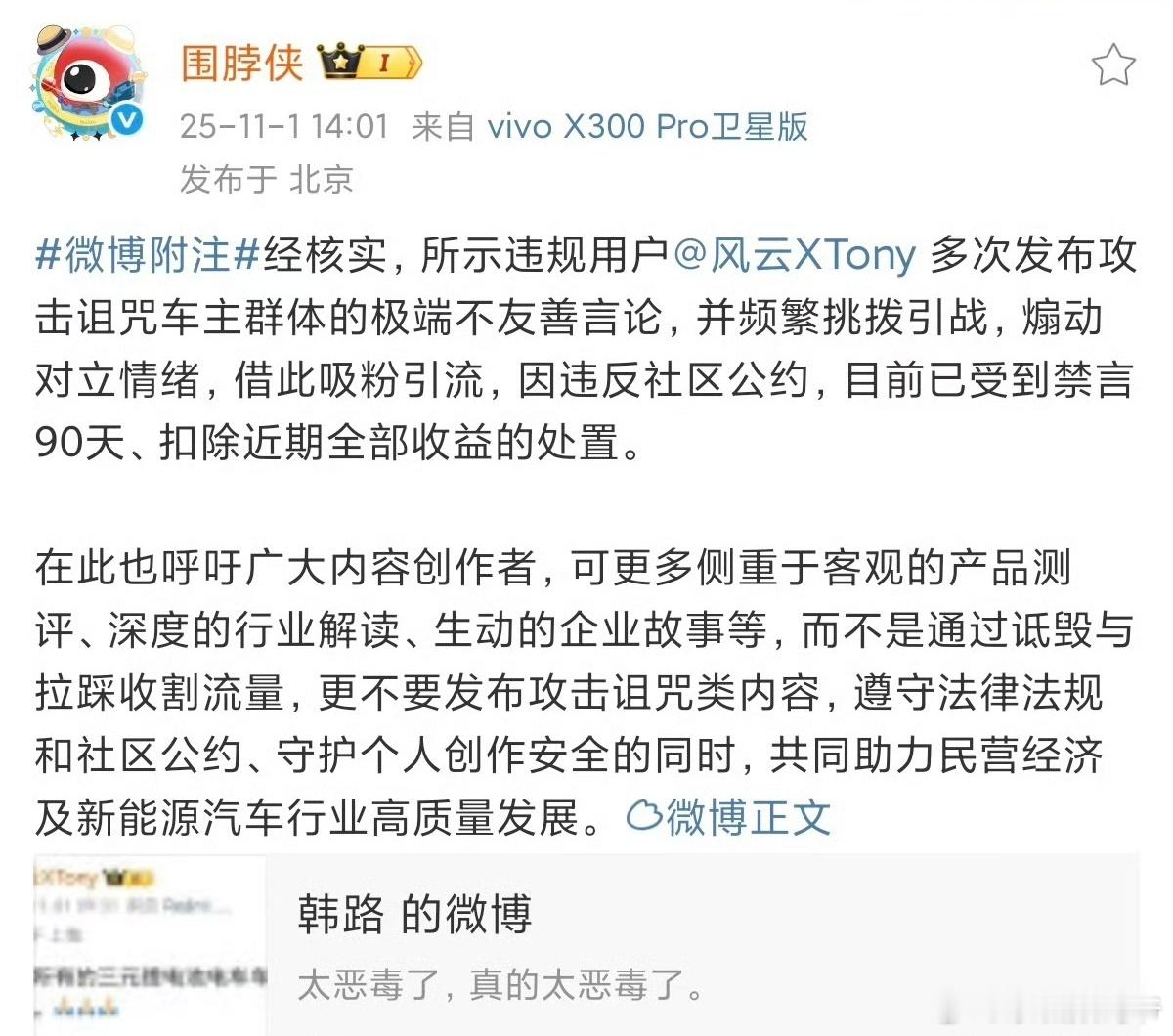 “风云XTony”因频繁引战、煽动对立,被禁言90天。