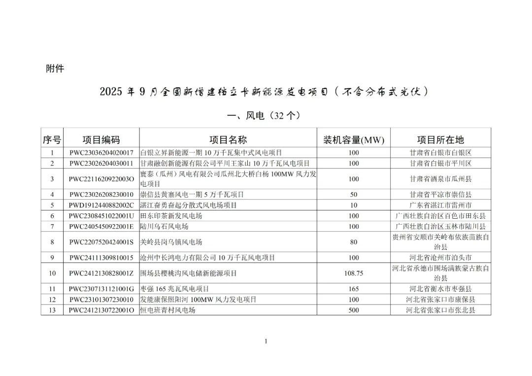 关于2025年9月全国新增建档立卡新能源发电(不含户用光伏)项目情况的公告