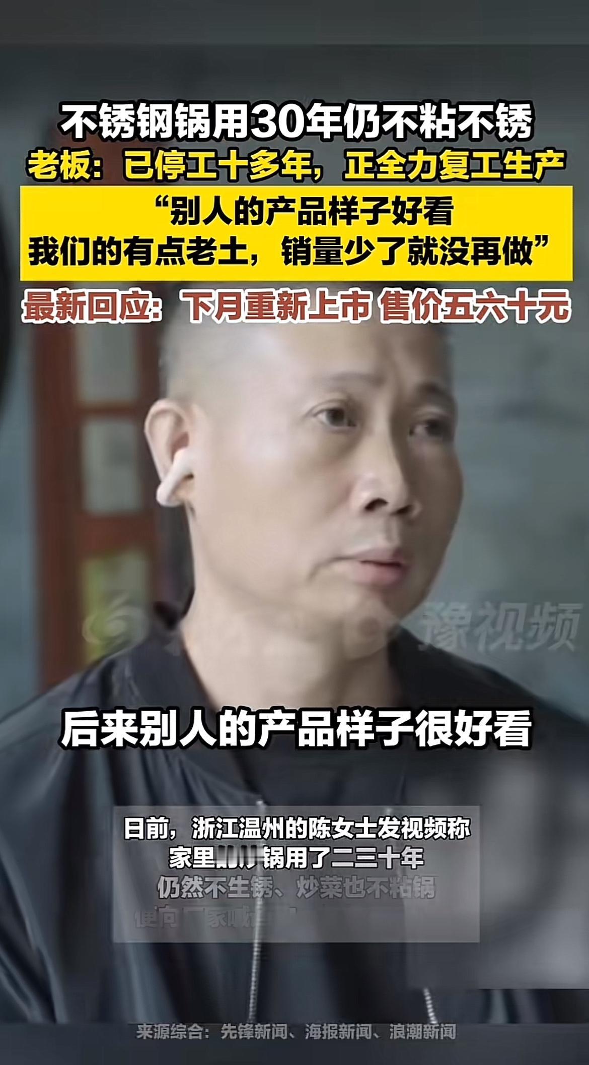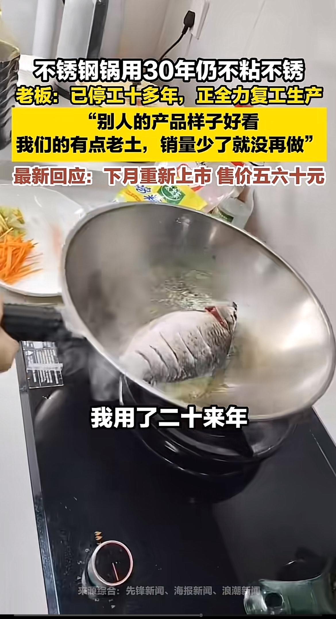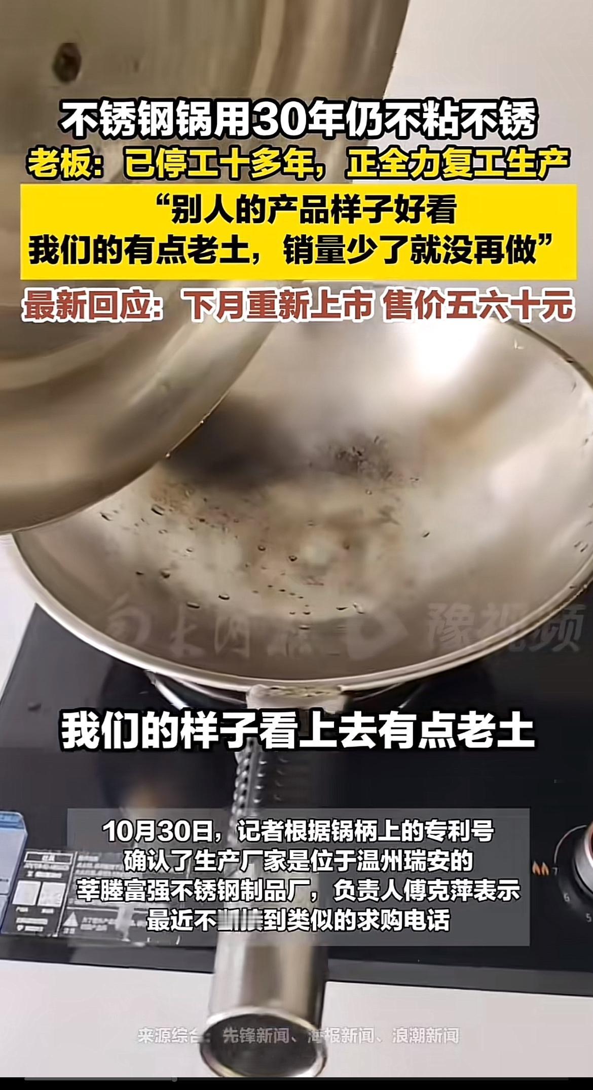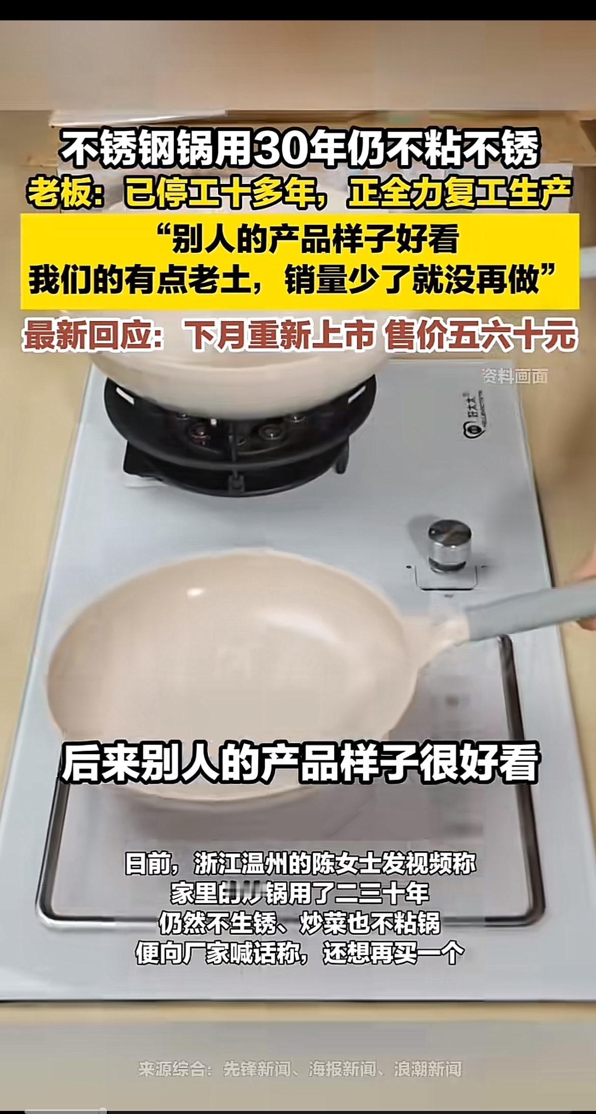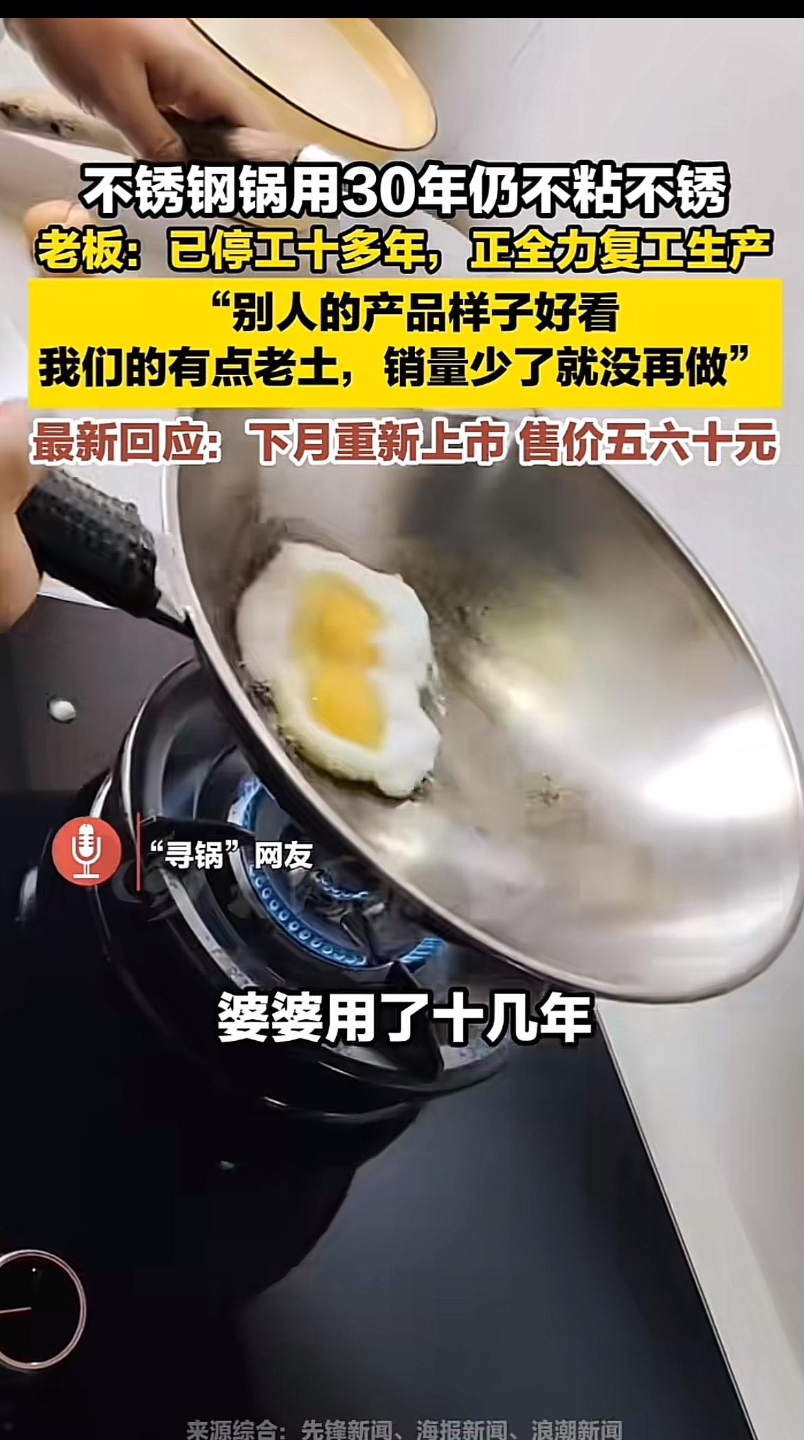 最近一口30年如新的不粘锅爆火了。浙江温州陈女士晒出用了30年的不锈钢锅,不粘没锈,视频点赞超40万、阅读破2000万。这锅的厂家浙江瑞安市莘塍富强不锈钢制品厂,其实已停产十多年。老板傅克萍被无数求锅电话“轰炸”后,决定复产。原来老锅是手工锤打,后来机器生产,因销量不好才停产。现在新锅厚度从0.8毫米加到1.1毫米,焊接工艺也升级,价格只要60元左右。有人说现在东西用半年就坏,这锅却能用三十年还能传代。厂家还会附赠使用教程,这哪是锅啊,分明是对“匠心”的传承!