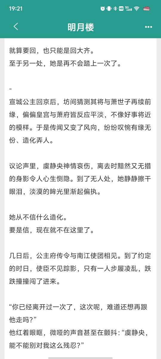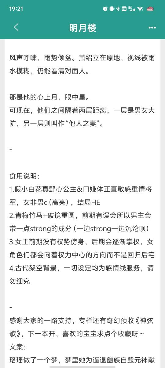 《明月楼》by织隅 刚完结的文,一共133章 青梅竹马,破镜重圆 女主是齐国公主,男主是世子,俩人从小一起长大,青梅竹马。一次吵架后,男主上门求和,却得知女主即将去南江国和亲。男主不愿,却也没有办法。五年过去,女主和丈夫感情并不好,一直居住在行宫。有戎狄来袭,王室纷纷出逃,却没有人知会女主一声。女主颠沛流离,逃回故国,遇到了在边地的男主。南江派人来接女主回去,女主不愿。过了几日,收到回京的圣旨,女主稍微安了心。男主对于女主抛弃自己远嫁和亲之事耿耿于怀,其实女主和亲之事另有隐情。
