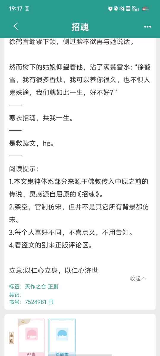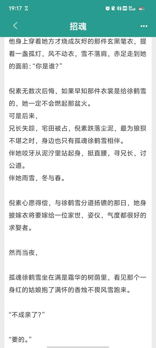 古言救赎文||《招魂》 by山栀子[搜索高亮] 23年完结的文,一共137章 落魄的闺阁小姐X死去的少年将军男女主相互救赎,前期男主陪伴女主为哥哥申冤,后期女主陪伴男主为死去的三万冤魂索要清白,温馨中带着感动的文章。 ps:男主可以算是有一点点小法术,但是用了以后会让自己受到反噬,反噬严重的话就会变成一团近似透明的小尾巴。