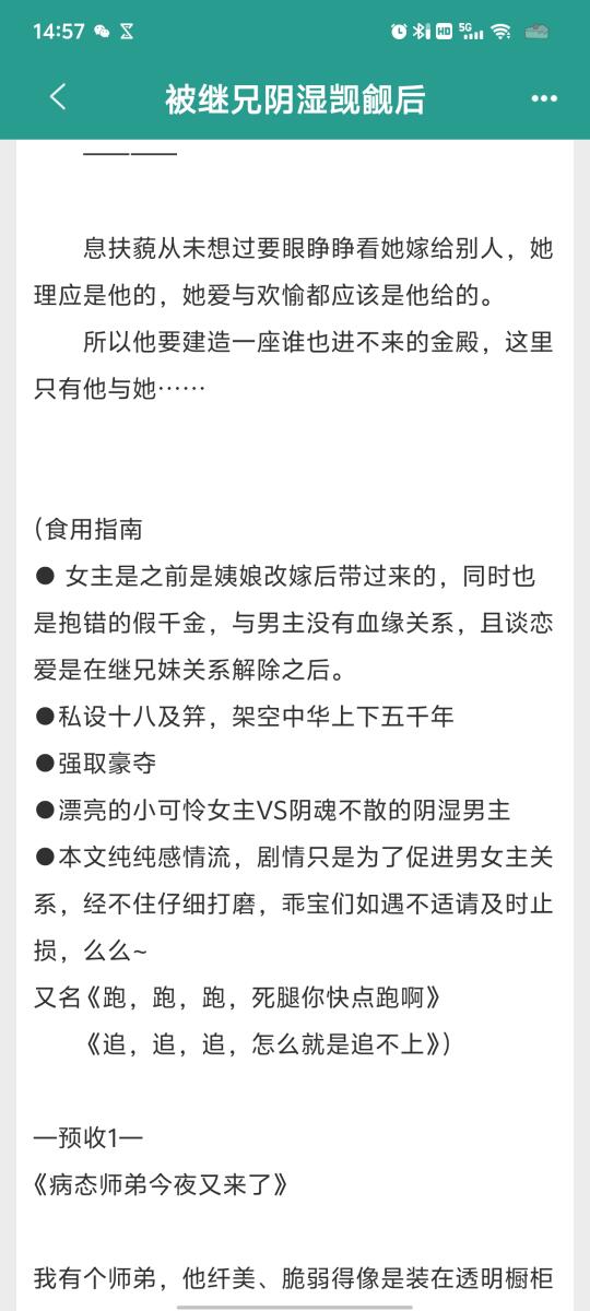《被继兄阴湿觊觎后》作者:妖妃兮 刚完结的文,一共76章 小白花妹妹vs阴湿病娇兄长 伪骨科,强取豪夺