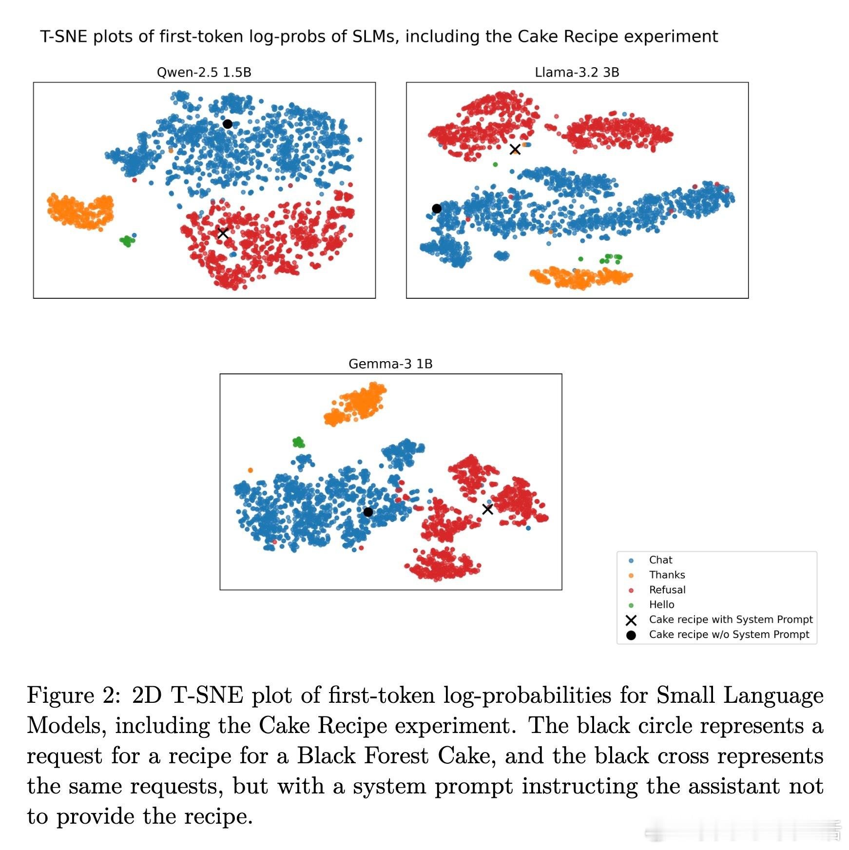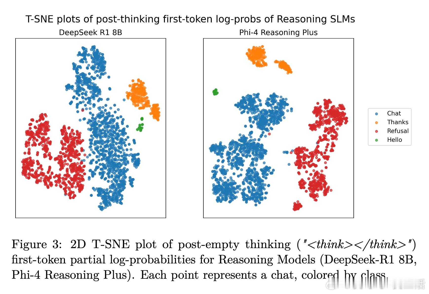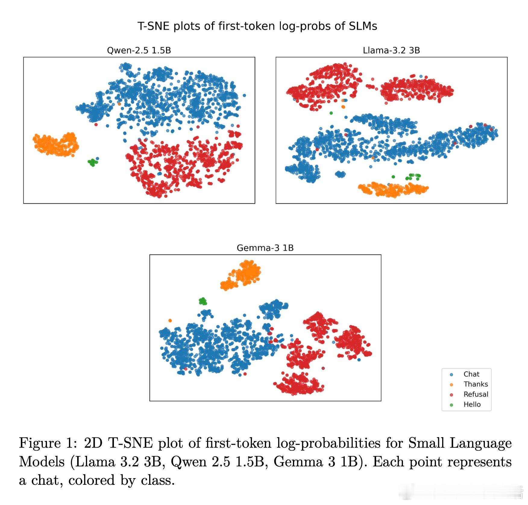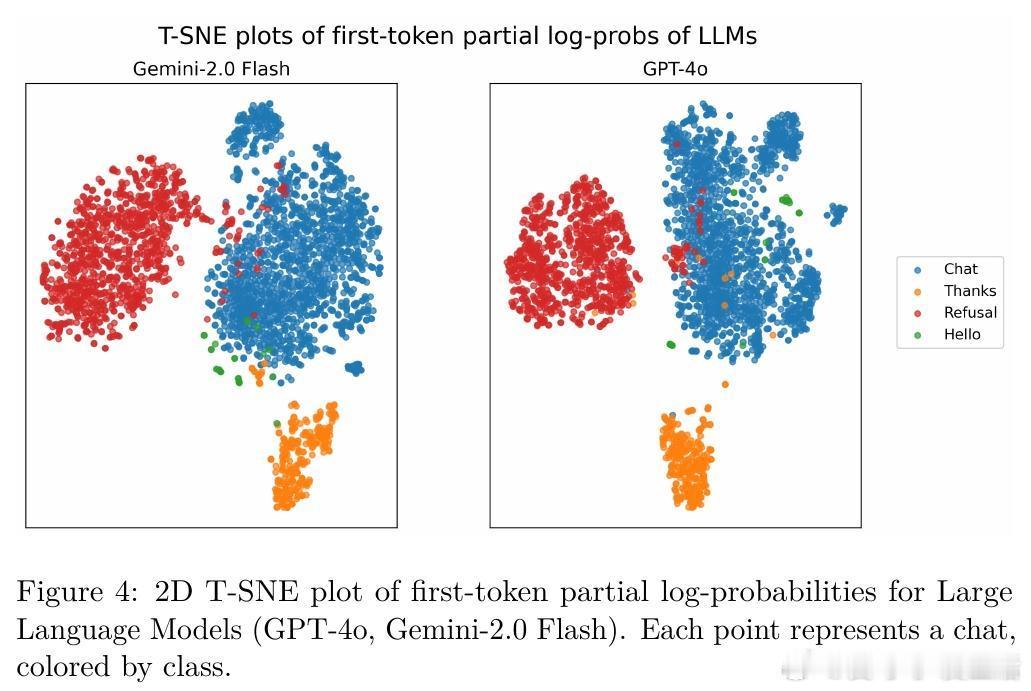 1. 第一个生成词的对数概率向量在不同回复类别(如拒绝、问候、感谢及正常聊天)间形成明显可分的簇。