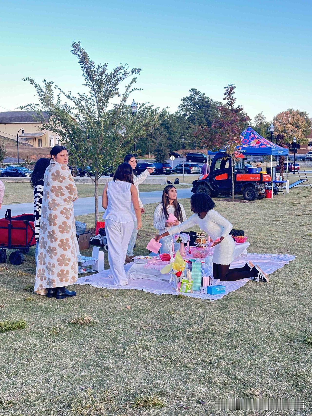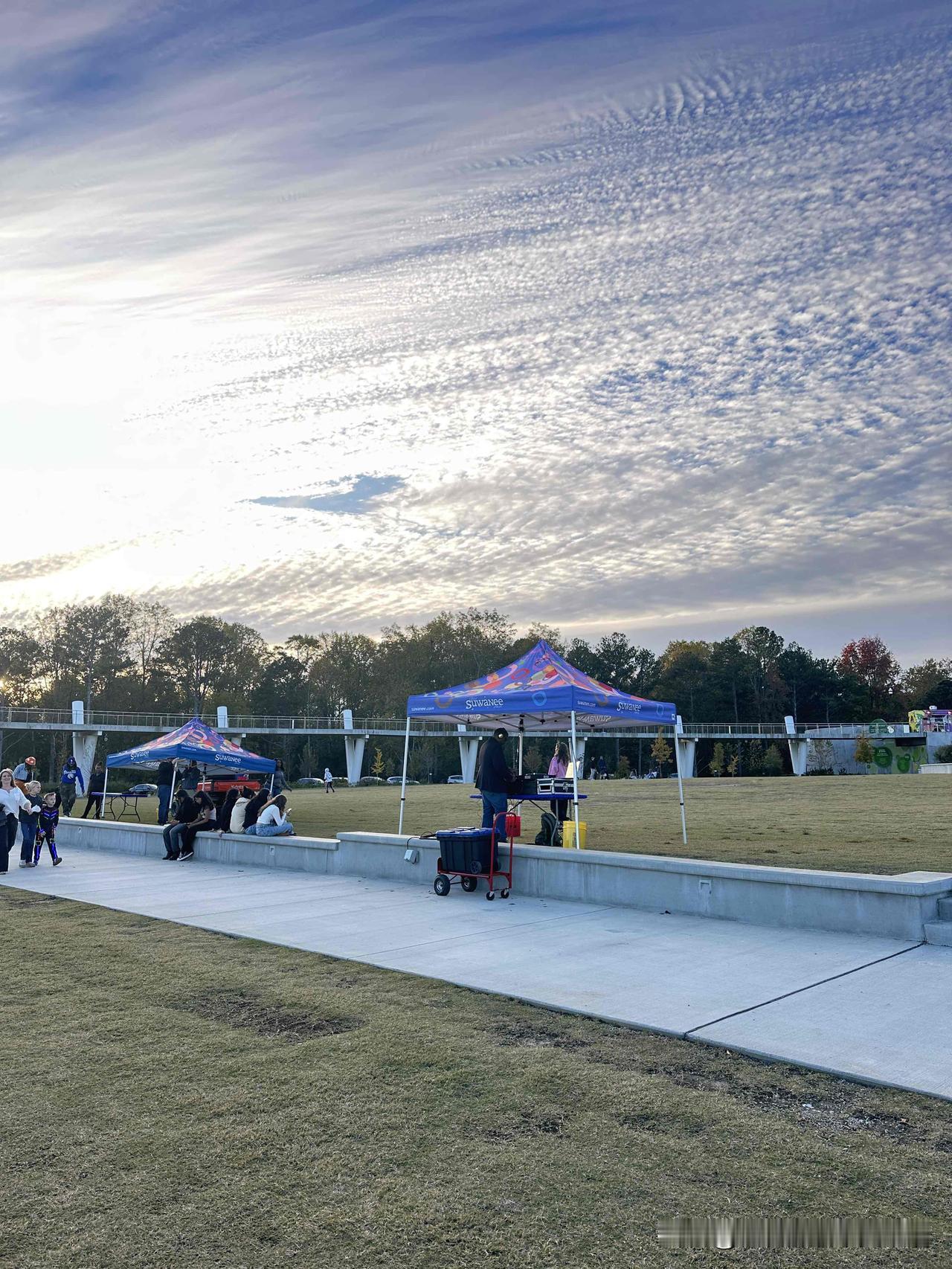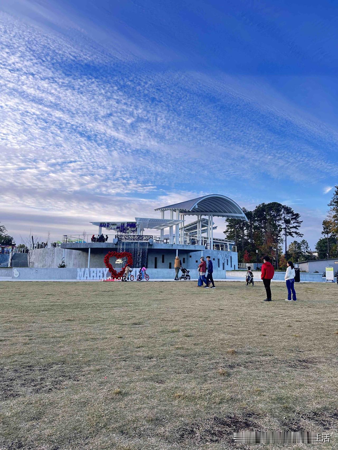 我每天傍晚都和老伴到这个城市广场来走路, 今天是周末,这里相对平时人就多一些,自然也就比较热闹。 天空蓝得画布似的,把城市广场衬得特别温柔。 广场上,一大簇红玫瑰扎成的爱心特别显眼,“MARRY ME”的灯牌在余晖里亮闪闪的,红地毯两边的蜡烛立在那儿,好像在等一场浪漫的求婚仪式开场。不远处的现代建筑前,瀑布哗哗流着,给这浪漫劲儿又加了点灵动。 草坪上,一群年轻漂亮的姑娘,估计是伴娘团,围着粉色餐布忙活着。她们摆着甜点、鲜花,脸上满是期待的笑,像是在给即将到来的婚礼准备一场温馨小聚会。彩色气球在晚风里轻轻晃,和旁边彩色帐篷下的人影凑在一起,这里估计是宾客签到处。 广场其他地方也挺热闹,有人在喷泉边溜达,有人在活动摊位前看看,还有带孩子的家庭在草坪上玩。那座现代感的白色桥梁跨在水面上,喷泉的水珠在夕阳下闪着光,整个苏瓦尼的傍晚,都被这幸福的筹备填得满满的。 这就是美国一个城市平凡而又祥和的周末傍晚。
