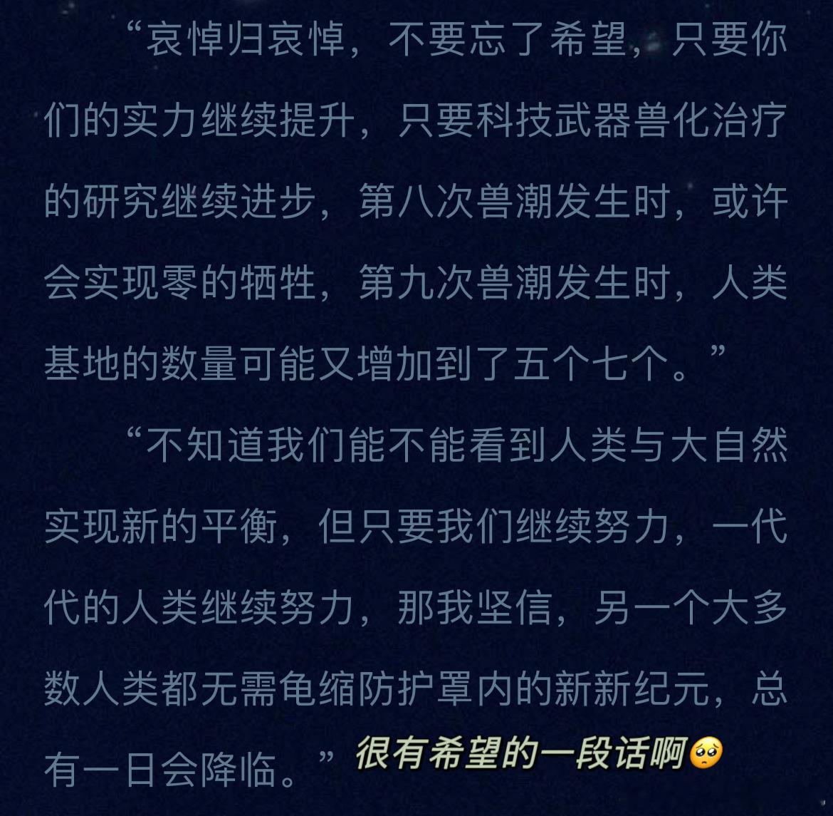 世界观方面属于一种对未来充满期待的开放式吧,直到文章的最后人类也依然和异兽保持一种僵持不下的状态。但正如文中所说的,人类的伤亡在随着越来越多的异能者出现而减少也许终有一日会重新夺回这片天地。