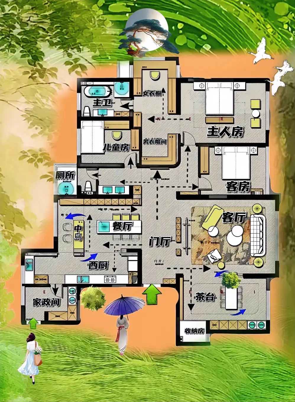 158㎡这给调教的,浑身是活,底层的逻辑是,公区尽量打墙,做开放,私区的门,物理上隐形,全屋看不见门的那种感觉,形象比喻叫家徒四壁风!