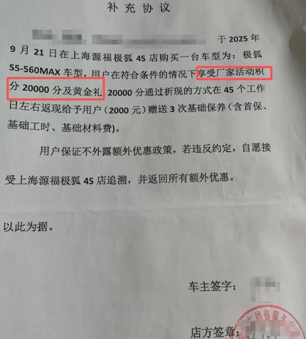 陈先生介绍,2025年9月,他在上海嘉定源福4S店购置了一辆极狐S5,目前车辆已行驶2500公里。购车时,店内销售明确承诺将赠送一份约1克多的黄金礼,且该赠送内容已写入购车补充协议。