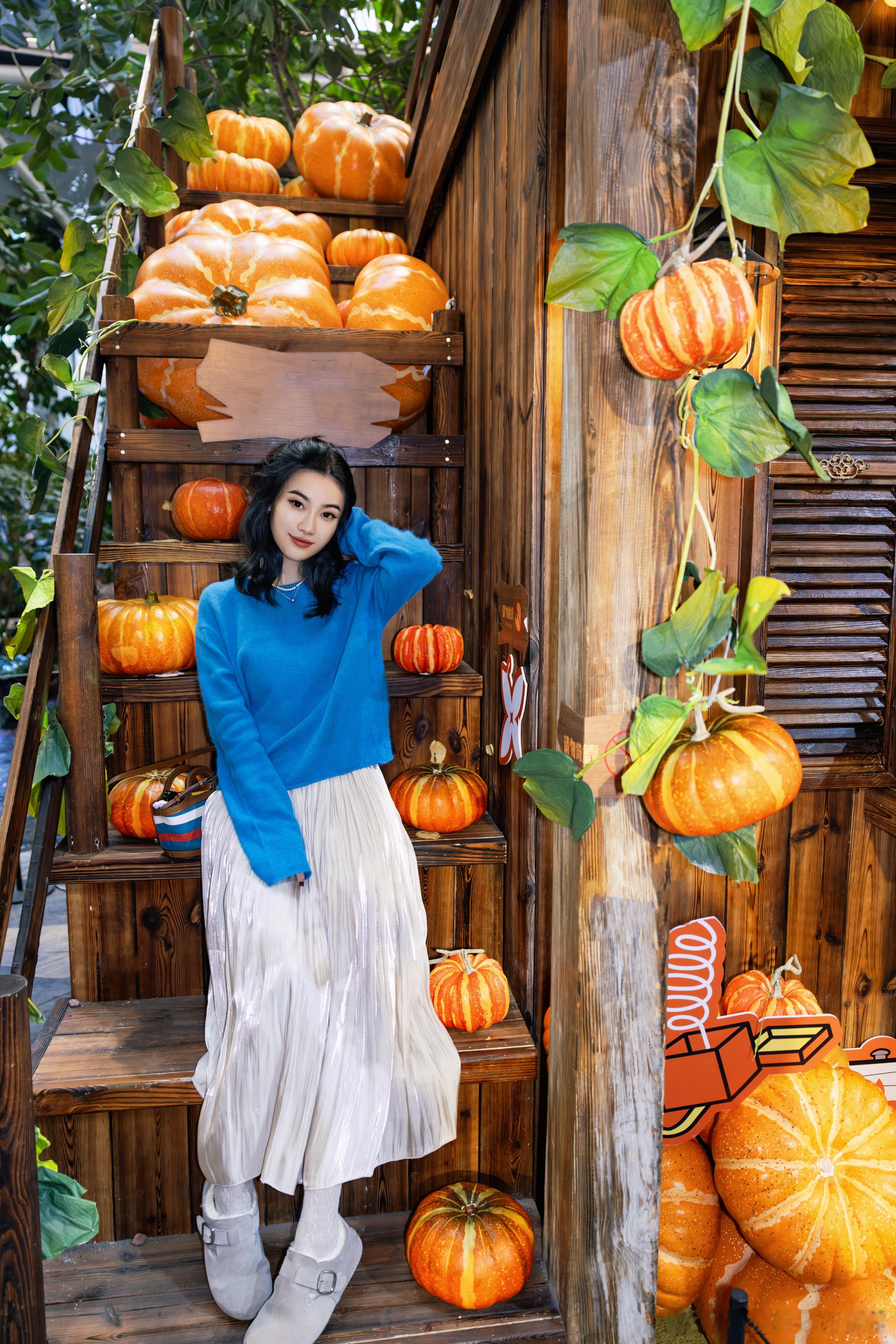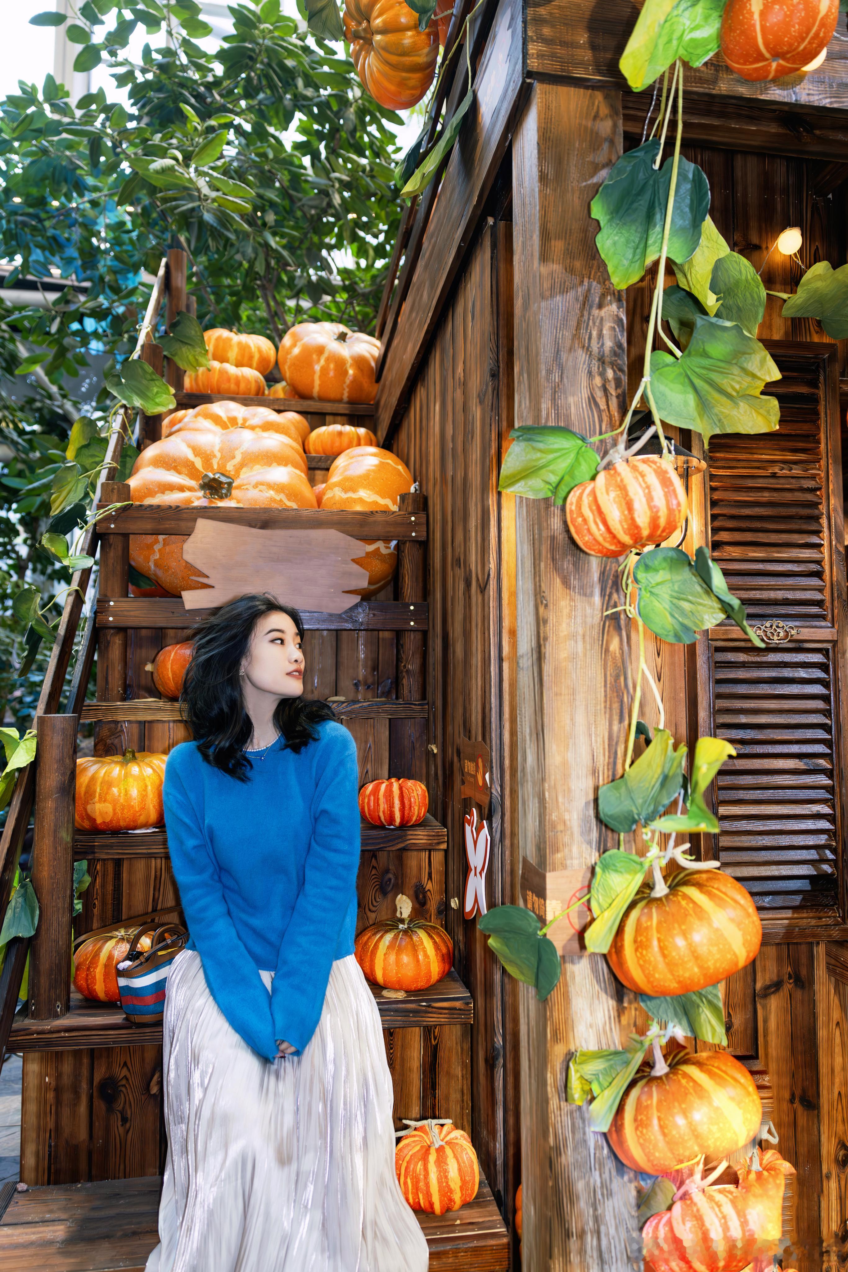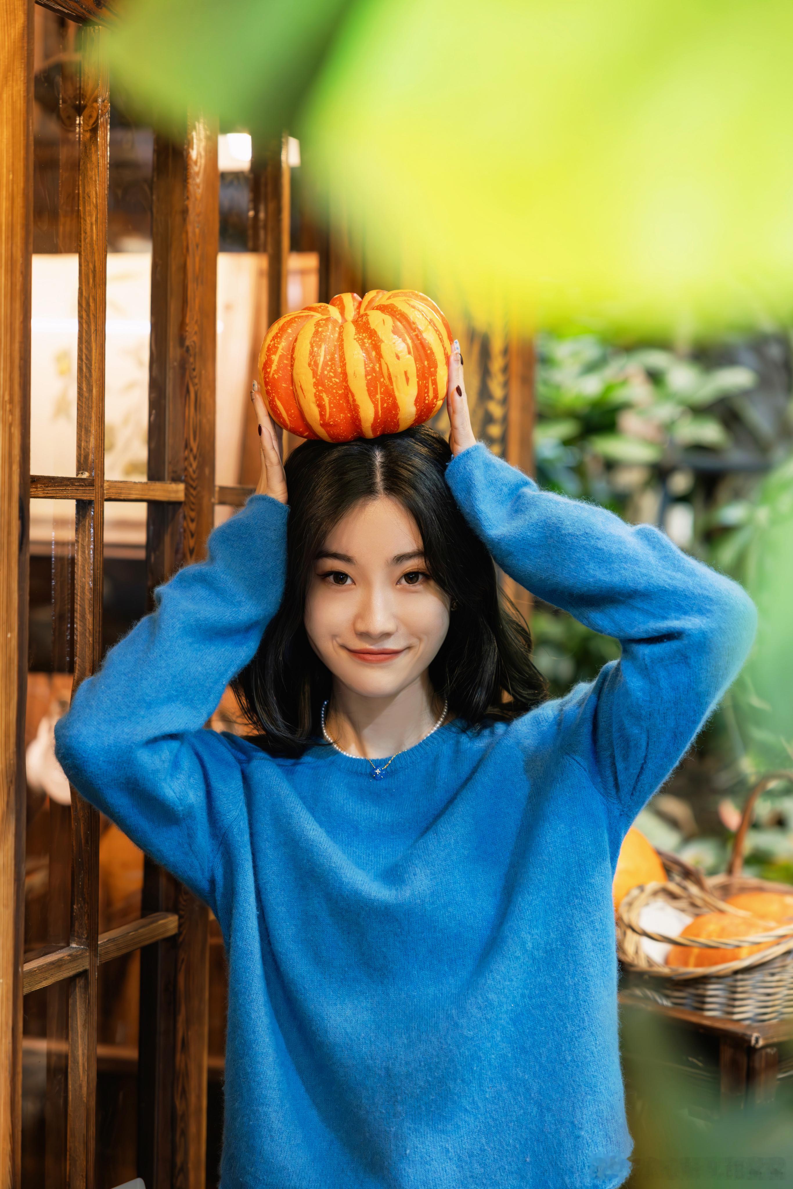 这件蓝色毛衣和万圣节南瓜真是配一脸✌️