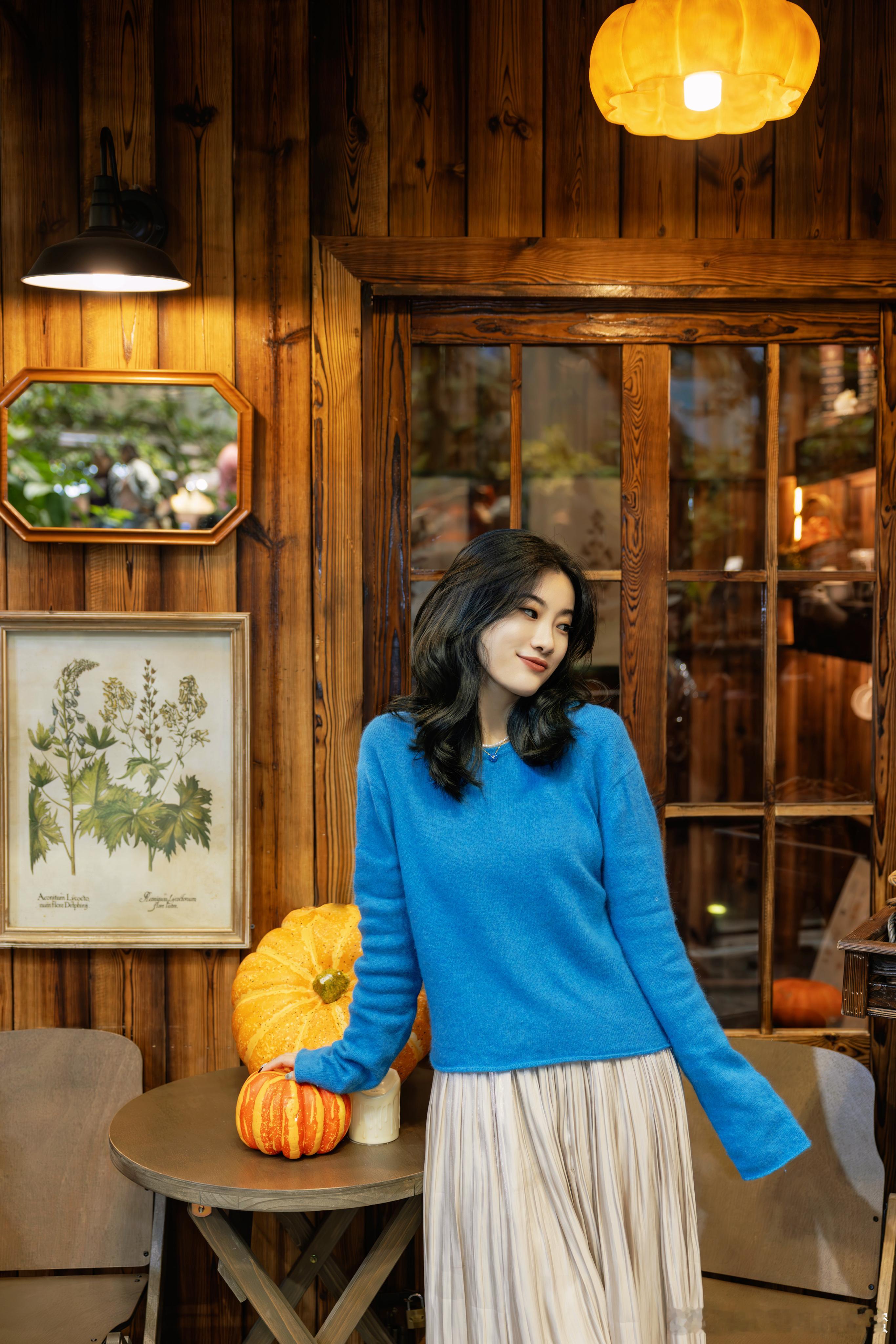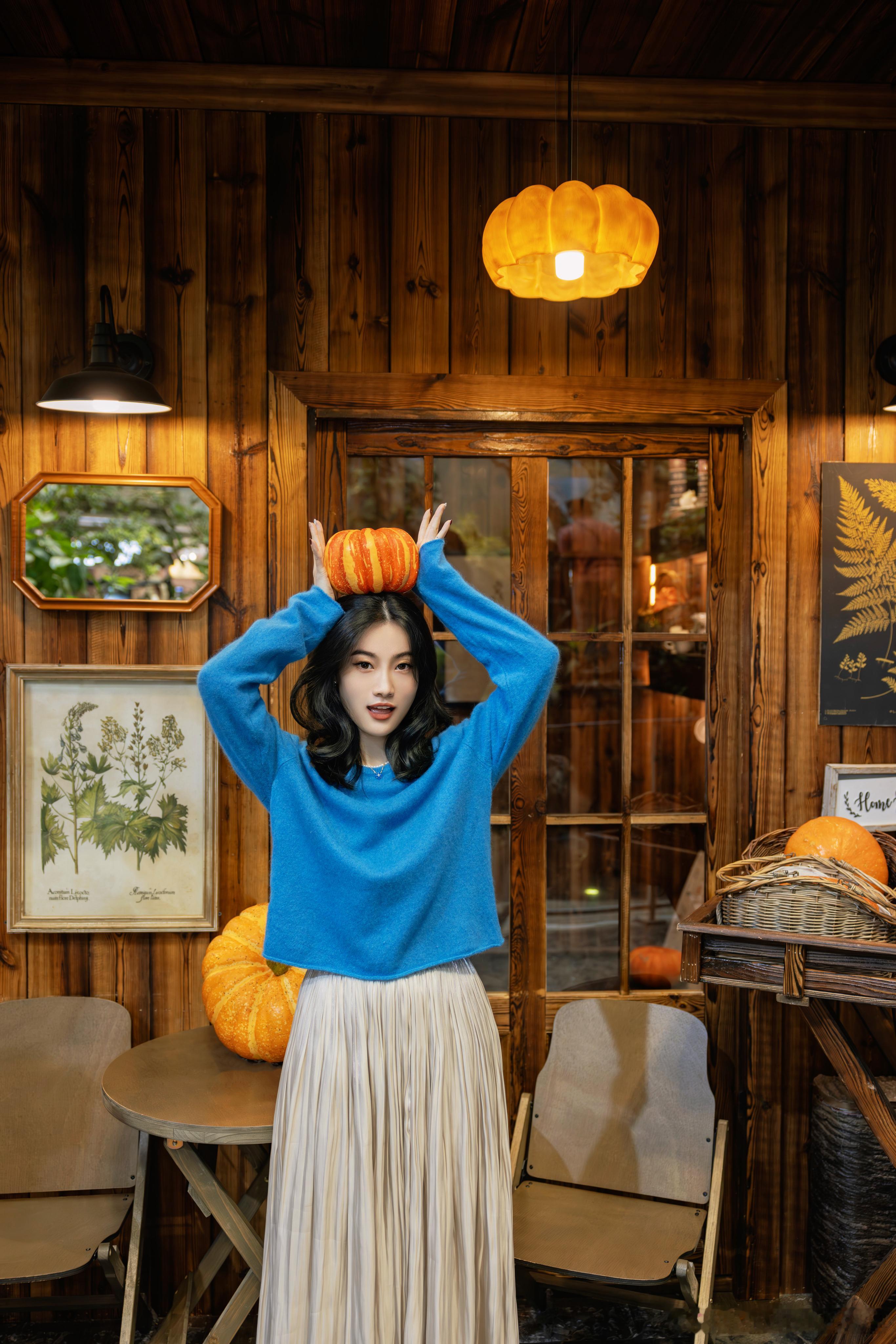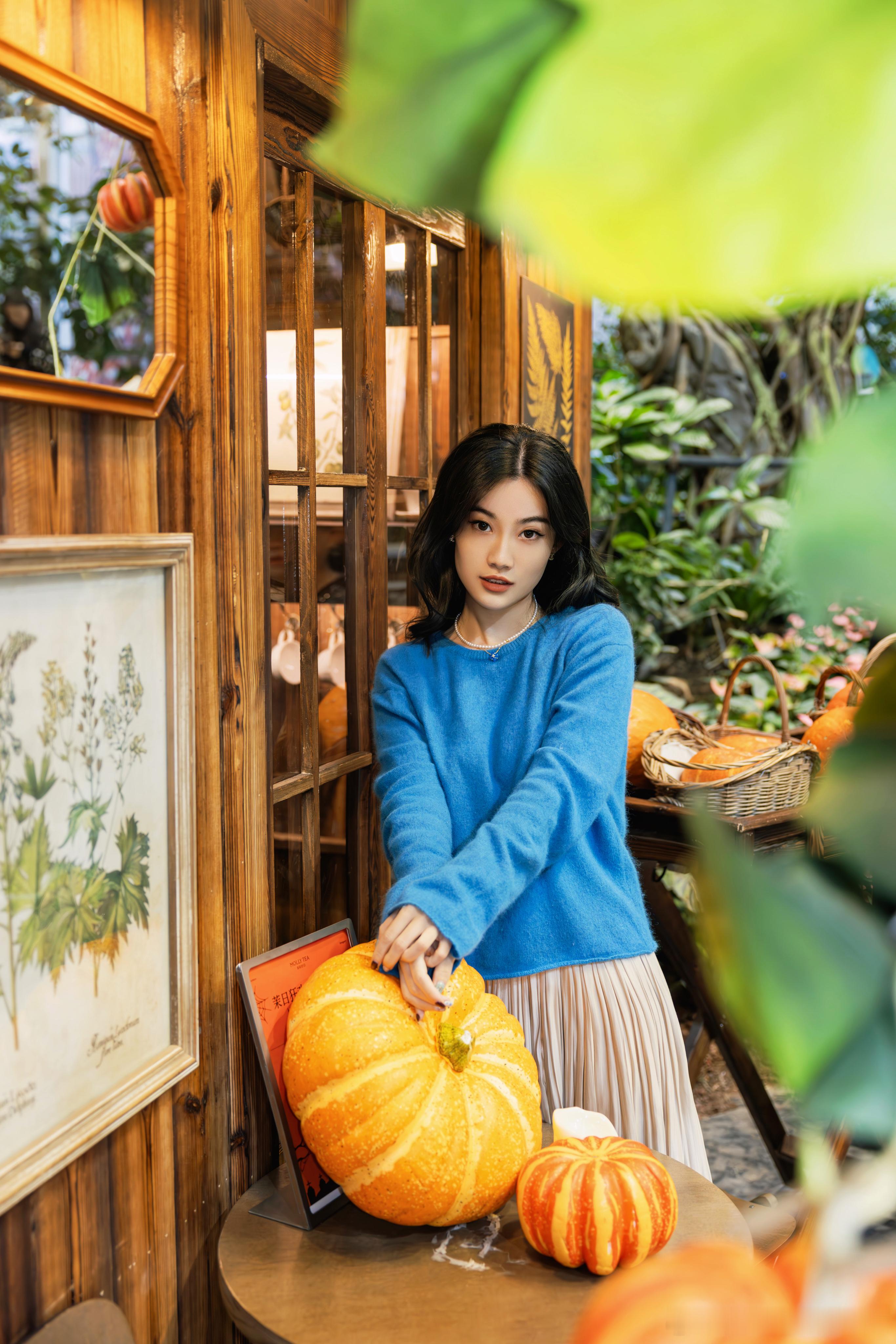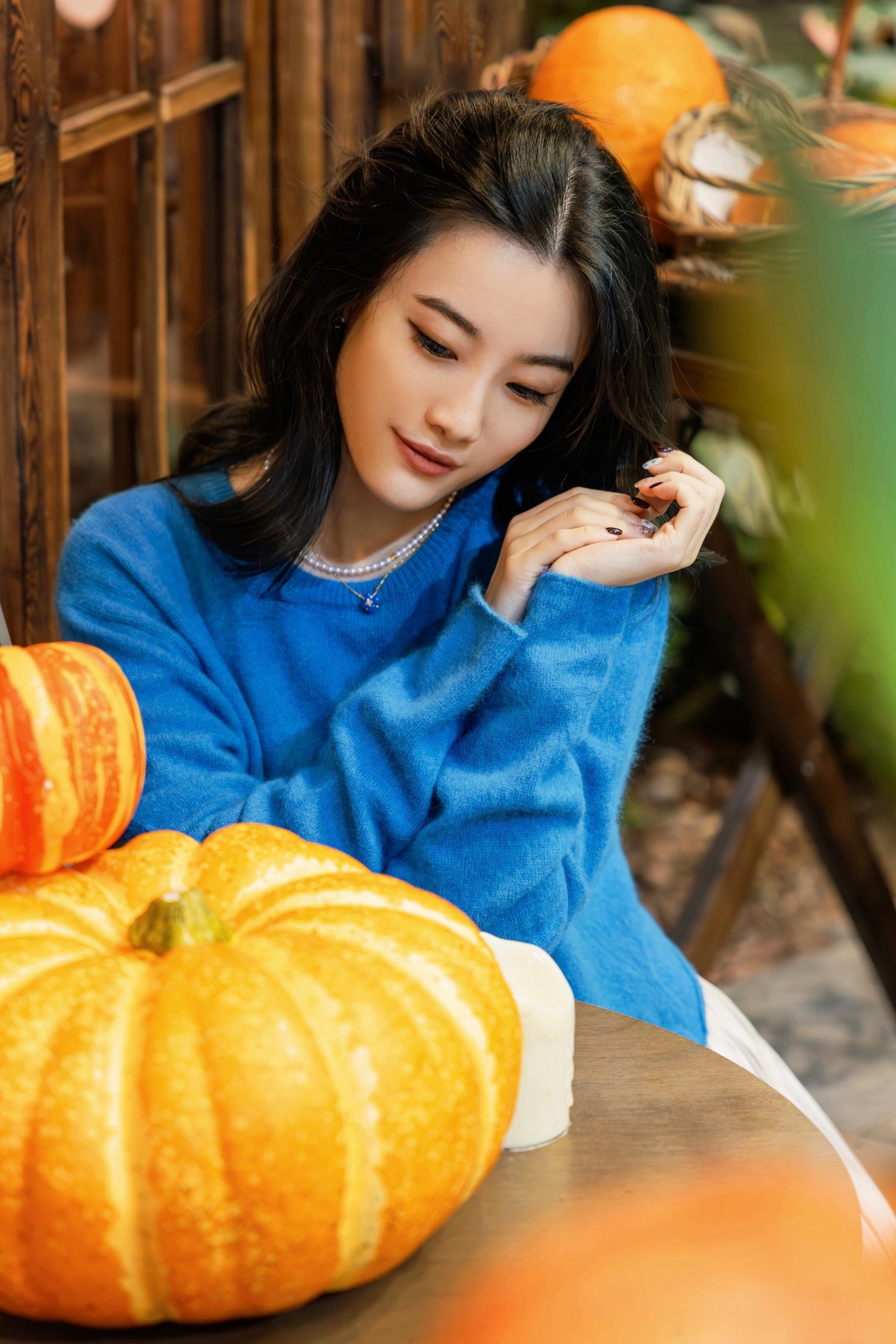 这件蓝色毛衣和万圣节南瓜真是配一脸✌️