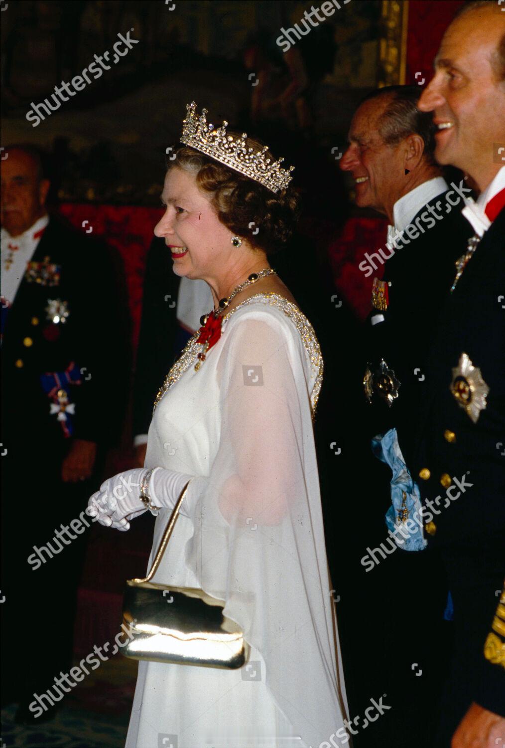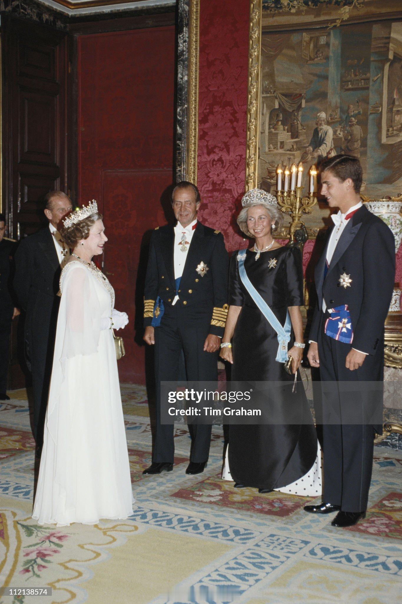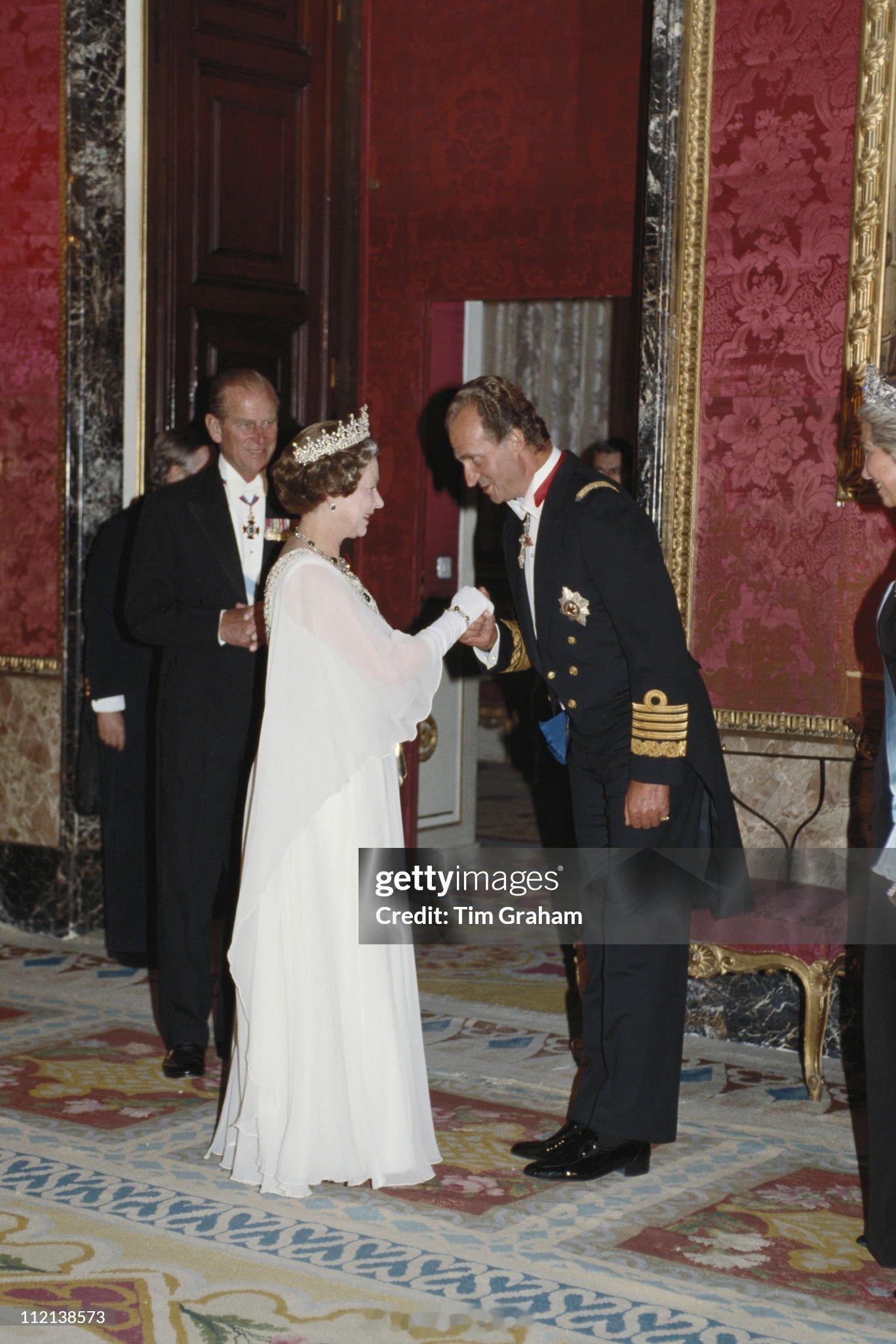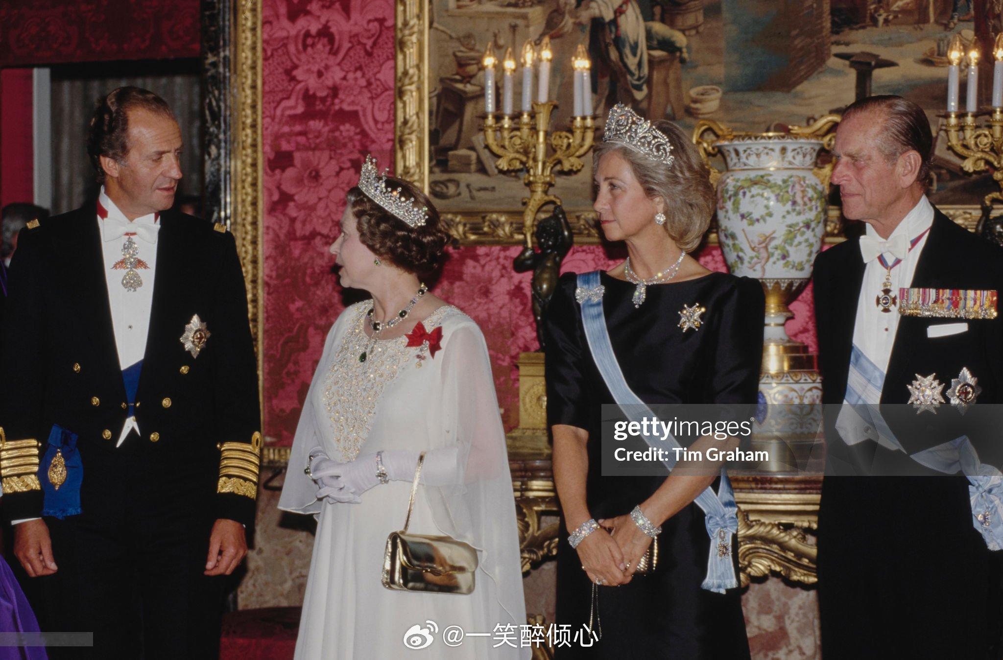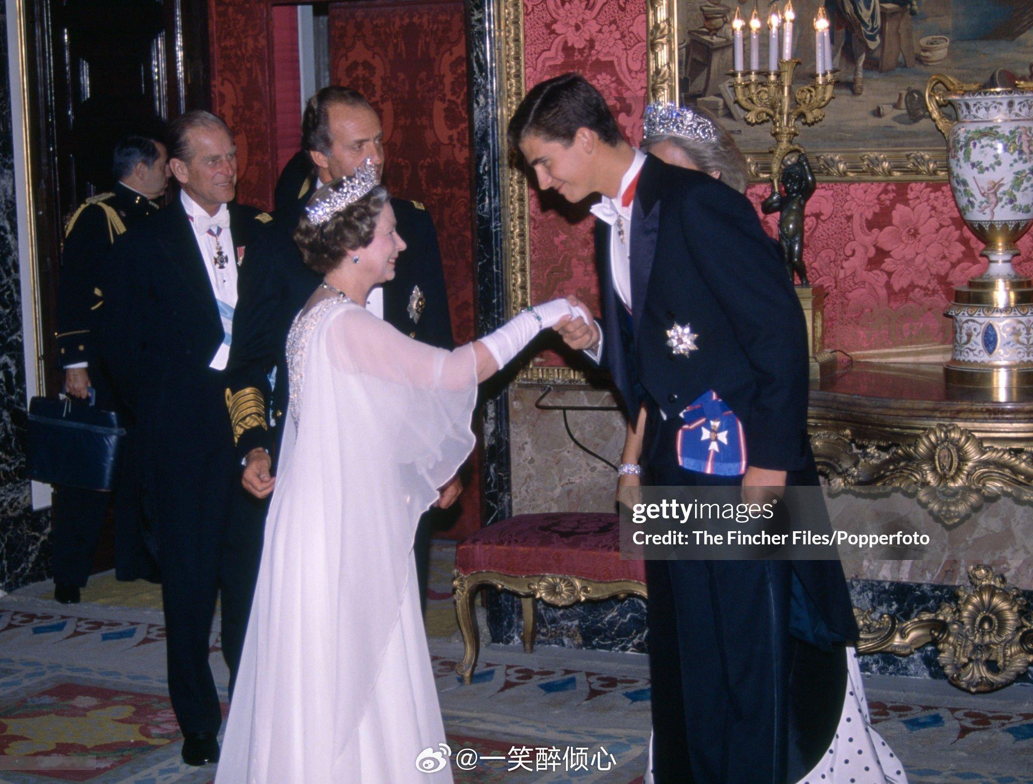 【补图】1988年10月18日,伊丽莎白二世女王和爱丁堡公爵菲利普亲王在西班牙马德里出席国宴🇪🇸还可以看到年轻的费利佩那时候佩戴的是伊丽莎白二世女王赠送的皇家维多利亚大十字勋章🎖️