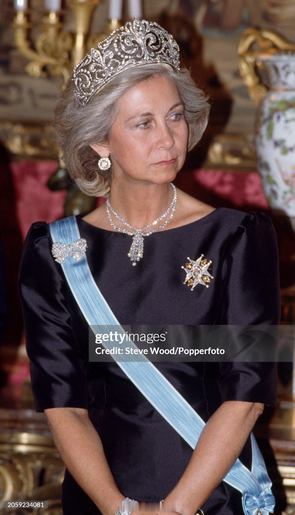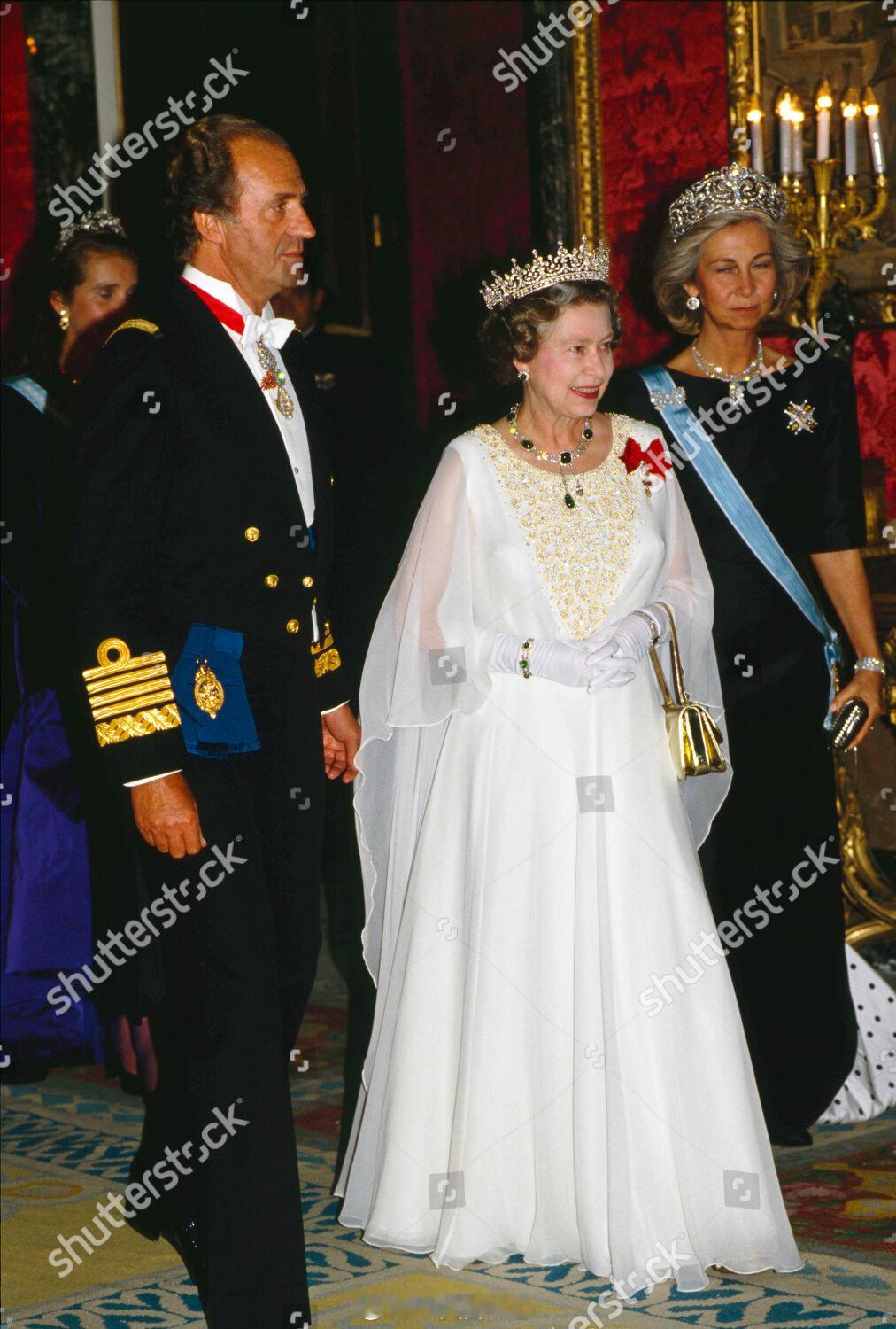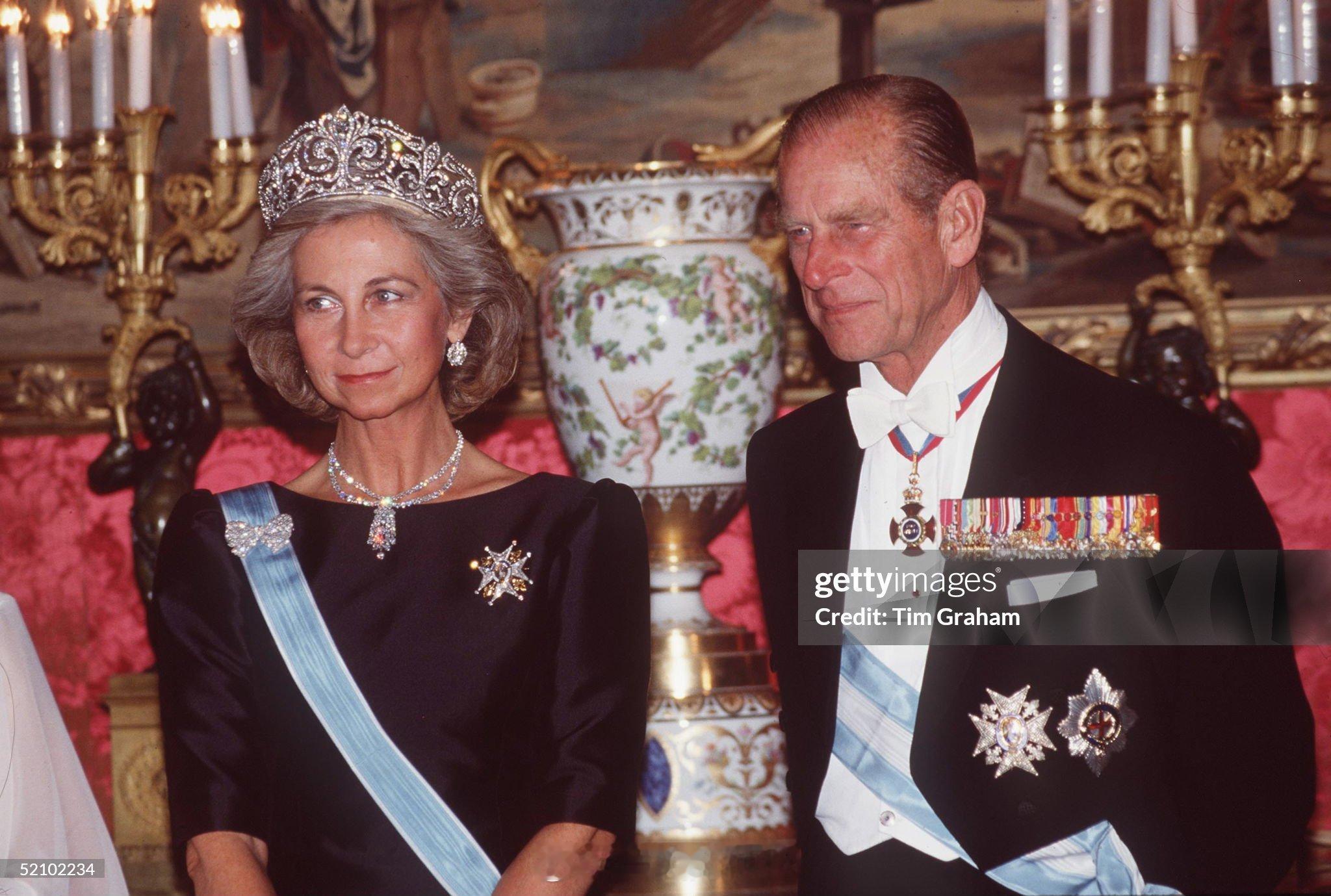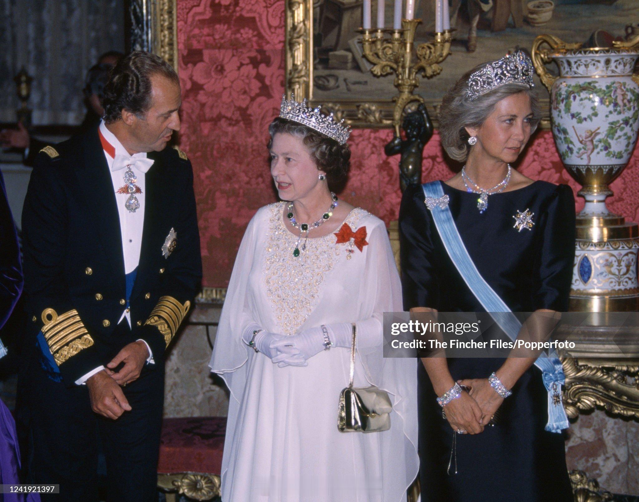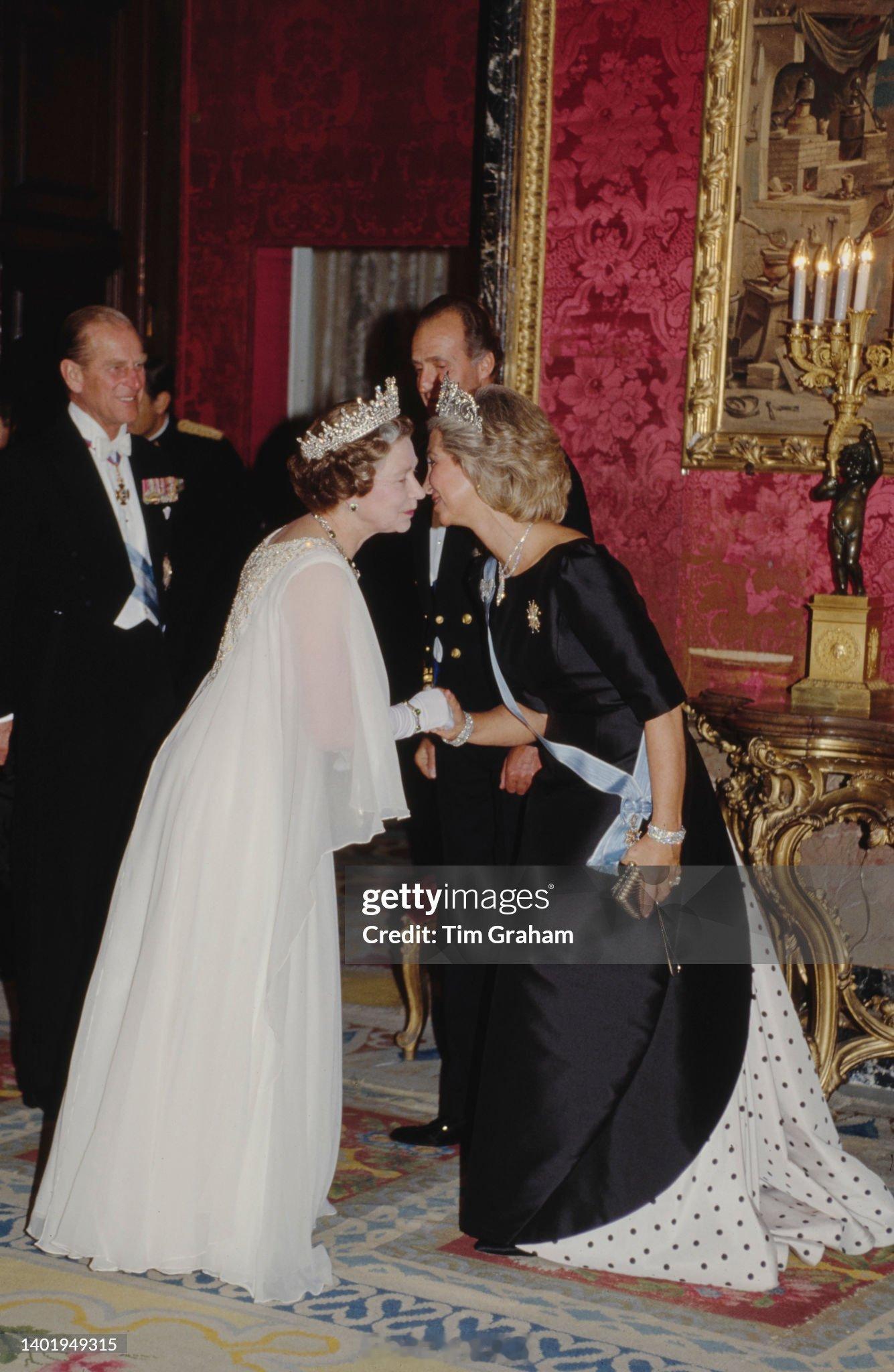 【补图】1988年10月18日,伊丽莎白二世女王和爱丁堡公爵菲利普亲王在西班牙马德里出席国宴🇪🇸还可以看到年轻的费利佩那时候佩戴的是伊丽莎白二世女王赠送的皇家维多利亚大十字勋章🎖️