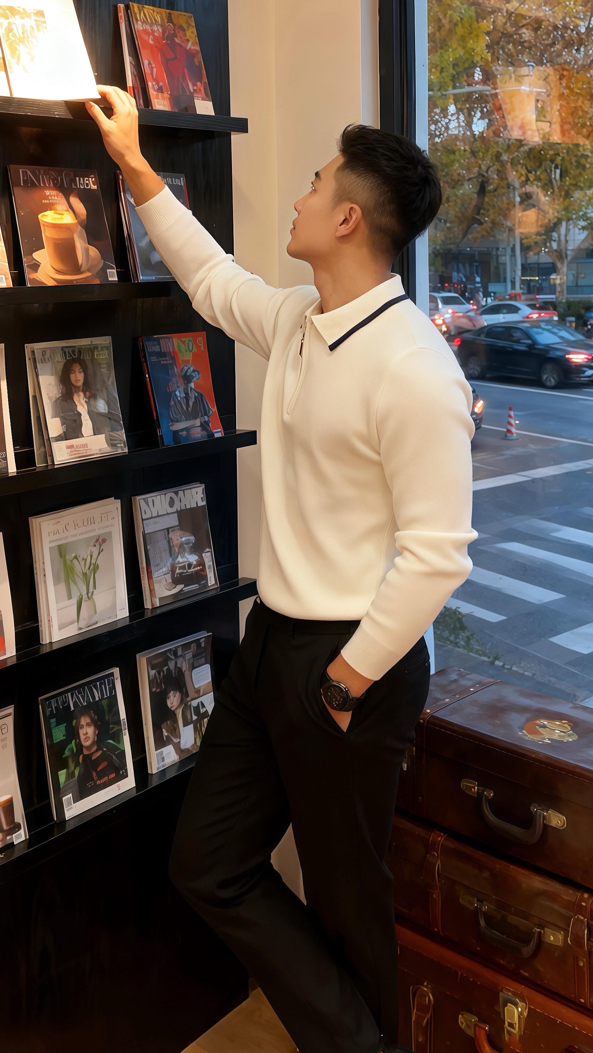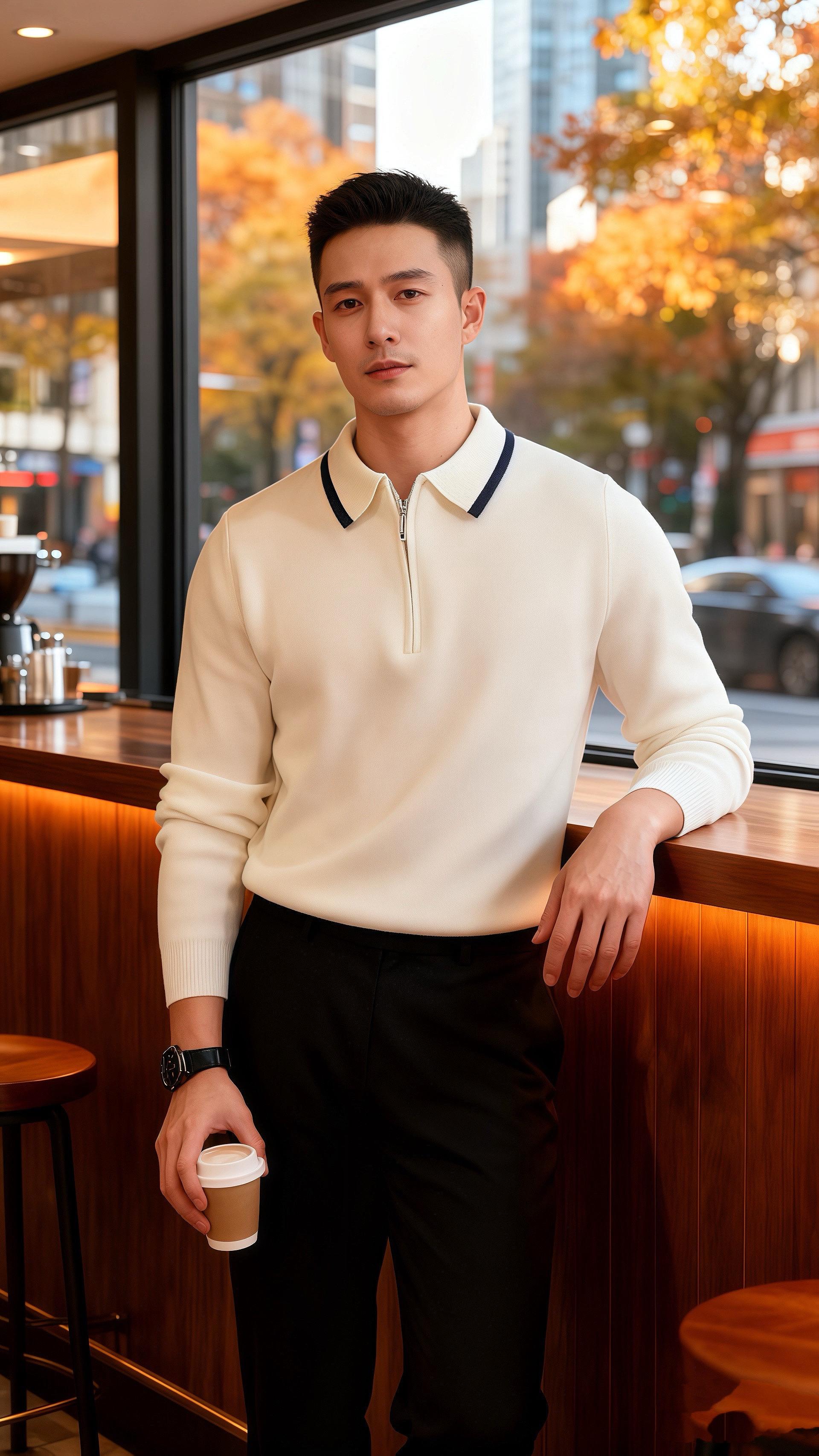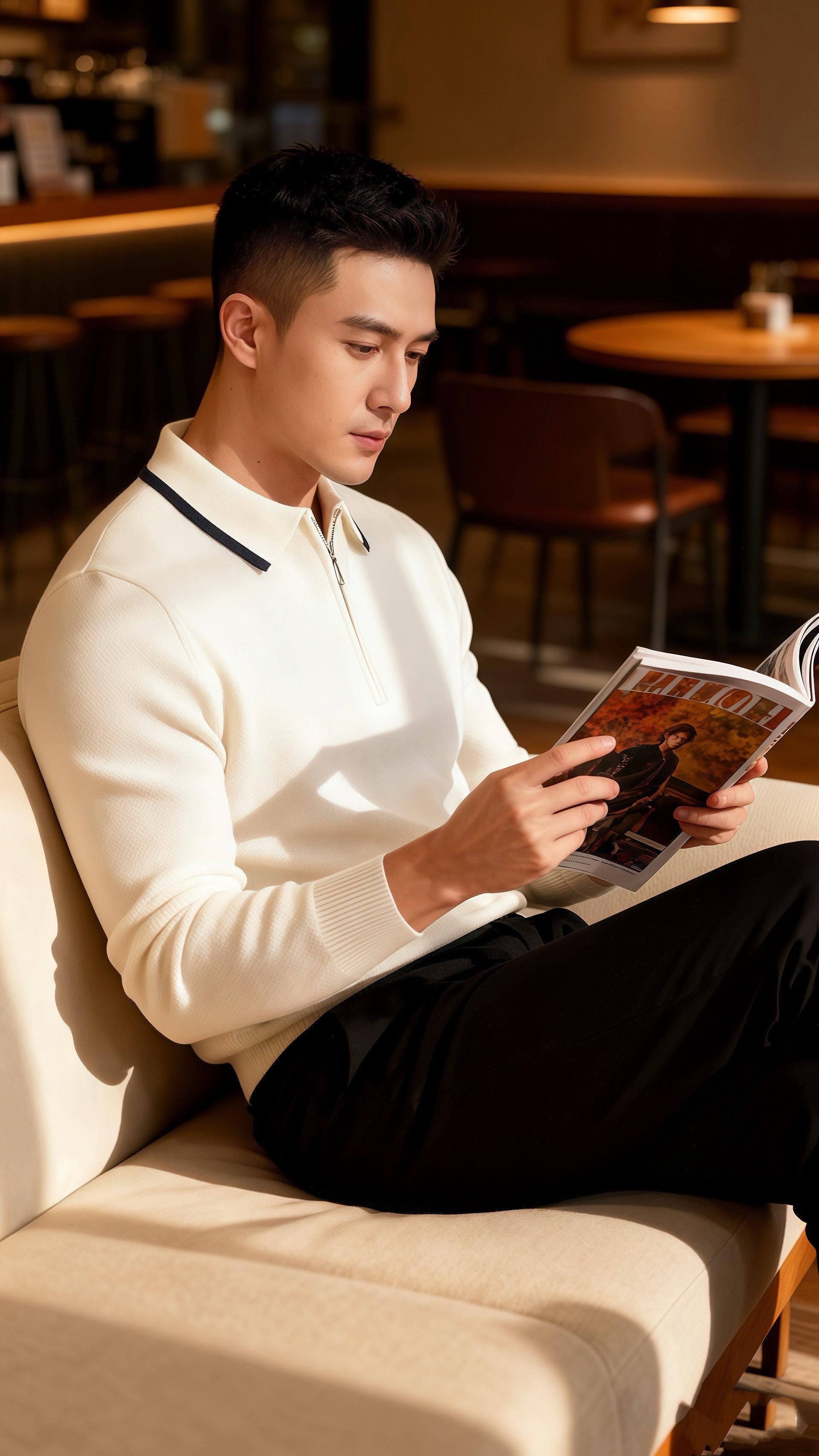 秋日午后的咖啡馆里,许妍推门时撞进一束暖光——皓明正歪在沙发里翻杂志,米白针织Polo的藏青领边衬得他下颌线清利,袖口的罗纹裹着腕骨,像被阳光揉软的云。
